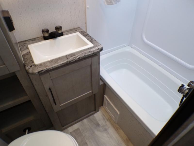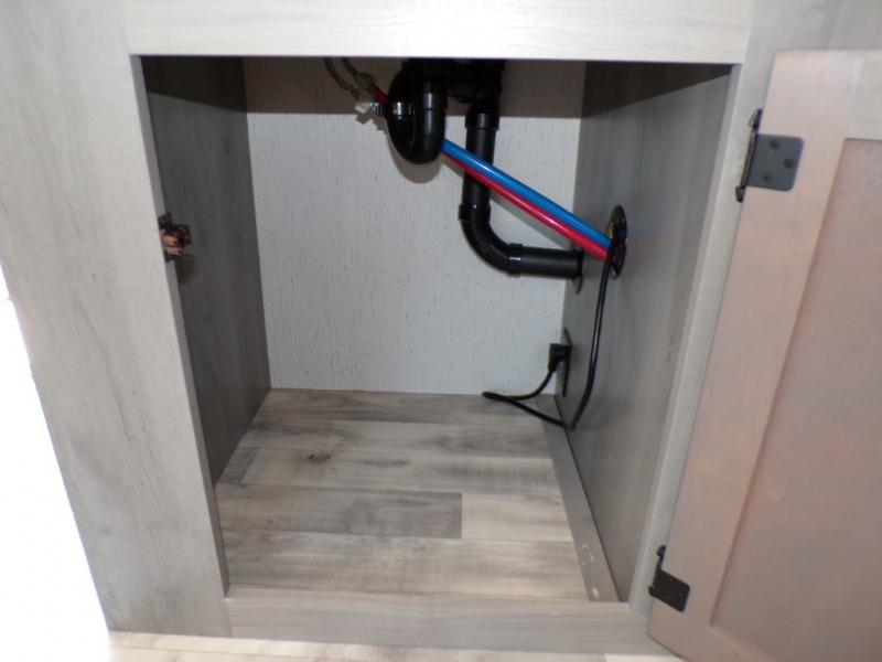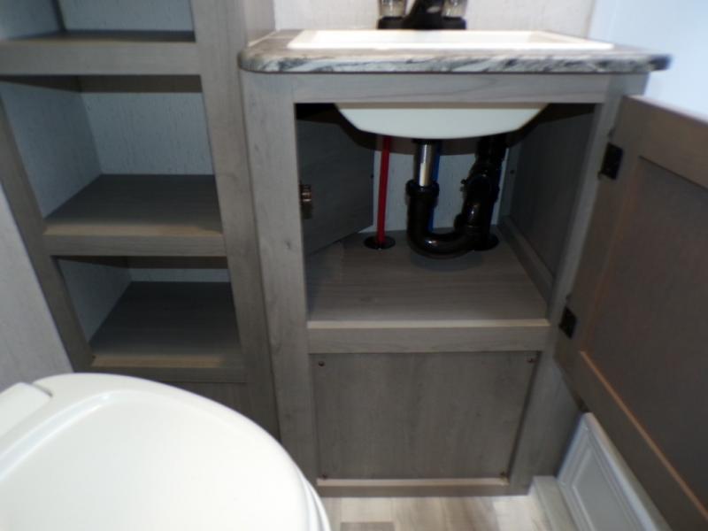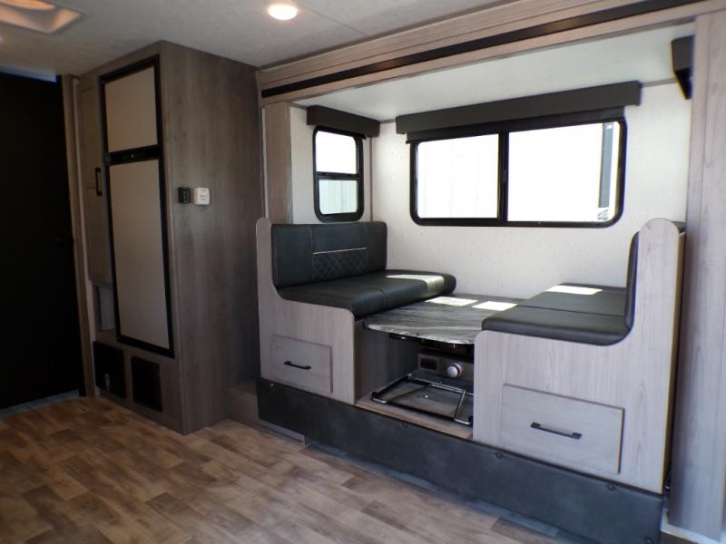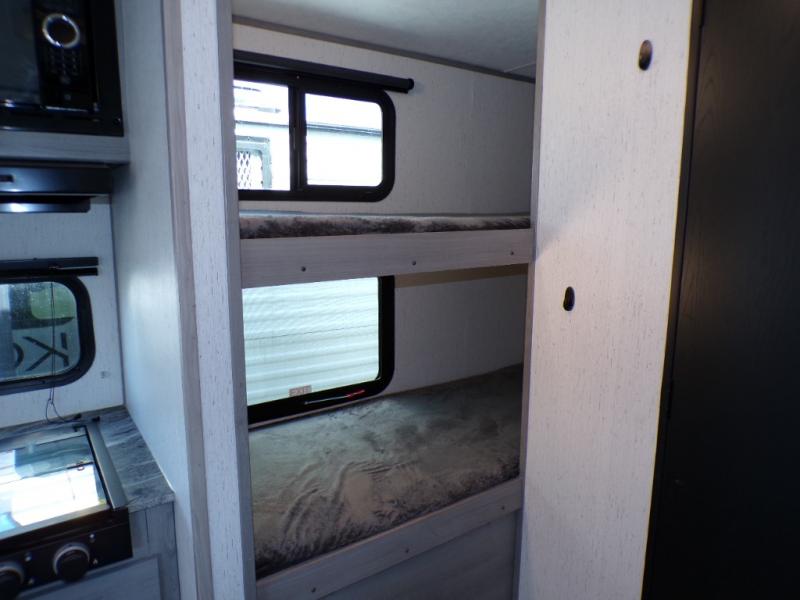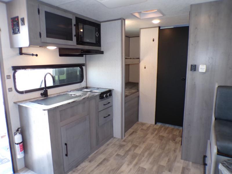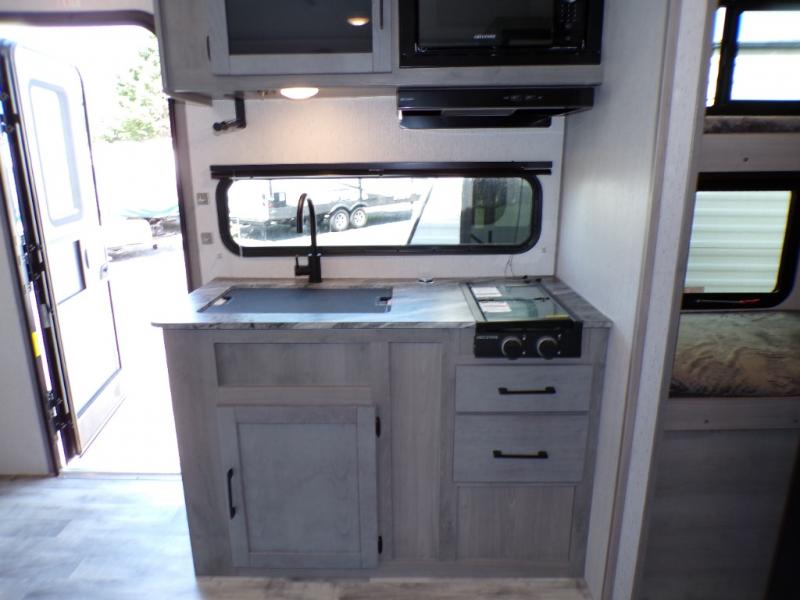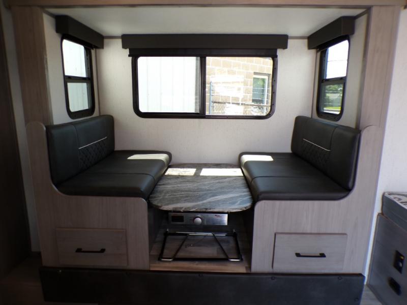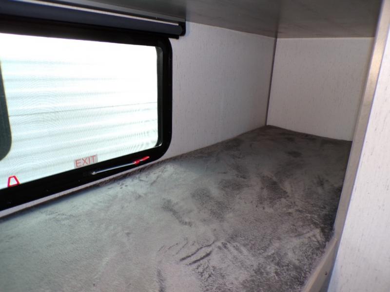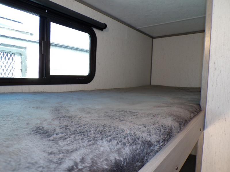 You can go camping with the whole gang in this travel trailer! The kiddos or guests can sleep on the set of bunk beds and you can sleep on the front queen bed which has USB ports to charge your electronics. Start each morning with a full belly after frying up some bacon and eggs on the two burner range with glass cover and enjoy them at the booth dinette with an indoor/outdoor table slide. You could even prepare your meals at the outdoor kitchen and breathe in some fresh air while you cook. There is also a rear corner bathroom for everyone to freshen up in with a skylight above the shower!