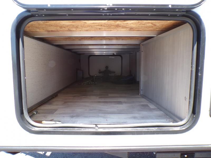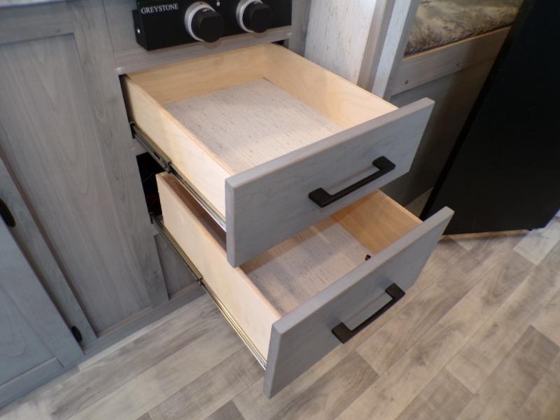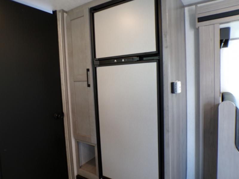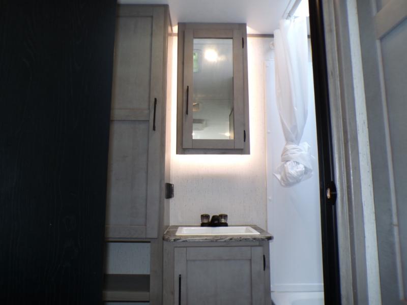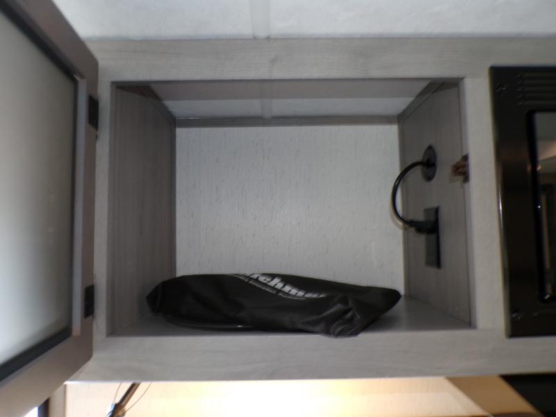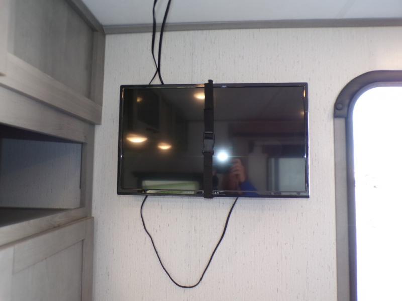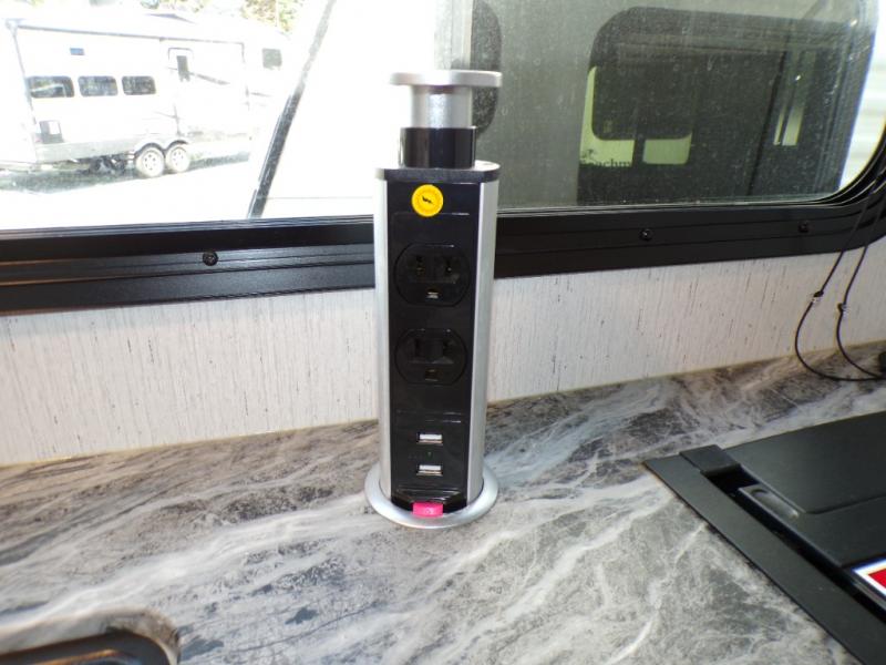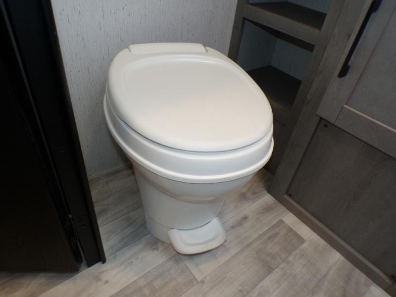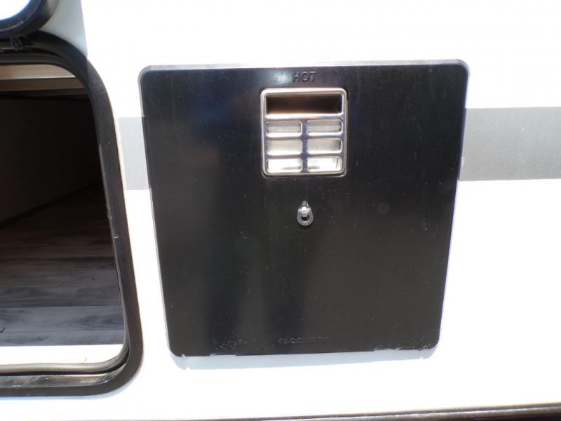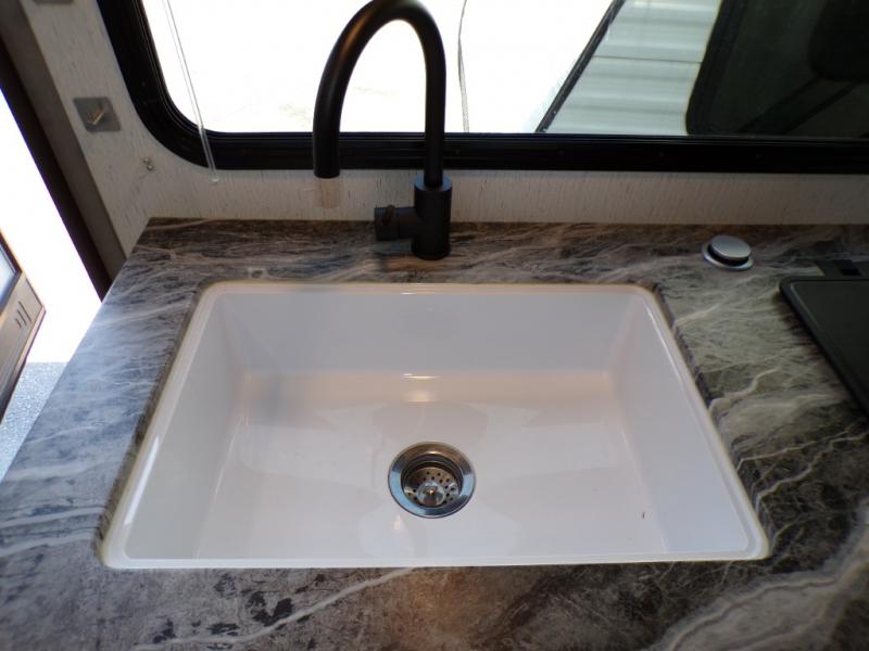 You can go camping with the whole gang in this travel trailer! The kiddos or guests can sleep on the set of bunk beds and you can sleep on the front queen bed which has USB ports to charge your electronics. Start each morning with a full belly after frying up some bacon and eggs on the two burner range with glass cover and enjoy them at the booth dinette with an indoor/outdoor table slide. You could even prepare your meals at the outdoor kitchen and breathe in some fresh air while you cook. There is also a rear corner bathroom for everyone to freshen up in with a skylight above the shower!