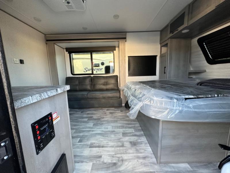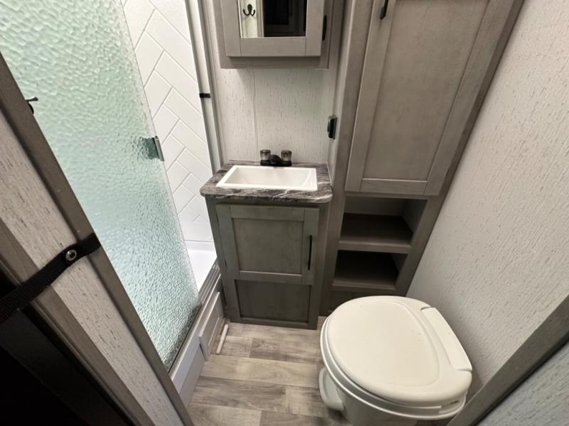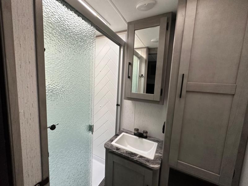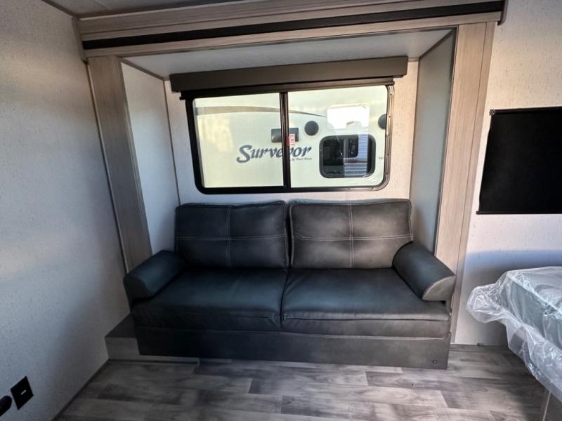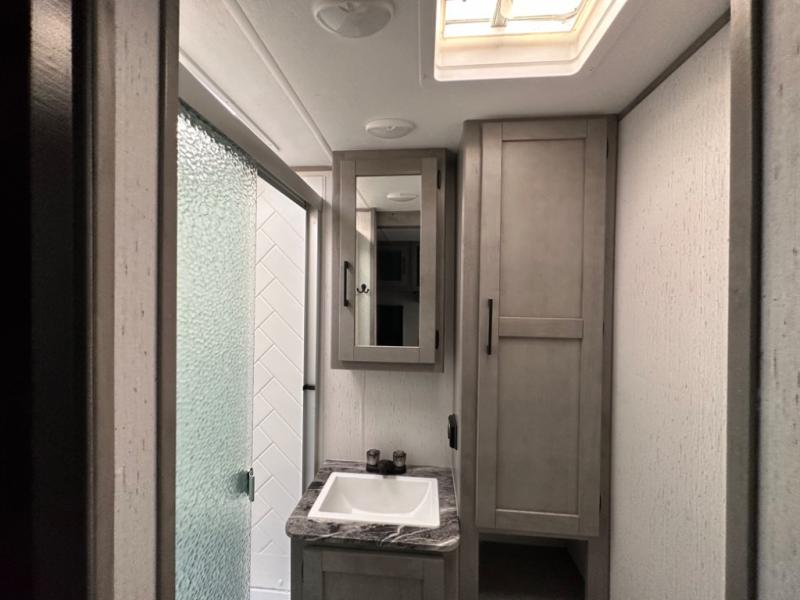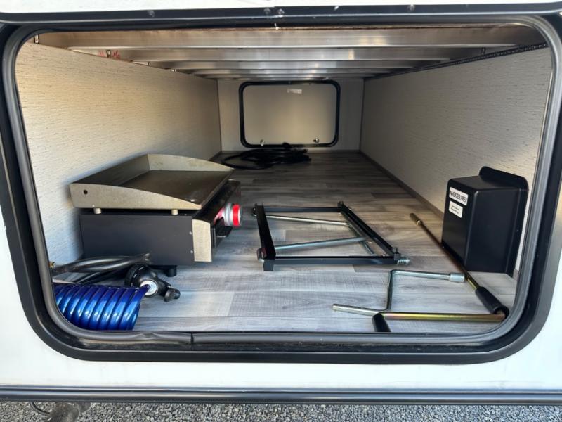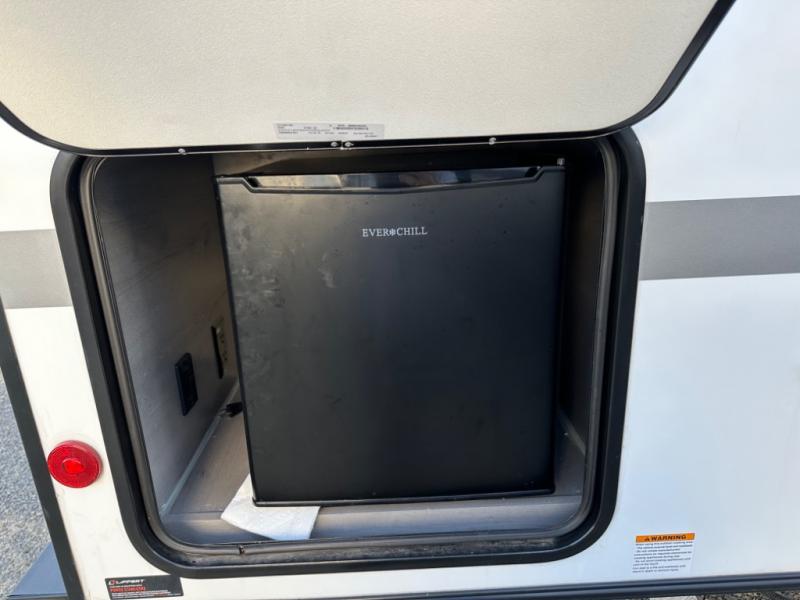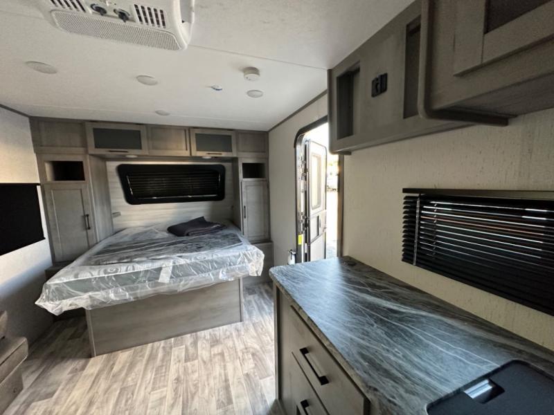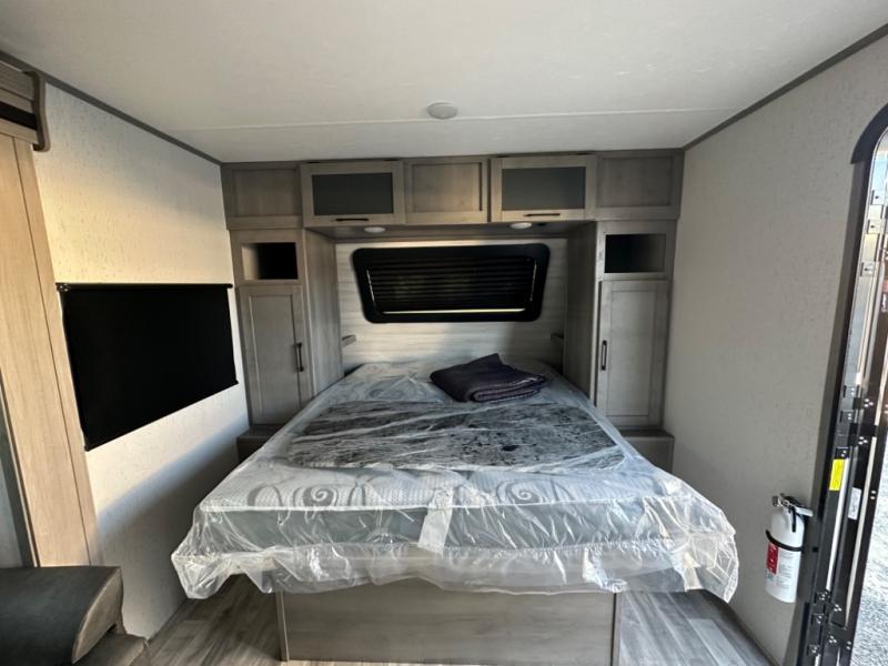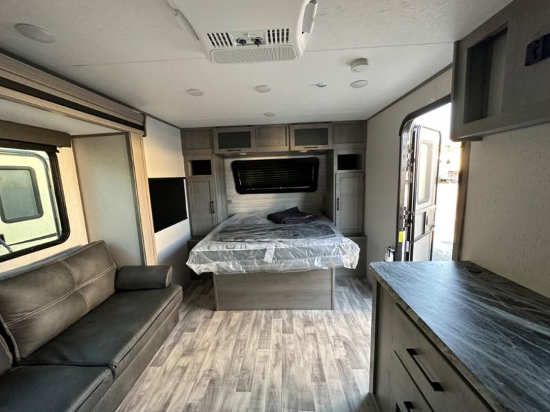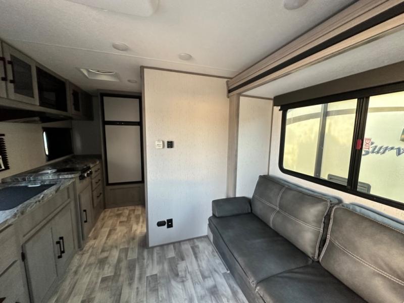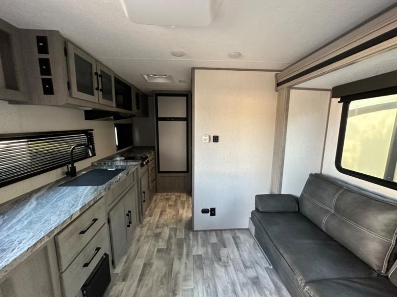 Pack your bags and hitch up this travel trailer for a fun weekend getaway! Start your mornings feeling refreshed after sleeping on the front queen bed and clean up in the rear corner bathroom with the shower that has a skylight above it. Grab some eggs and bacon from the 6 cu. ft. stainless steel refrigerator and fry them up on the two burner range with glass cover or you can cook them at the outside griddle while breathing in some fresh air. The sofa has an indoor/outdoor table for extra versatility. Store all of your outdoor gear in the exterior pass-through storage!