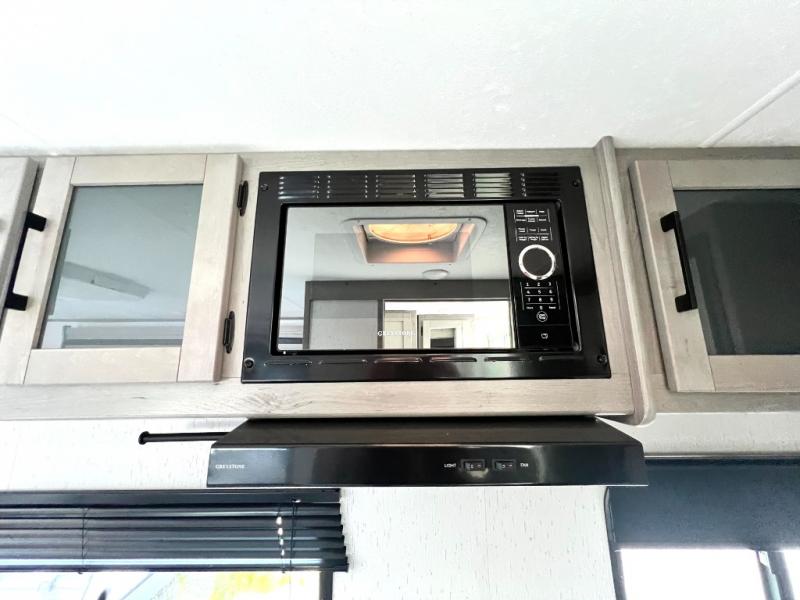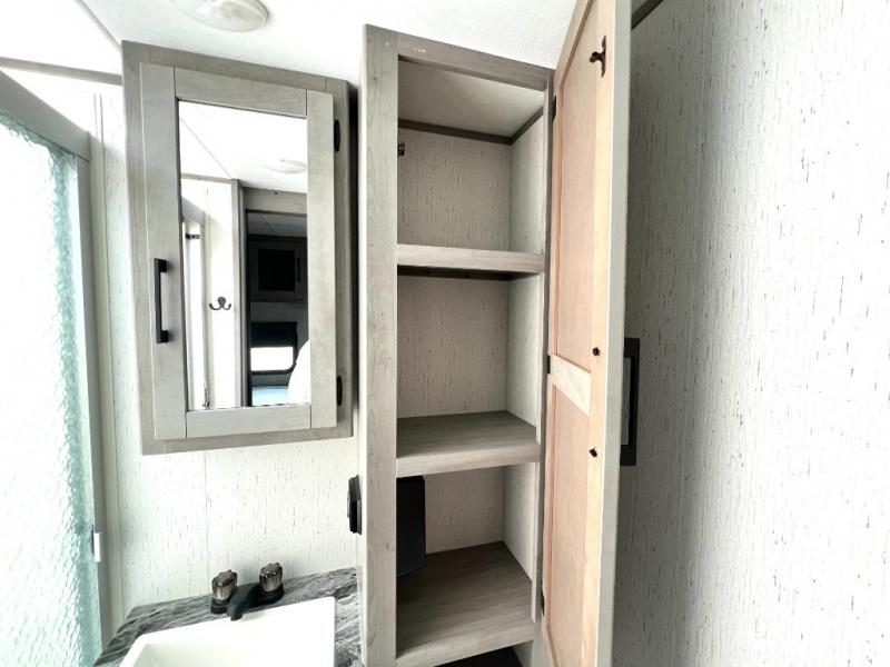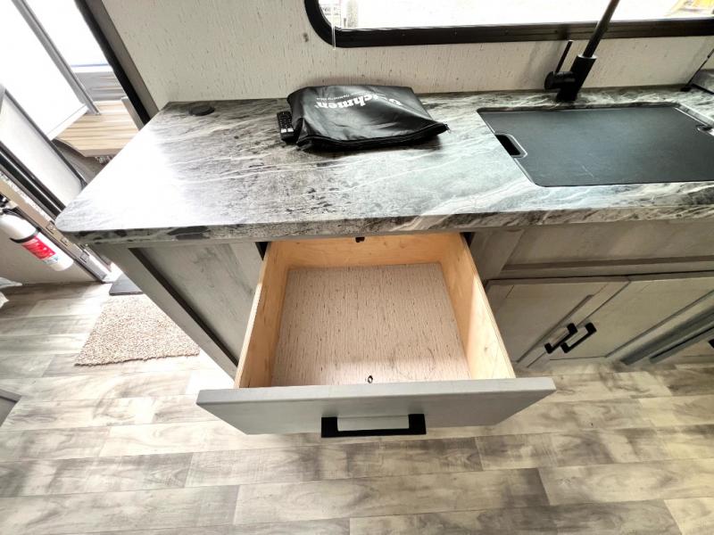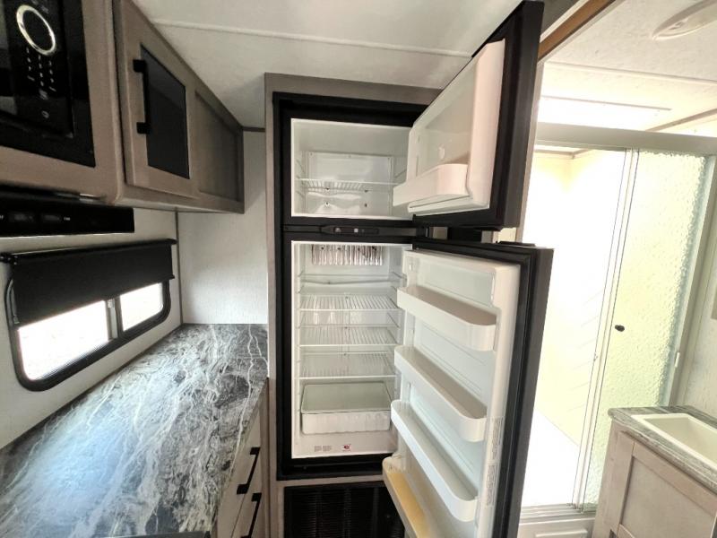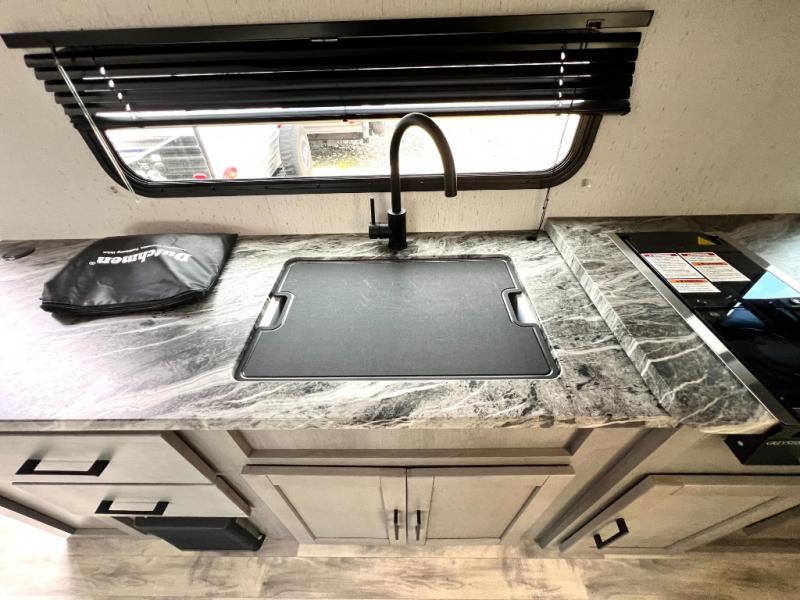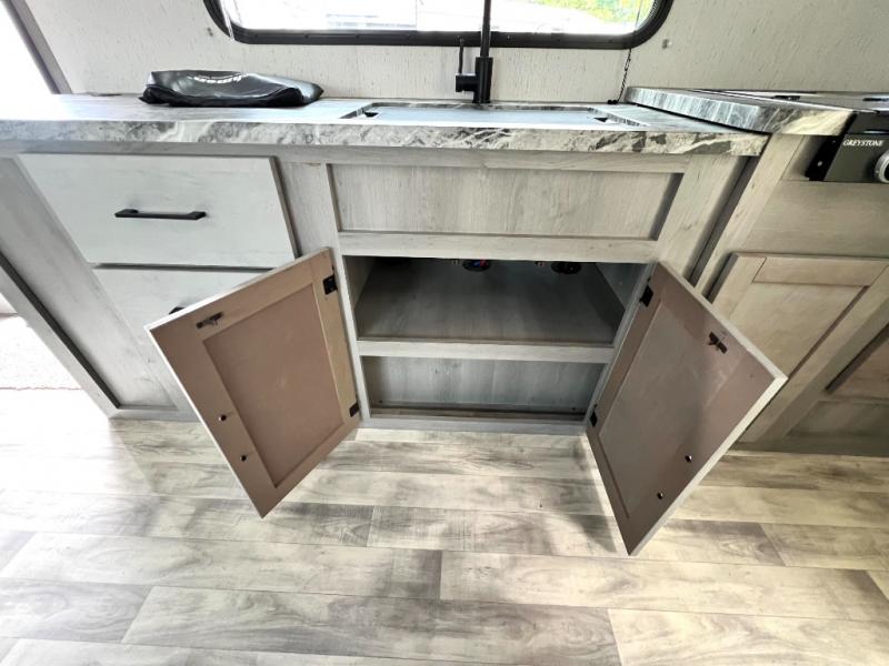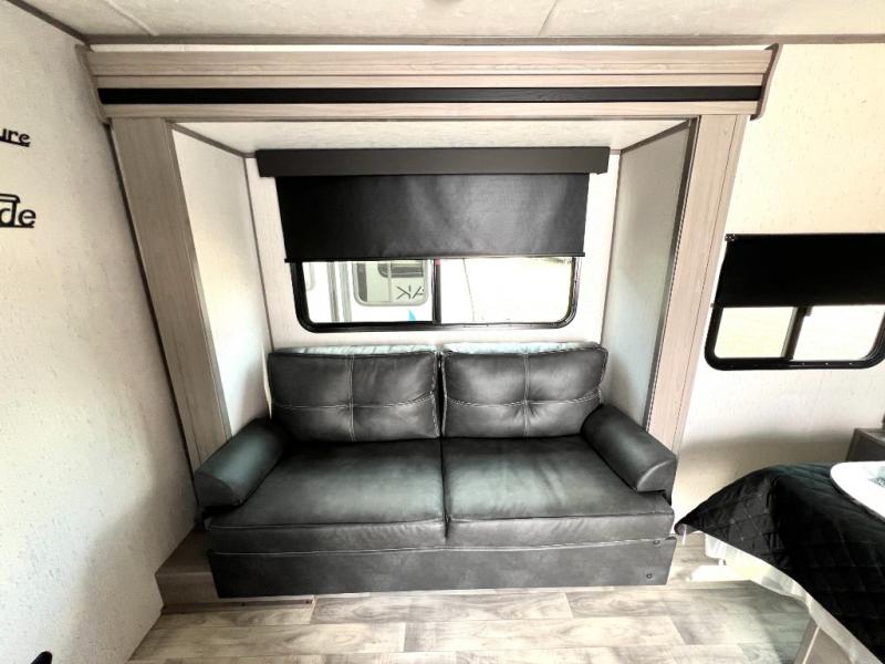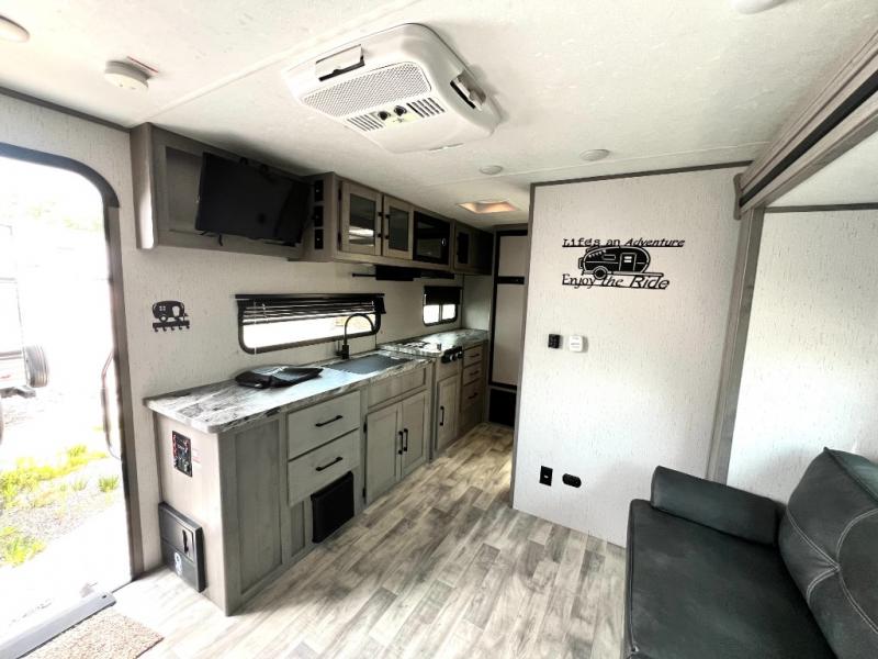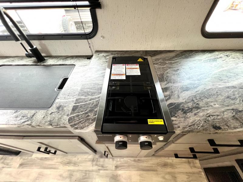 Pack your bags and hitch up this travel trailer for a fun weekend getaway! Start your mornings feeling refreshed after sleeping on the front queen bed and clean up in the rear corner bathroom with the shower that has a skylight above it. Grab some eggs and bacon from the 6 cu. ft. stainless steel refrigerator and fry them up on the two burner range with glass cover or you can cook them at the outside griddle while breathing in some fresh air. The sofa has an indoor/outdoor table for extra versatility. Store all of your outdoor gear in the exterior pass-through storage!