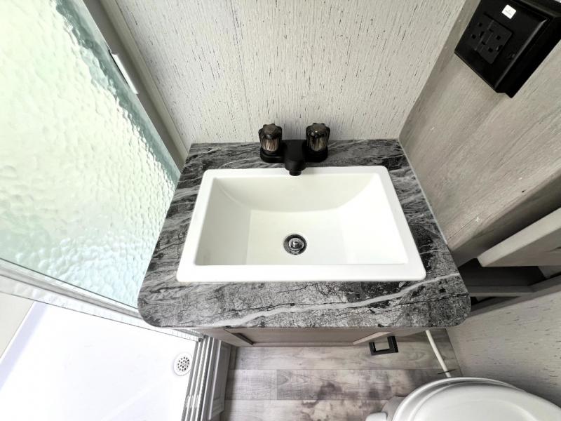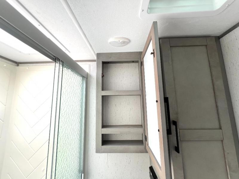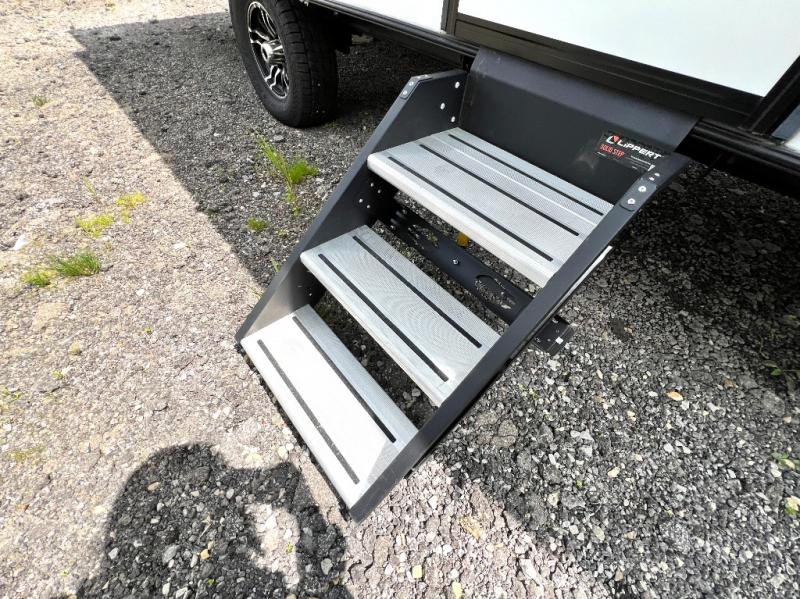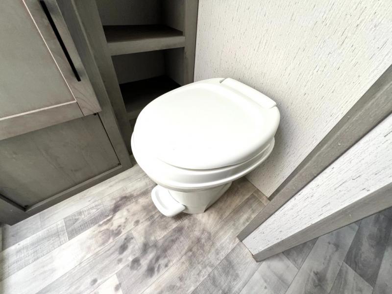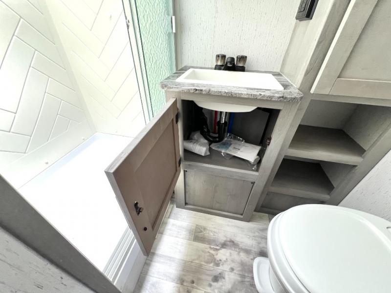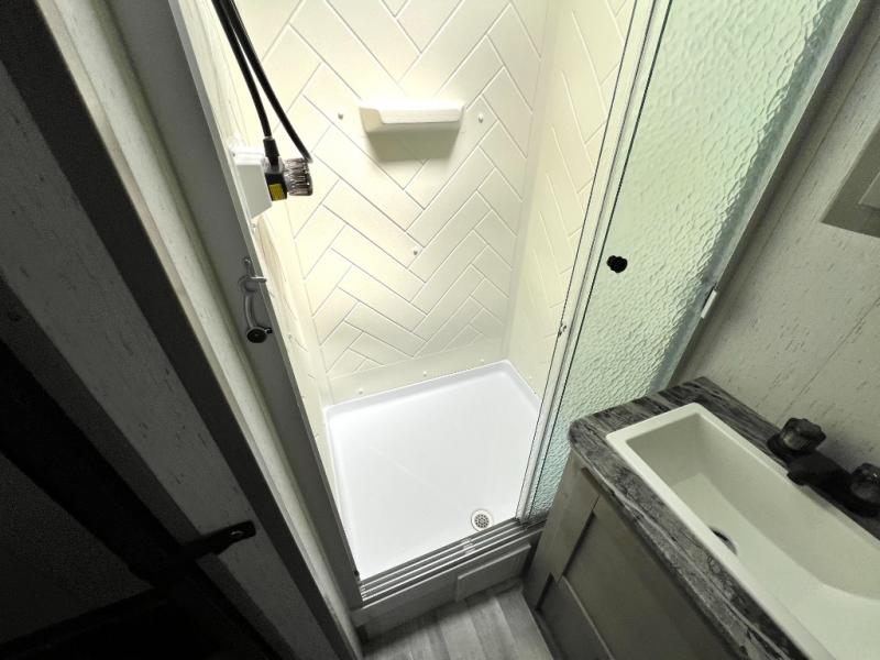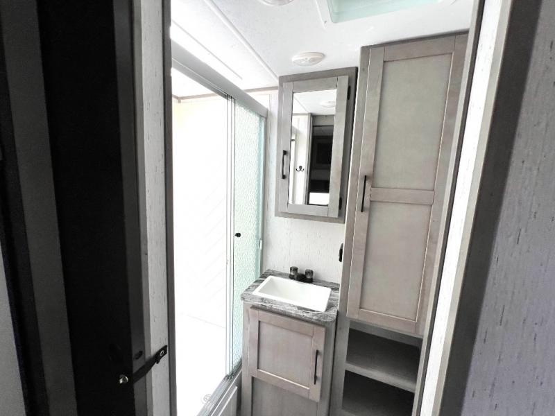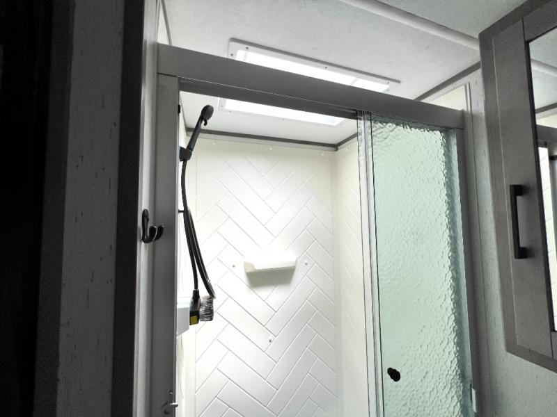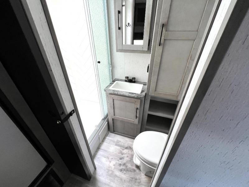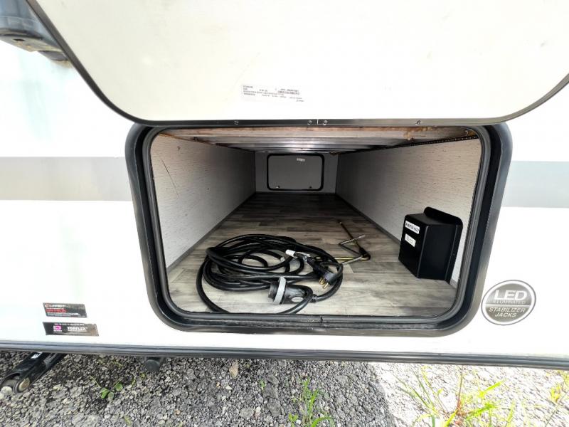 Pack your bags and hitch up this travel trailer for a fun weekend getaway! Start your mornings feeling refreshed after sleeping on the front queen bed and clean up in the rear corner bathroom with the shower that has a skylight above it. Grab some eggs and bacon from the 6 cu. ft. stainless steel refrigerator and fry them up on the two burner range with glass cover or you can cook them at the outside griddle while breathing in some fresh air. The sofa has an indoor/outdoor table for extra versatility. Store all of your outdoor gear in the exterior pass-through storage!