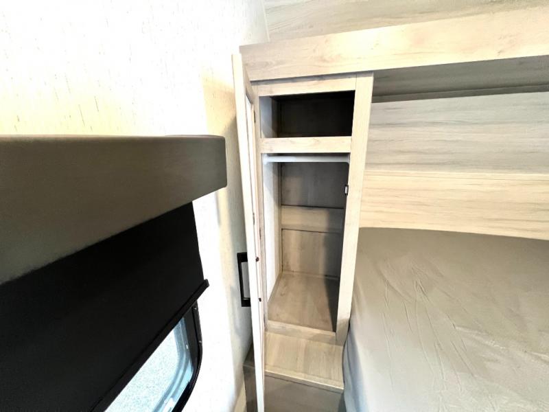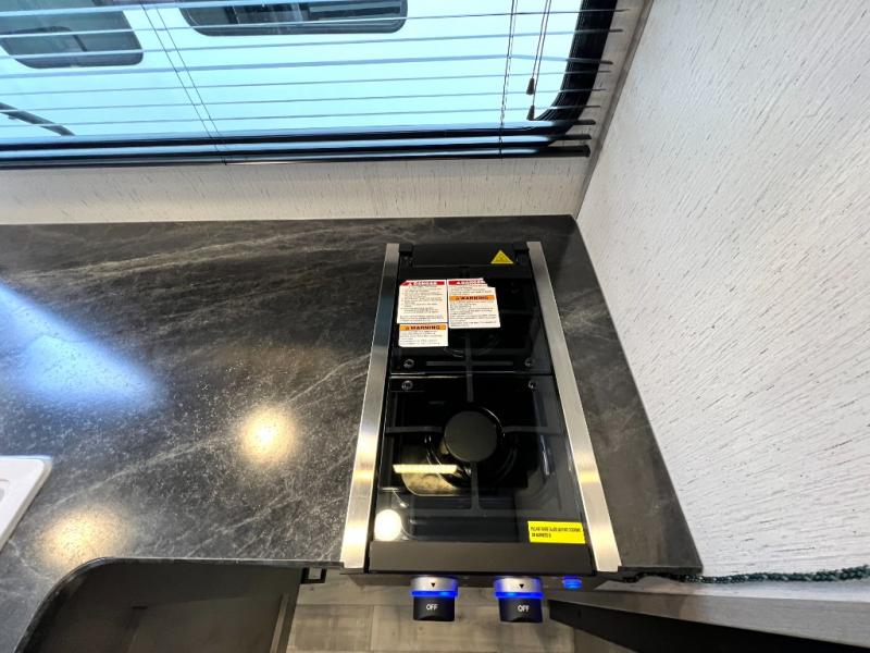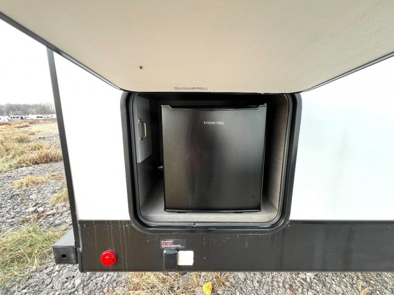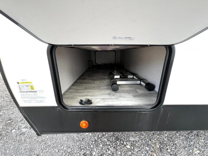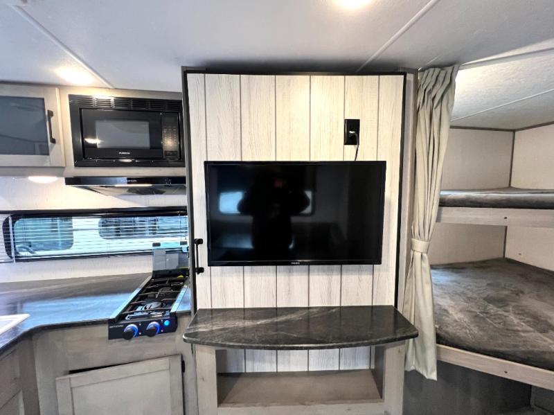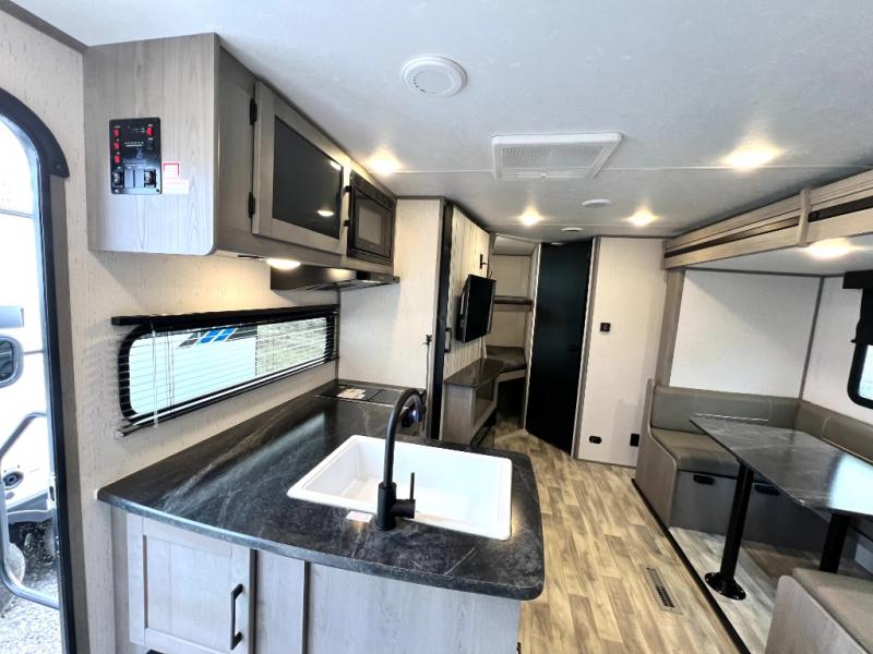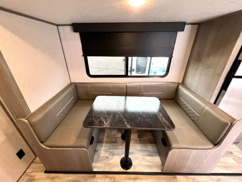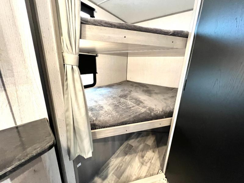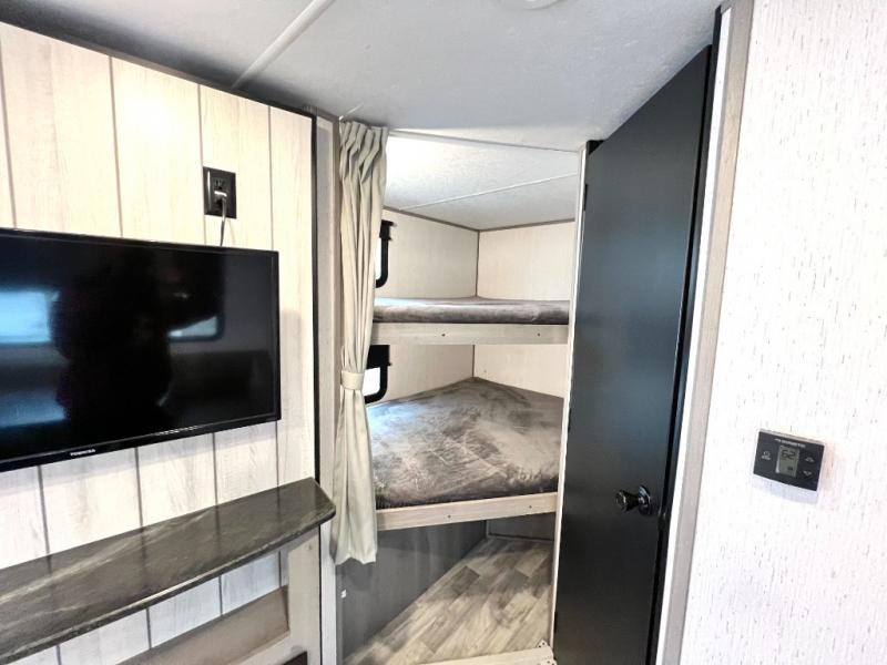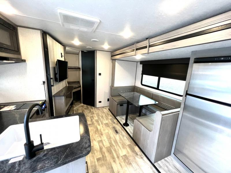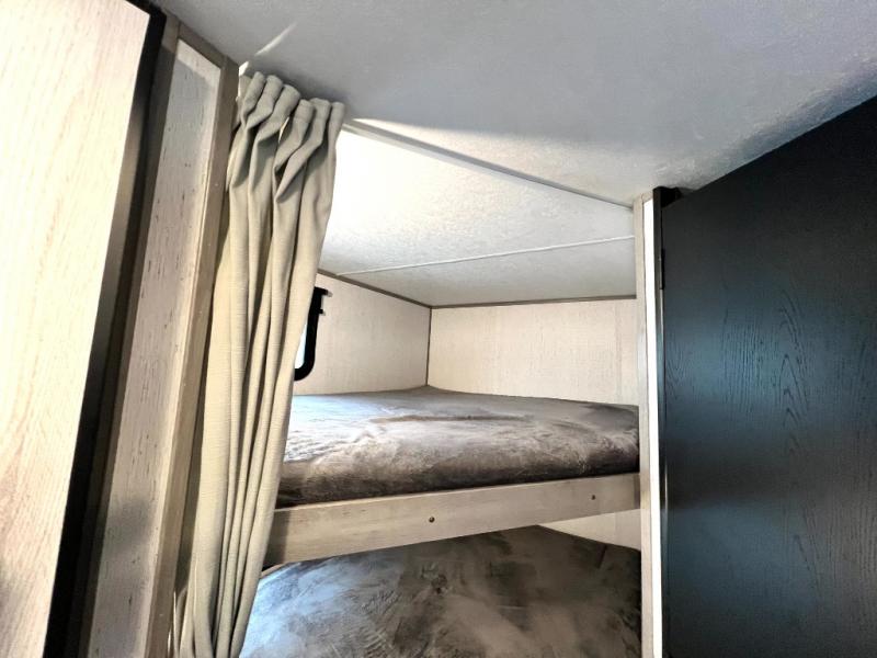 You can sleep eight happy campers in this spacious travel trailer thanks to the double-size bunks, the U-shaped dinette, and the queen bed in the front bedroom. The kitchen comes fully-equipped with a three burner cooktop, a microwave oven, and a 10 cu. ft. 12V refrigerator. Your crew can relax around the U-shaped dinette for dinner, then play a game of cards, or head outdoors to relax under the power awning with LED lights. And you'll find plenty of storage space for your belongings, including an exterior pass-through compartment!