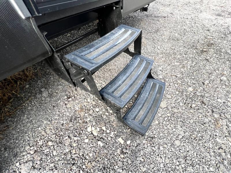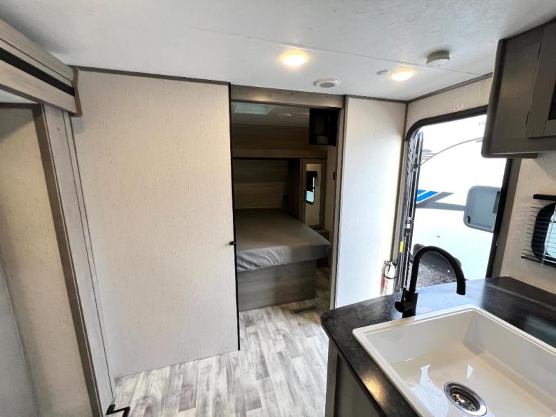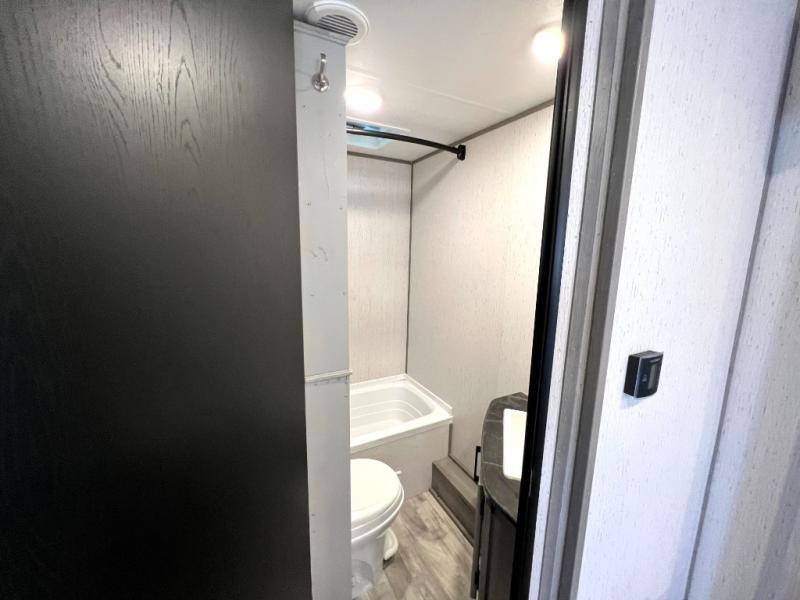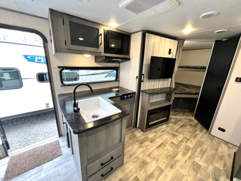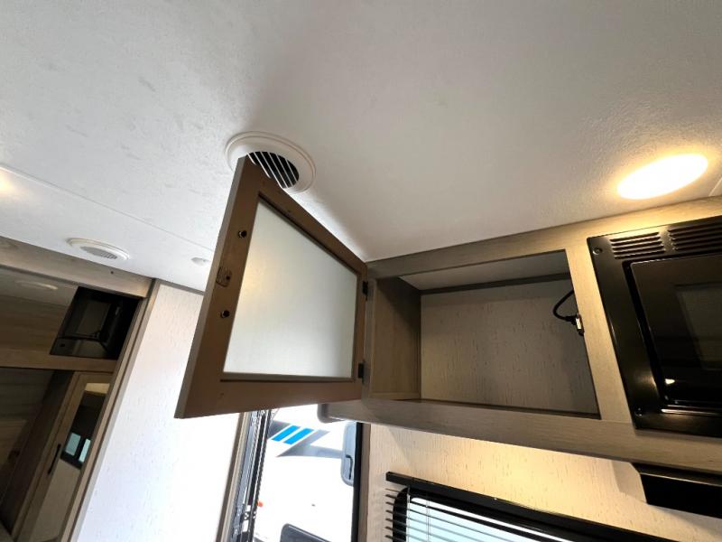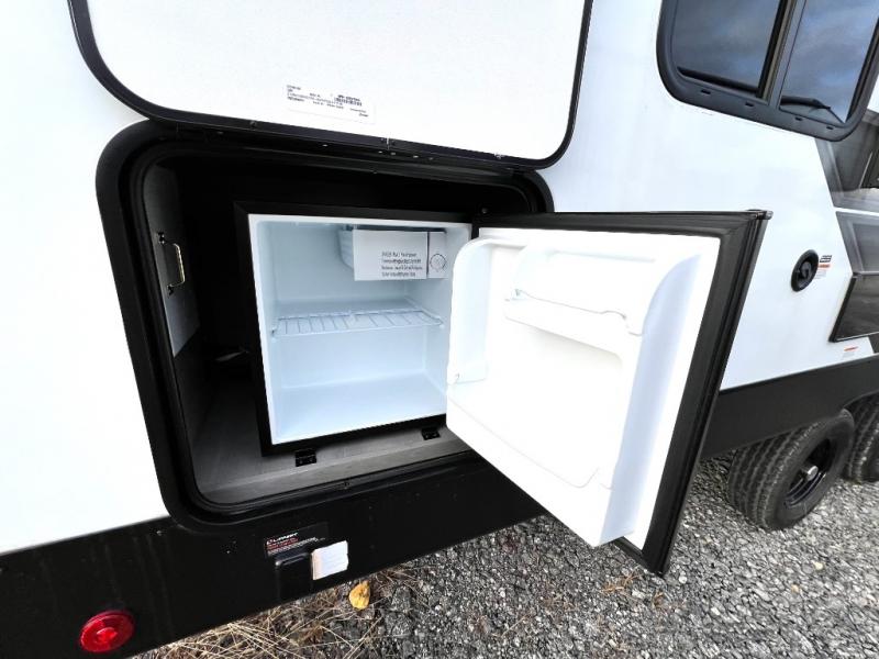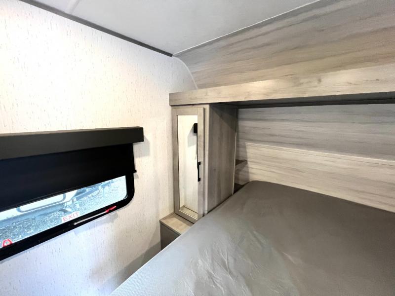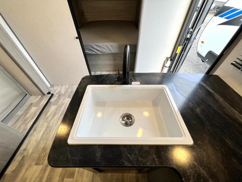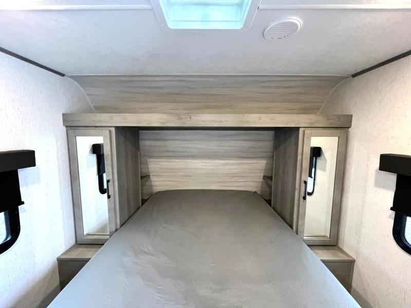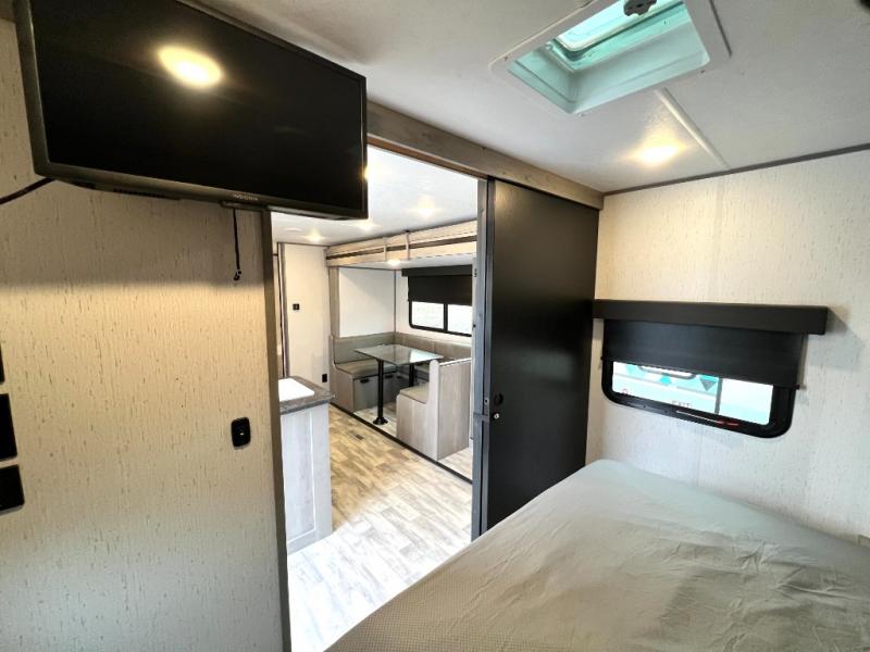You can sleep eight happy campers in this spacious travel trailer thanks to the double-size bunks, the U-shaped dinette, and the queen bed in the front bedroom. The kitchen comes fully-equipped with a three burner cooktop, a microwave oven, and a 10 cu. ft. 12V refrigerator. Your crew can relax around the U-shaped dinette for dinner, then play a game of cards, or head outdoors to relax under the power awning with LED lights. And you'll find plenty of storage space for your belongings, including an exterior pass-through compartment!