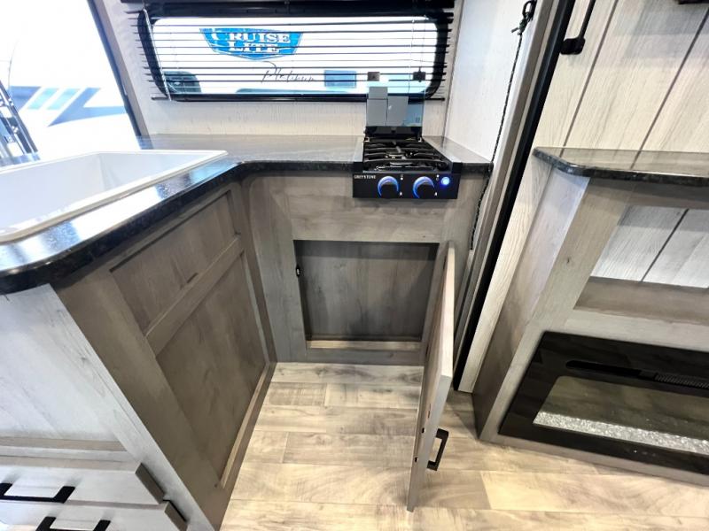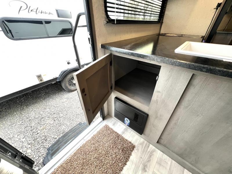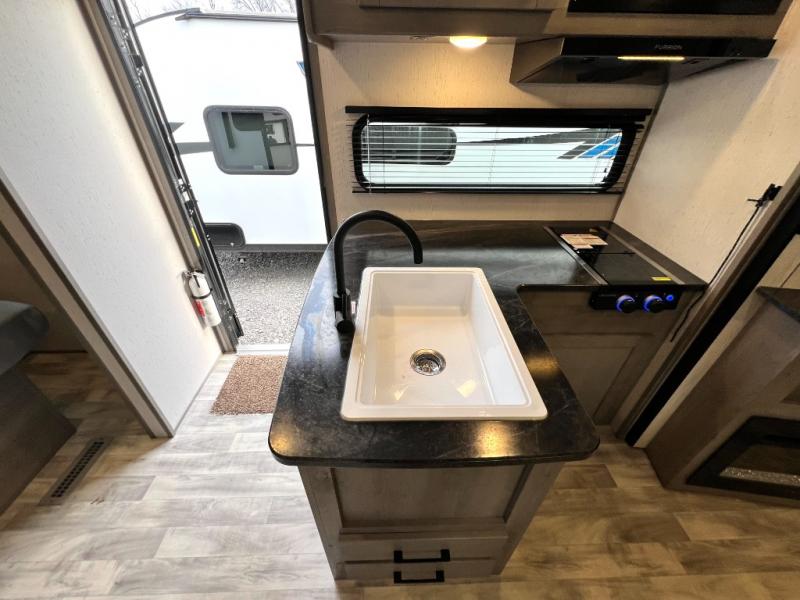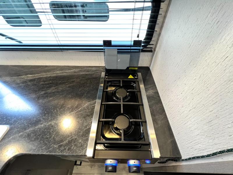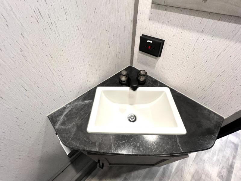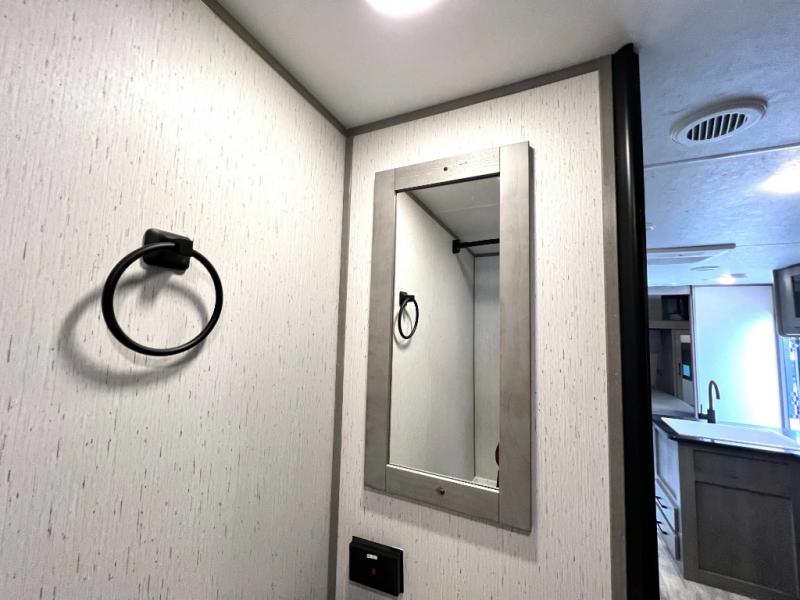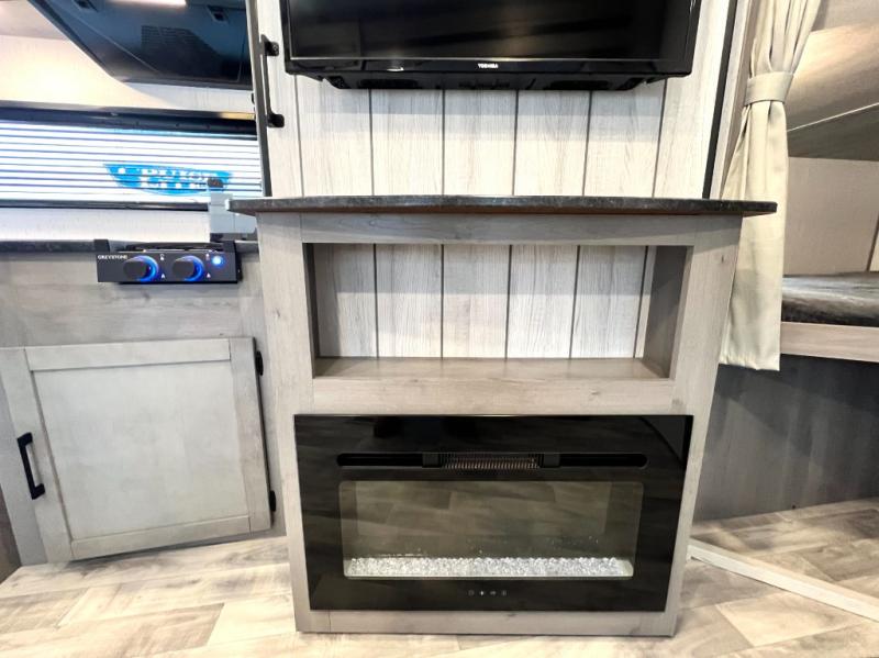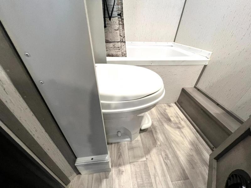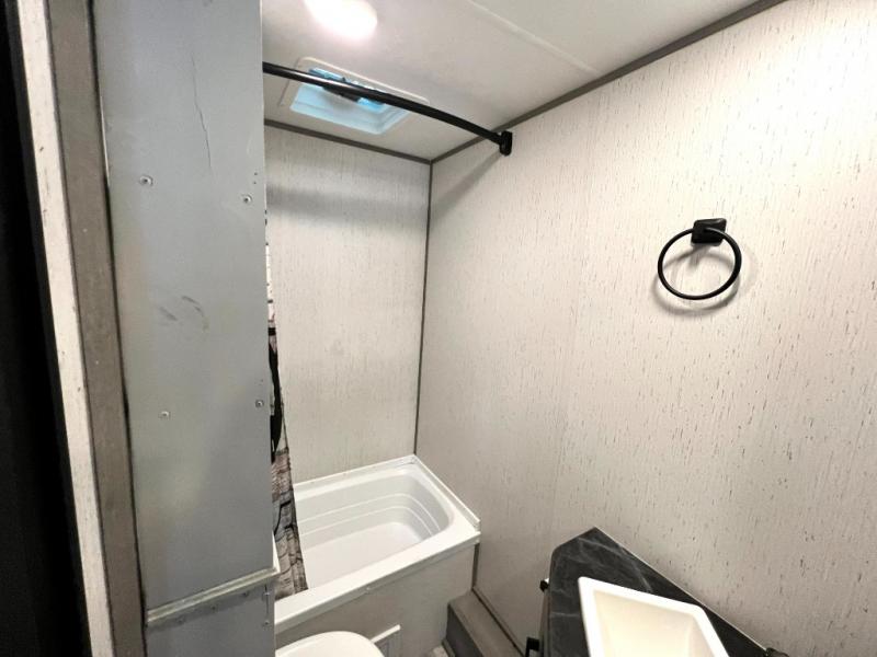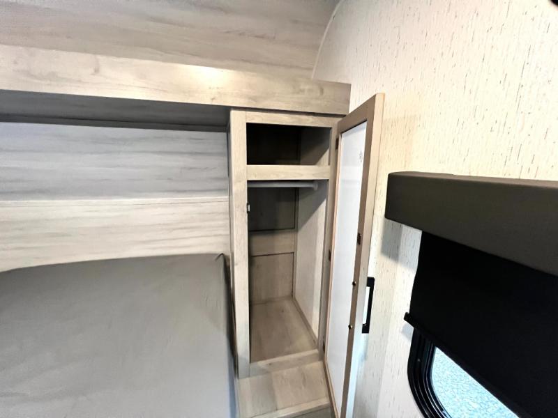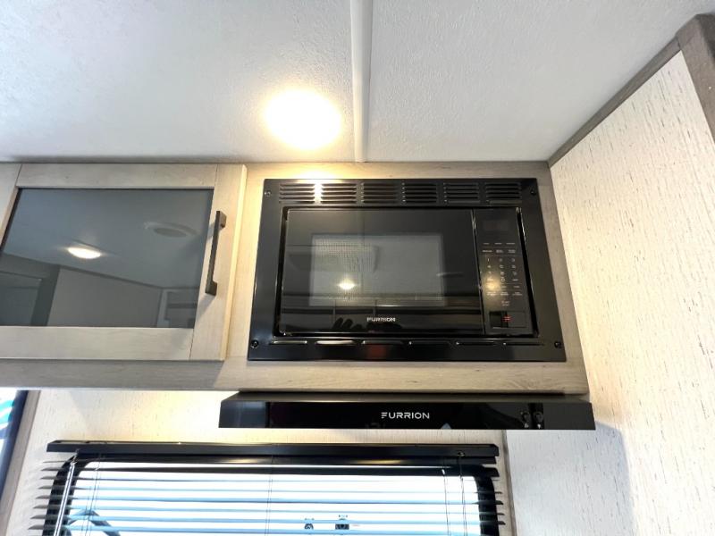 You can sleep eight happy campers in this spacious travel trailer thanks to the double-size bunks, the U-shaped dinette, and the queen bed in the front bedroom. The kitchen comes fully-equipped with a three burner cooktop, a microwave oven, and a 10 cu. ft. 12V refrigerator. Your crew can relax around the U-shaped dinette for dinner, then play a game of cards, or head outdoors to relax under the power awning with LED lights. And you'll find plenty of storage space for your belongings, including an exterior pass-through compartment!