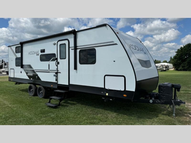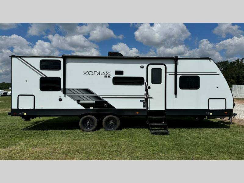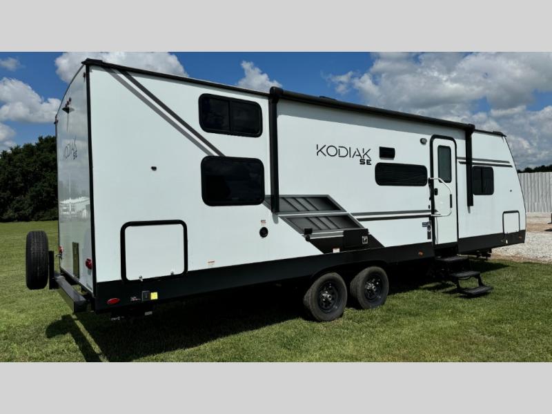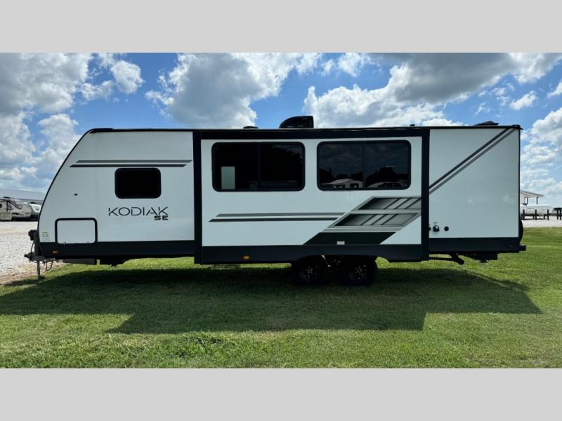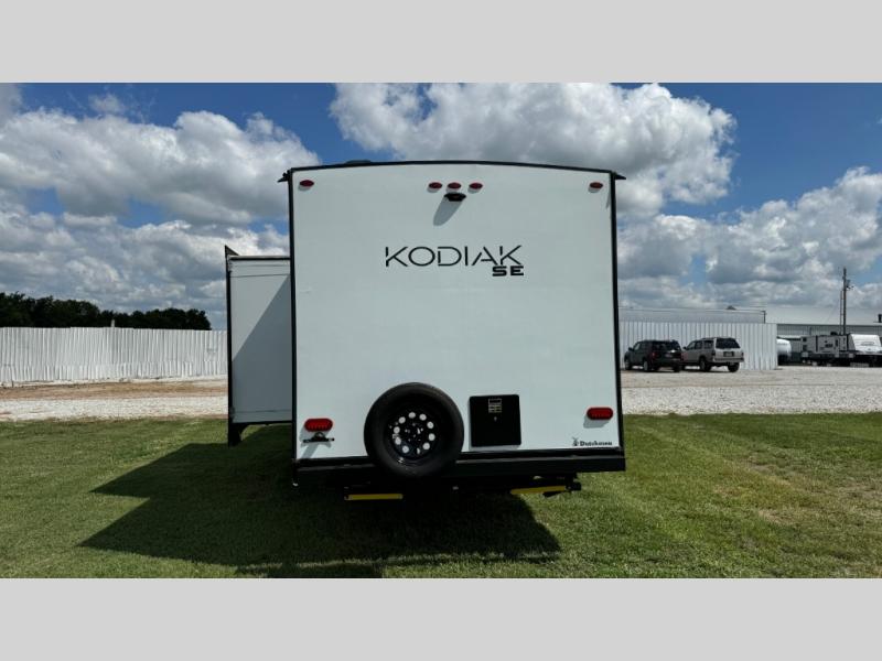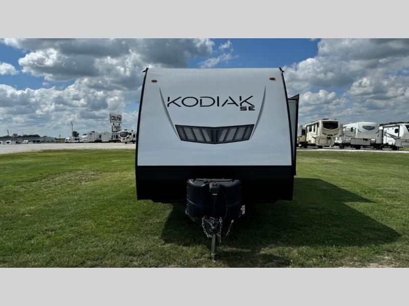 With any Kodiak SE travel trailer by Dutchmen RV, you can experience comfort while camping at a moment's notice. Each trailer includes features such as power front and rear stabilizer jacks, a power tongue jack making set-up easy, and a power awning with LED light. Each model is pet-friendly with the carpet-free slide out floor, tile flooring, and the pet leash D-ring. You can enjoy the wireless Bluetooth speaker, the LED interior and exterior lighting, and the 80" interior height. From the floor structure which includes a fully enclosed underbelly to the laminated walls with aluminum frame and block foam insulation, any Kodiak SE is built lightweight and ready for adventure!