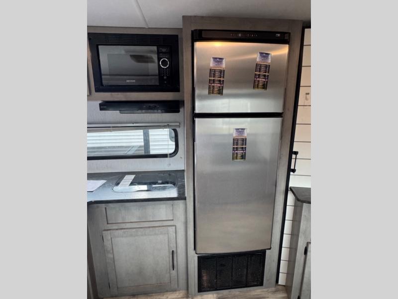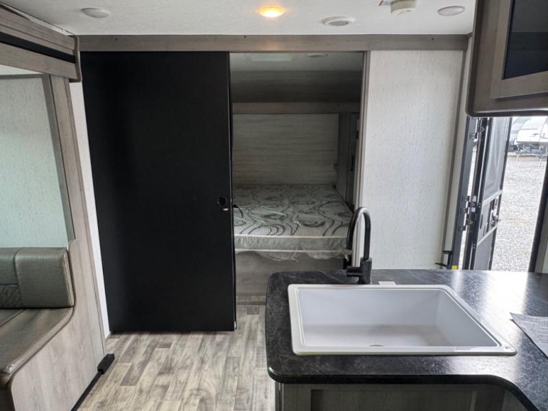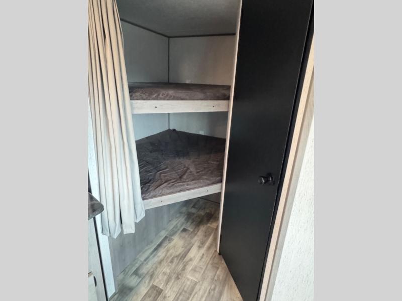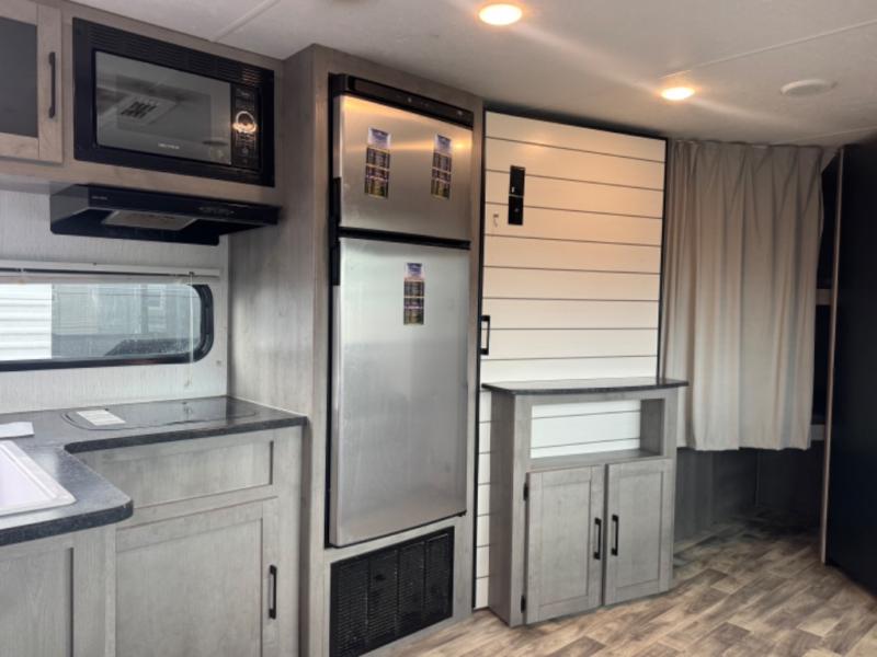 Are you looking for sleeping space for seven to eight campers? Well, you have found it with this Kodiak SE travel trailer. You can sleep in your own private bedroom with a residential walk-around queen bed and dual wardrobes while the other campers sleep on the double-size bunks next to the rear corner full bathroom. The booth dinette and sofa within the large slide offer more sleeping space if needed. The cook will love the L-shaped kitchen, the refrigerator, and the pantry near by to keep everyone fed. The fireplace and hinged entertainment center provide a cozy living area when you aren't outside, and when you want some fresh air, the 14' power awning with LED light gives you an outdoor living space. Just grab your camp chairs from the pass-through storage.