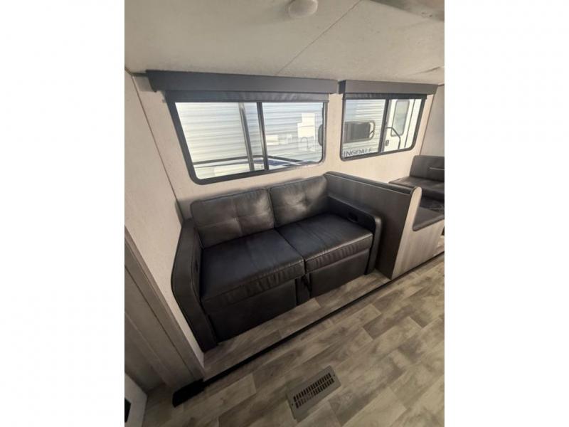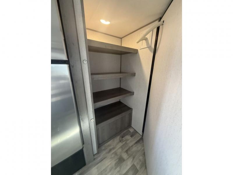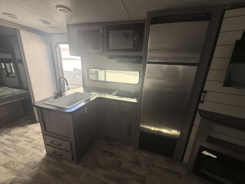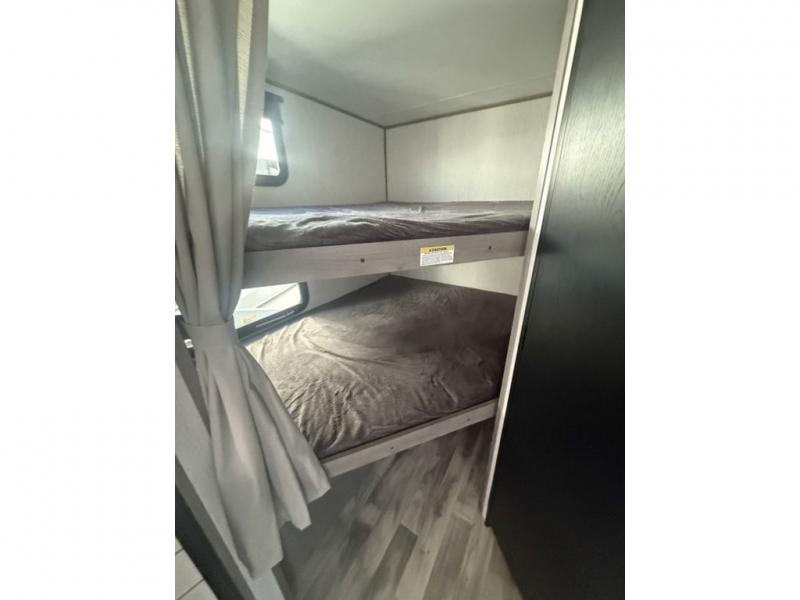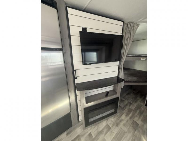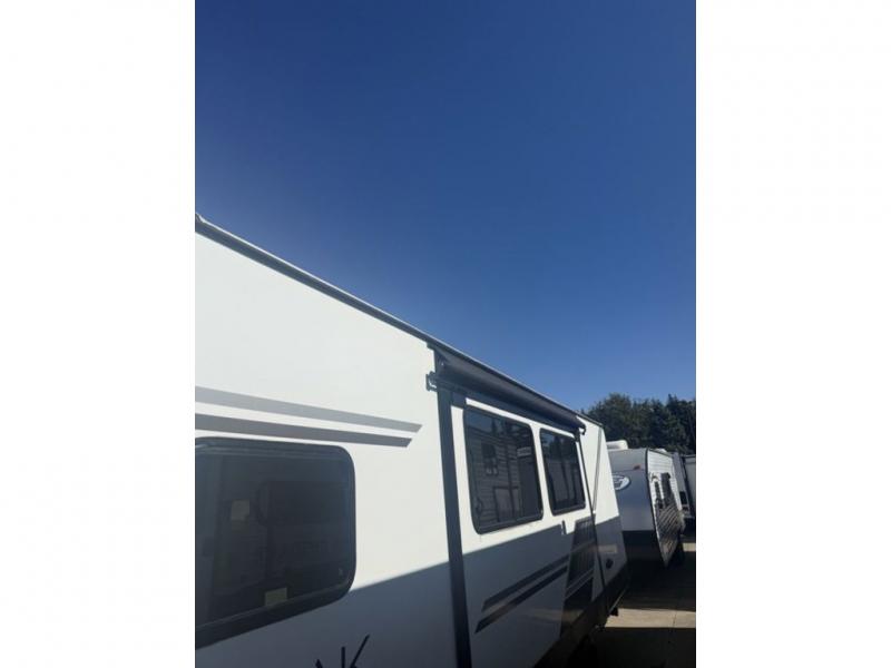 Are you looking for sleeping space for seven to eight campers? Well, you have found it with this Kodiak SE travel trailer. You can sleep in your own private bedroom with a residential walk-around queen bed and dual wardrobes while the other campers sleep on the double-size bunks next to the rear corner full bathroom. The booth dinette and sofa within the large slide offer more sleeping space if needed. The cook will love the L-shaped kitchen, the refrigerator, and the pantry near by to keep everyone fed. The fireplace and hinged entertainment center provide a cozy living area when you aren't outside, and when you want some fresh air, the 14' power awning with LED light gives you an outdoor living space. Just grab your camp chairs from the pass-through storage.