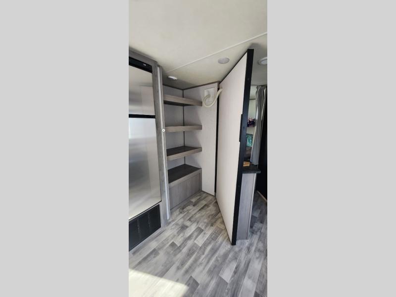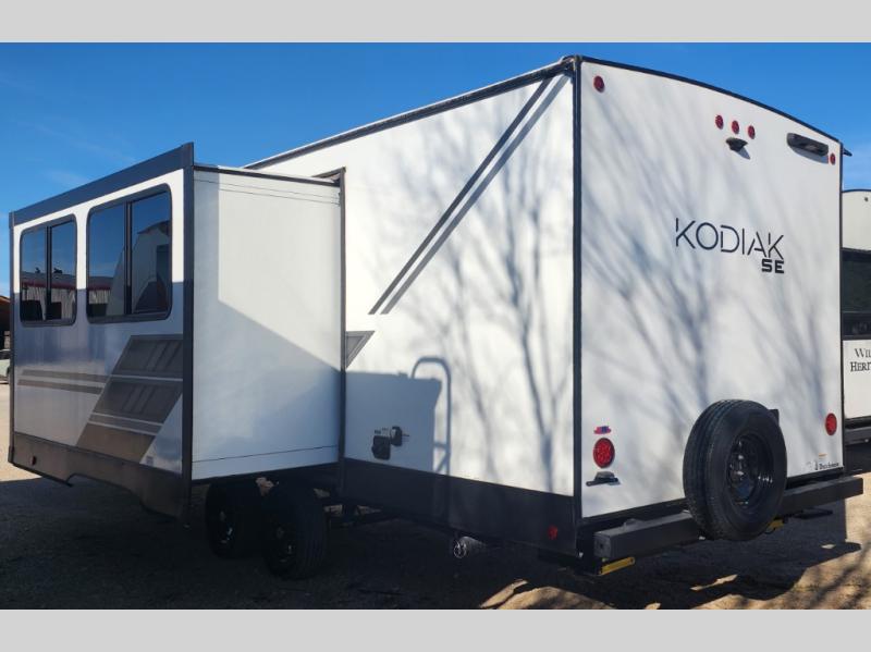 With any Kodiak SE travel trailer by Dutchmen RV, you can experience comfort while camping at a moment's notice. Each trailer includes features such as power front and rear stabilizer jacks, a power tongue jack making set-up easy, and a power awning with LED light. Each model is pet-friendly with the carpet-free slide out floor, tile flooring, and the pet leash D-ring. You can enjoy the wireless Bluetooth speaker, the LED interior and exterior lighting, and the 80" interior height. From the floor structure which includes a fully enclosed underbelly to the laminated walls with aluminum frame and block foam insulation, any Kodiak SE is built lightweight and ready for adventure!