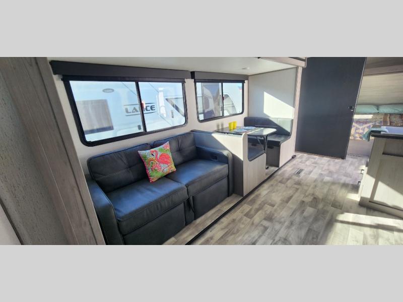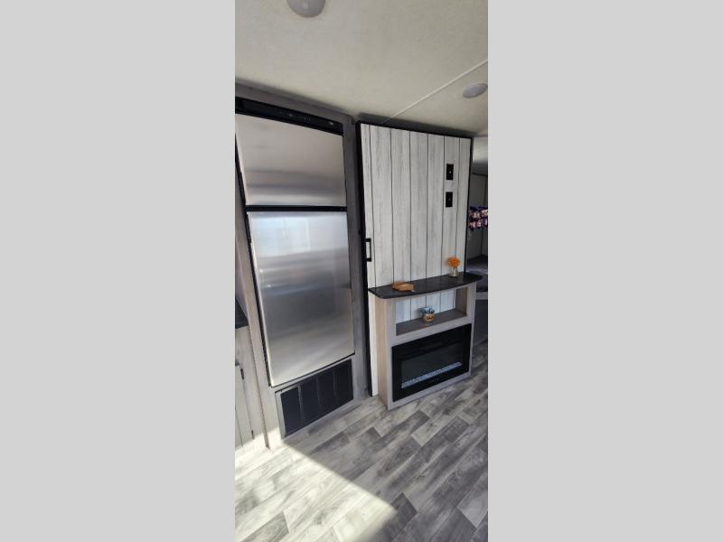 Are you looking for sleeping space for seven to eight campers? Well, you have found it with this Kodiak SE travel trailer. You can sleep in your own private bedroom with a residential walk-around queen bed and dual wardrobes while the other campers sleep on the double-size bunks next to the rear corner full bathroom. The booth dinette and sofa within the large slide offer more sleeping space if needed. The cook will love the L-shaped kitchen, the refrigerator, and the pantry near by to keep everyone fed. The fireplace and hinged entertainment center provide a cozy living area when you aren't outside, and when you want some fresh air, the 14' power awning with LED light gives you an outdoor living space. Just grab your camp chairs from the pass-through storage.