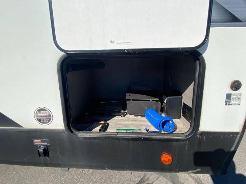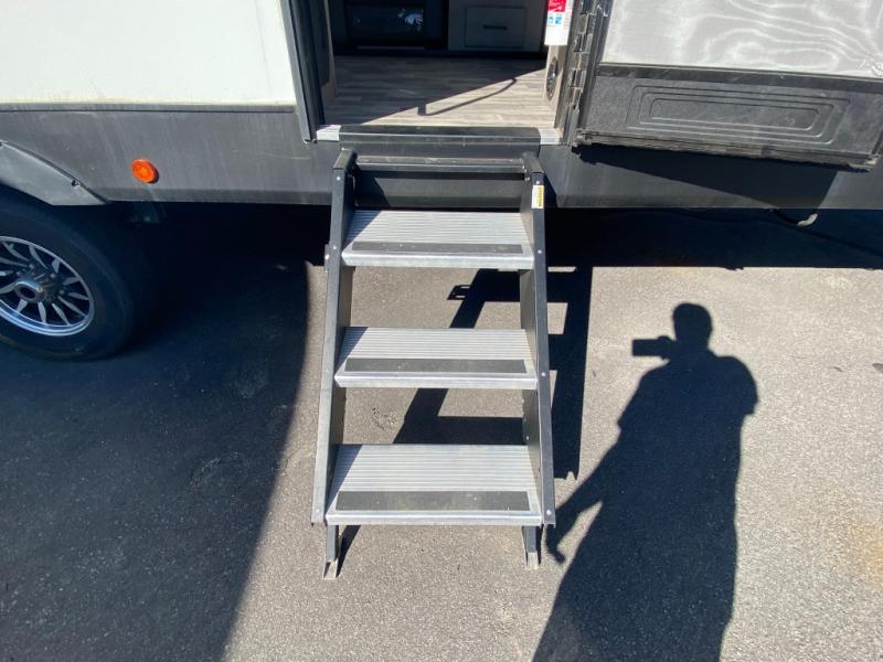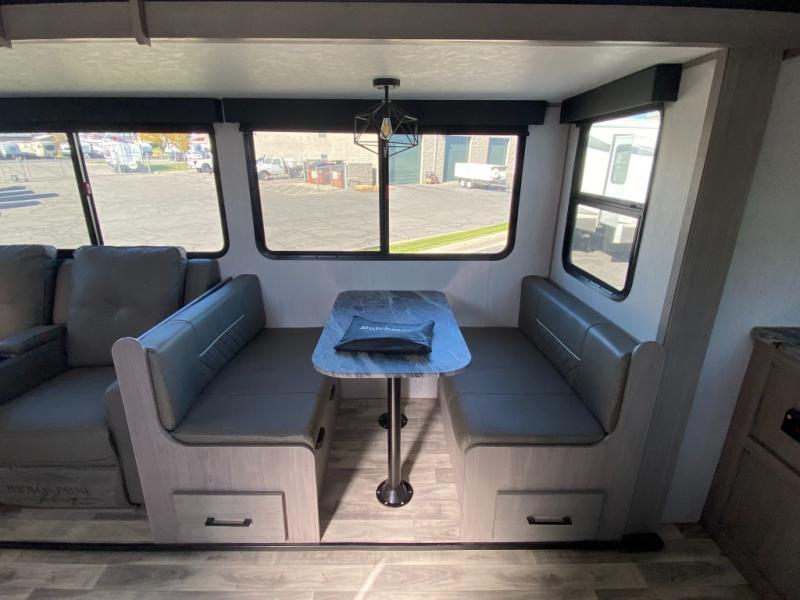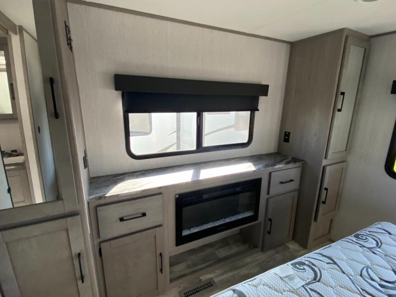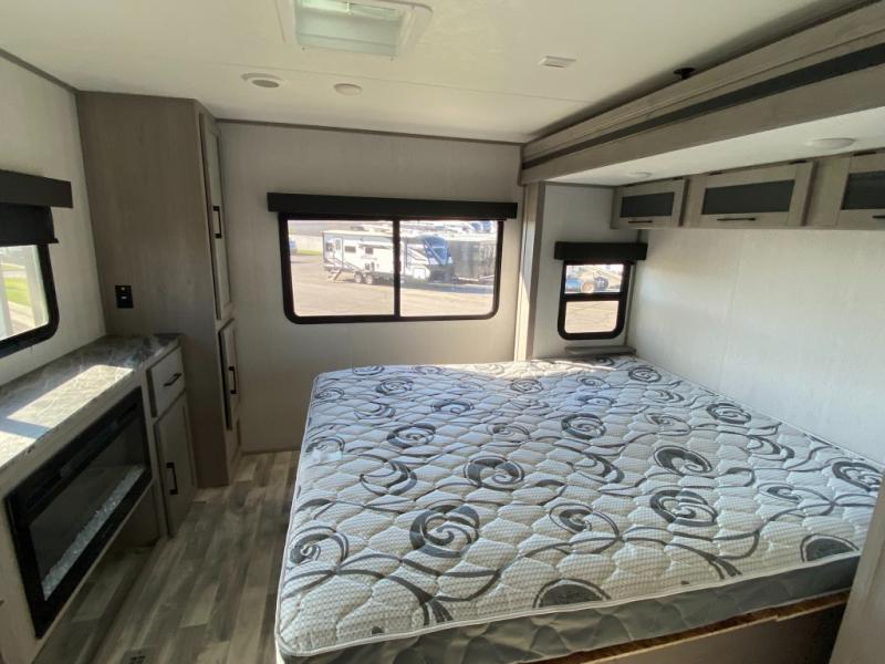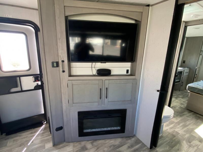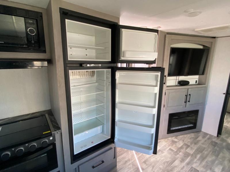 You will love every minute spent in this spacious travel trailer that includes dual slide outs! The walk through bath will create a rear master bedroom you are sure to love. You can sleep soundly on the king bed and relax in front of the bedroom fireplace. The chef of your group will have ample counter space in the kitchen to prep meals, plus there is a 10 cu. ft. refrigerator to store perishables. After dinner, get comfortable on the theater seats or play a game at the booth dinette. Or you may just want to relax outdoors under the 20' power awning with LED lights!