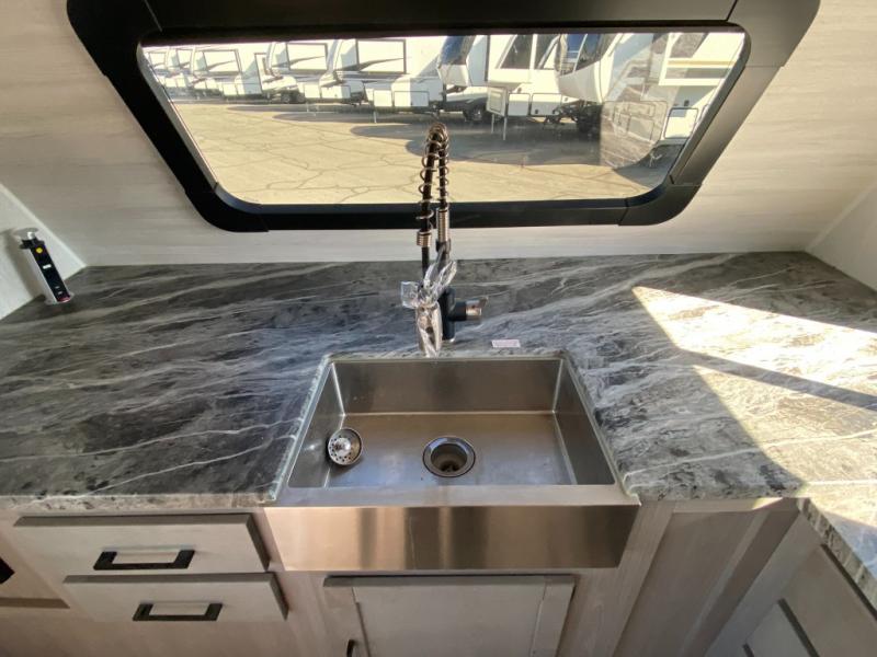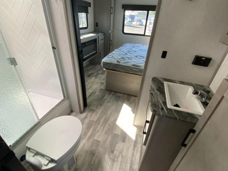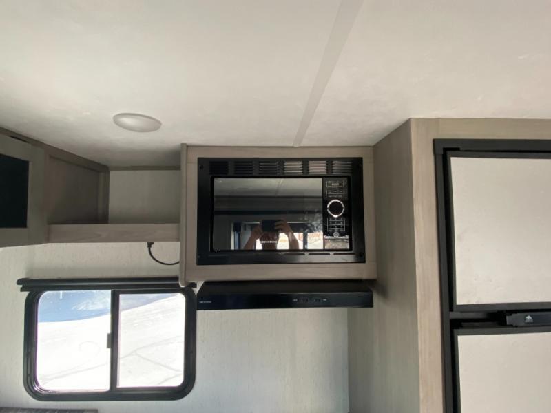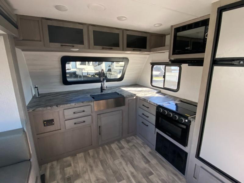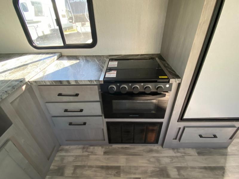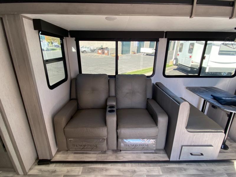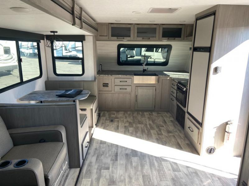 You will love every minute spent in this spacious travel trailer that includes dual slide outs! The walk through bath will create a rear master bedroom you are sure to love. You can sleep soundly on the king bed and relax in front of the bedroom fireplace. The chef of your group will have ample counter space in the kitchen to prep meals, plus there is a 10 cu. ft. refrigerator to store perishables. After dinner, get comfortable on the theater seats or play a game at the booth dinette. Or you may just want to relax outdoors under the 20' power awning with LED lights!