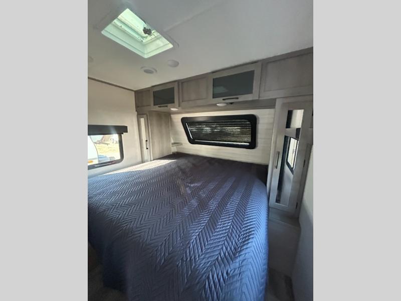 This travel trailer can comfortably sleep seven people each night, so invite your grandkids or neighbor friends along! There is a full bath close to the front bedroom, plus a half bath in the private bunkhouse for convenience, and the outdoor kitchen will be a hit with everyone! If a rainy day is ruining your plans, you can relax on the sofa across from the fireplace, or play board games at the booth dinette. And don't forget to check out the front private bedroom with a king bed!