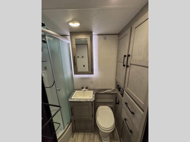 This couple's trailer is perfect for weekend excursions or extended getaways at your favorite state park. You will have your own queen bed up front with storage space for your things, and the full rear bath will add privacy and convenience. Prepare your meals on the three burner range or in the microwave oven, and you can dine together at the booth dinette. The dinette can also be used as additional sleeping space for one guest or two kids.