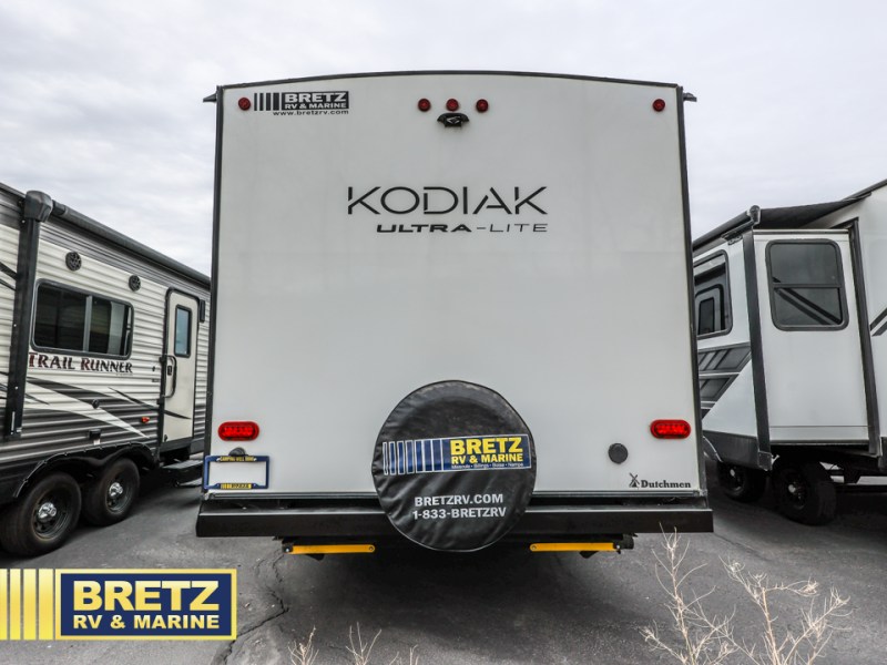 Each Kodiak Ultra-Lite travel trailer by Dutchmen includes a laminated crown roof, aluminum framing, and bear cage construction for a lightweight, yet durable RV. The HyperDeck flooring features fiberglass reinforced polypropylene, a higher density foam core, and a steel powder coated main frame. Head indoors to find seamless countertops, night shades throughout, and USB ports for your electronics. These travel trailers come with a power tongue jack and power stabilizer jacks for easy set-up, and easy lube axles to ensure smooth towing. Since the Kodiak Ultra-Lite is prepped for WiFi 4G LTE you can choose to get some work done while you're away from home, and you might even want to add the 32" LED TV available on some models!