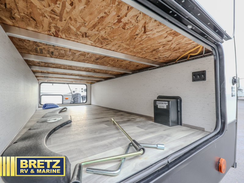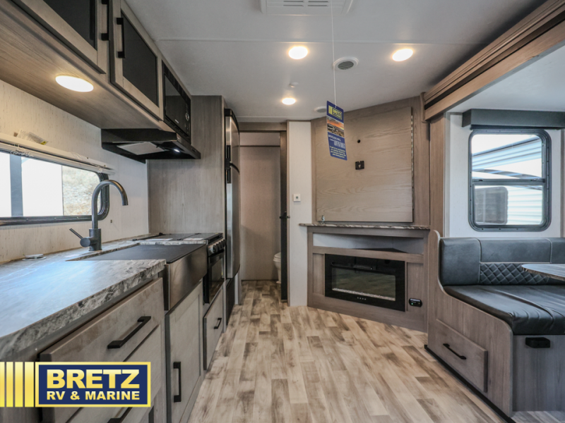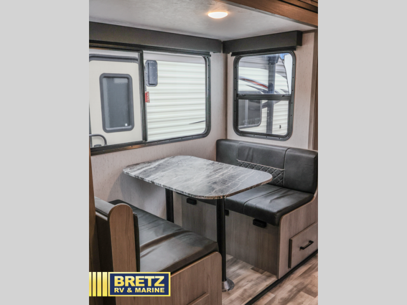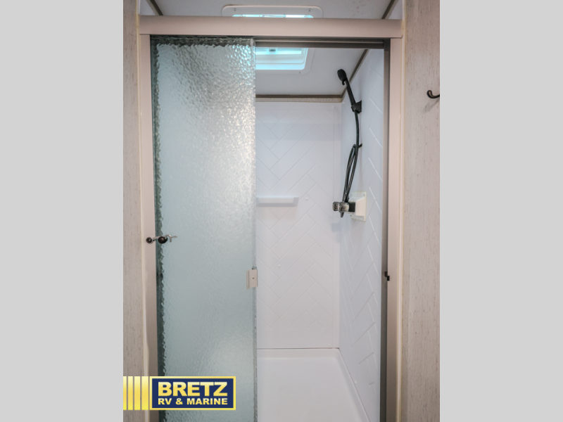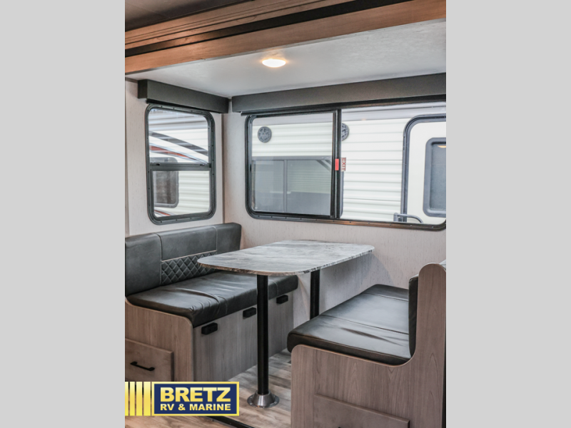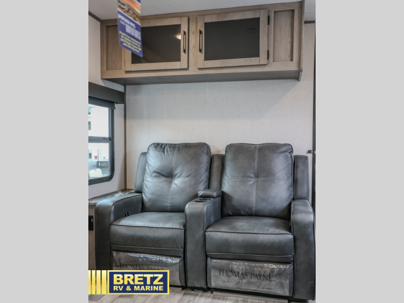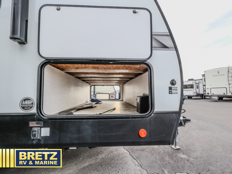 A full rear bath on board this cozy travel trailer will add privacy and convenience you won't want to camp without. The slide out in the main living area will provide plenty of space to let the chef whip up breakfast on the three burner range, and your crew can get comfy on the theater seats. The 10 cu. ft. refrigerator will allow you to pack your favorite cold ingredients, plus there is a hidden pantry behind the hinged entertainment center for smart storage spaces. This model also includes a front private bedroom with a queen bed, just like at home!