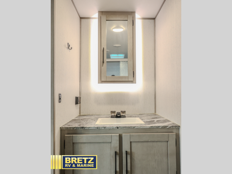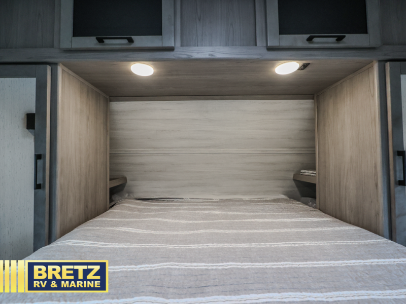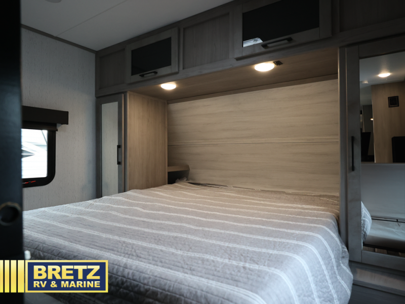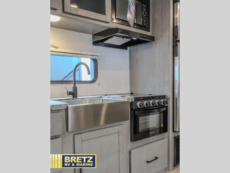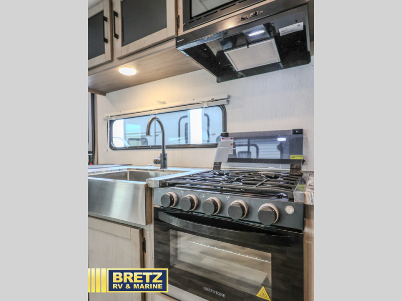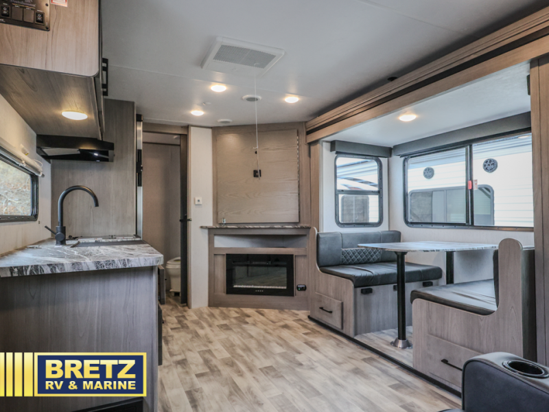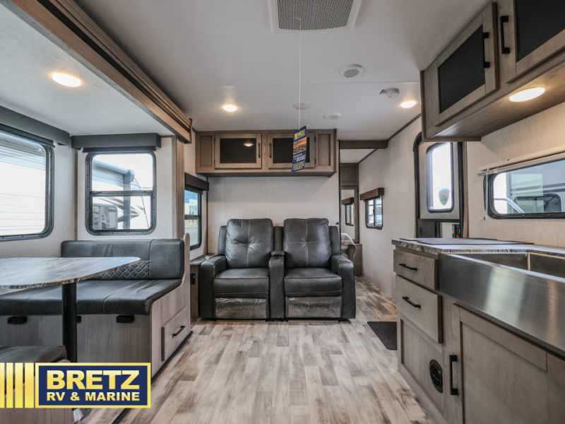 A full rear bath on board this cozy travel trailer will add privacy and convenience you won't want to camp without. The slide out in the main living area will provide plenty of space to let the chef whip up breakfast on the three burner range, and your crew can get comfy on the theater seats. The 10 cu. ft. refrigerator will allow you to pack your favorite cold ingredients, plus there is a hidden pantry behind the hinged entertainment center for smart storage spaces. This model also includes a front private bedroom with a queen bed, just like at home!