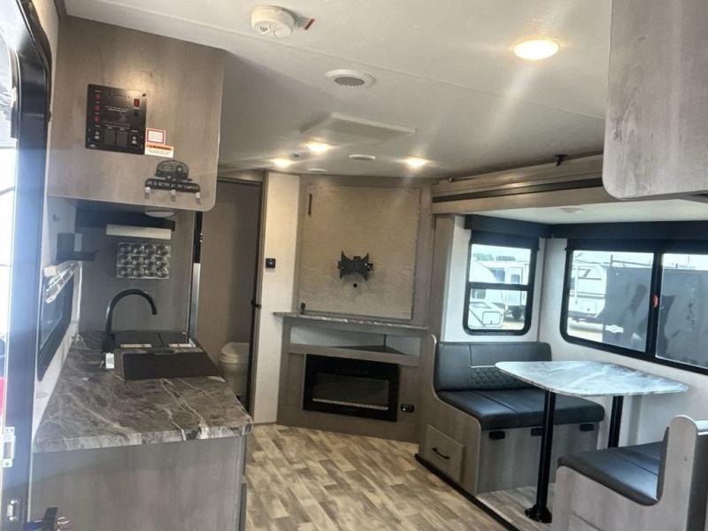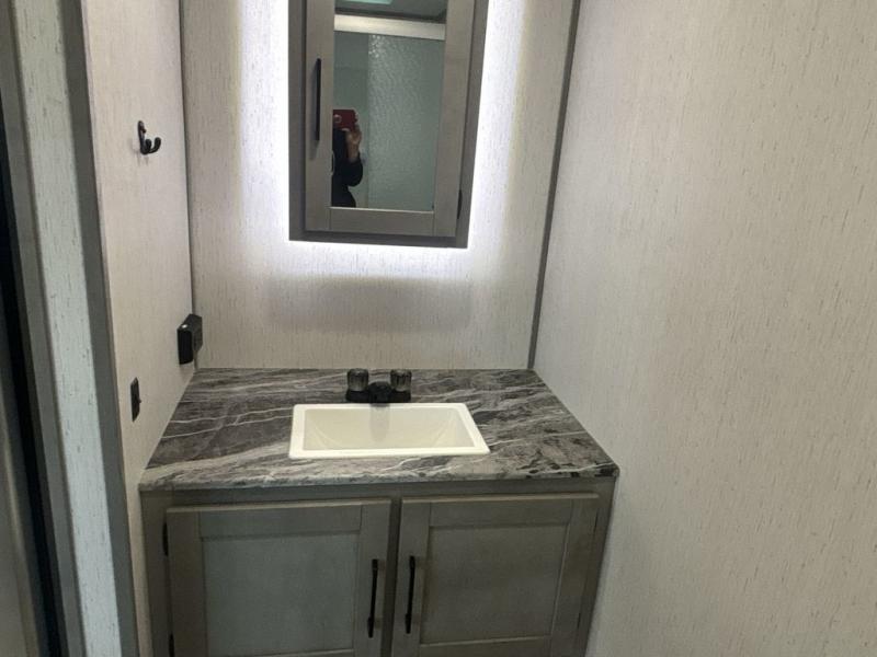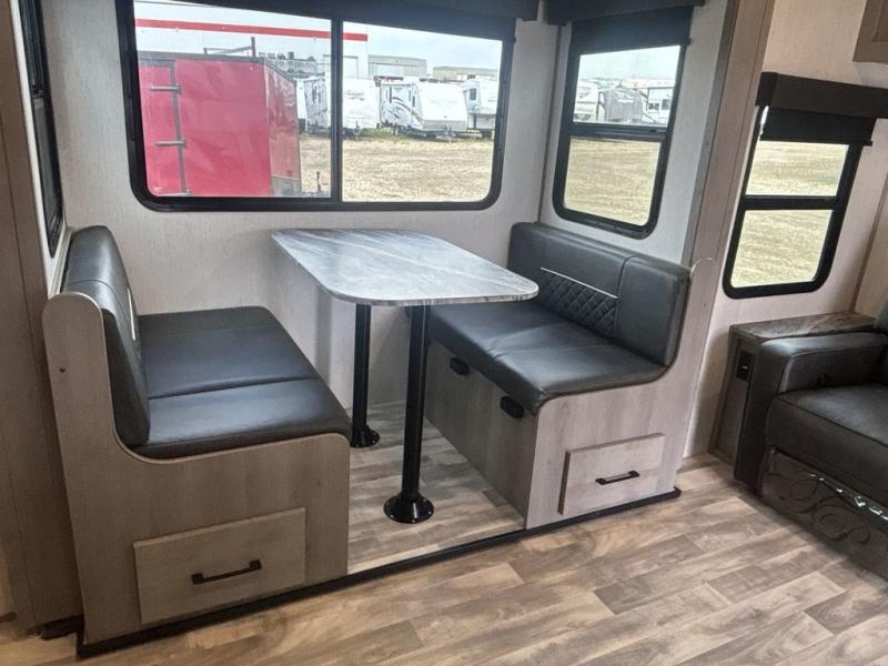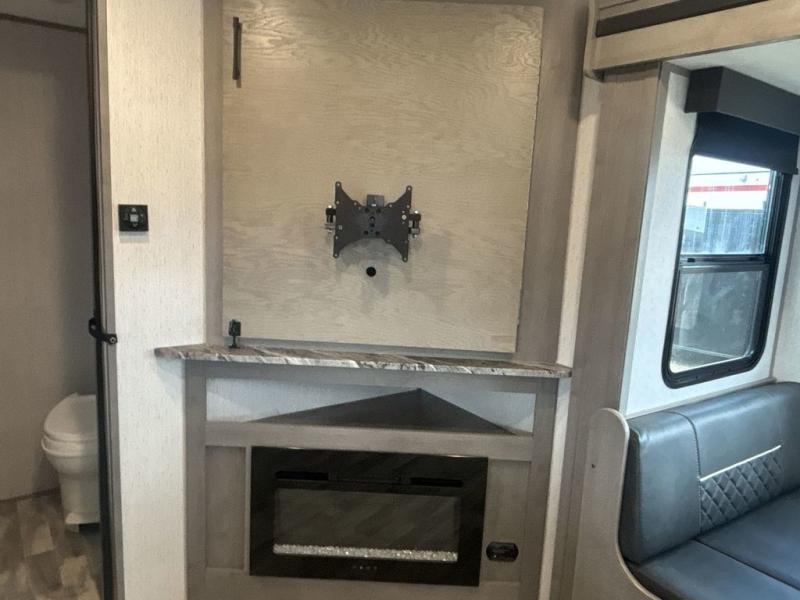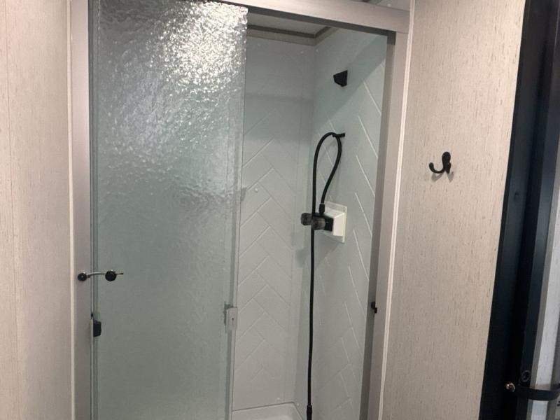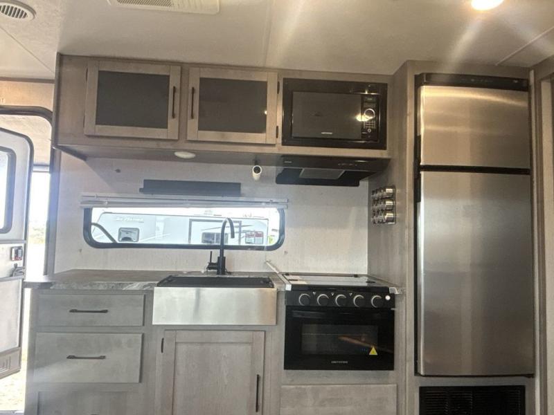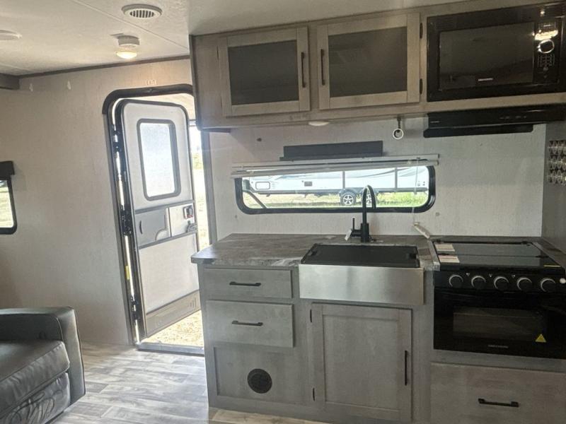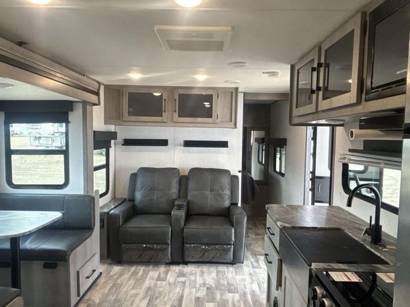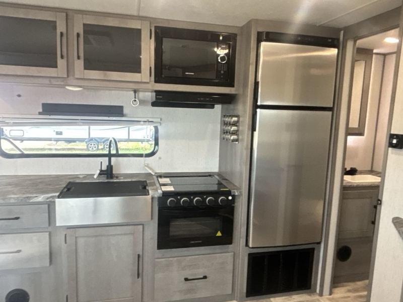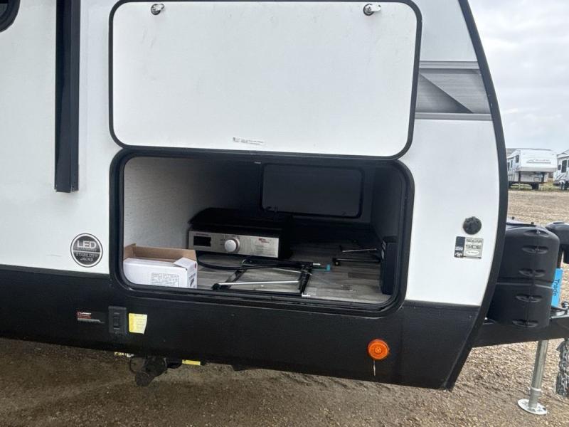 A full rear bath on board this cozy travel trailer will add privacy and convenience you won't want to camp without. The slide out in the main living area will provide plenty of space to let the chef whip up breakfast on the three burner range, and your crew can get comfy on the theater seats. The 10 cu. ft. refrigerator will allow you to pack your favorite cold ingredients, plus there is a hidden pantry behind the hinged entertainment center for smart storage spaces. This model also includes a front private bedroom with a queen bed, just like at home!