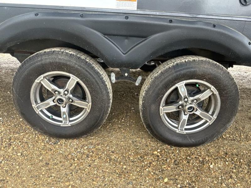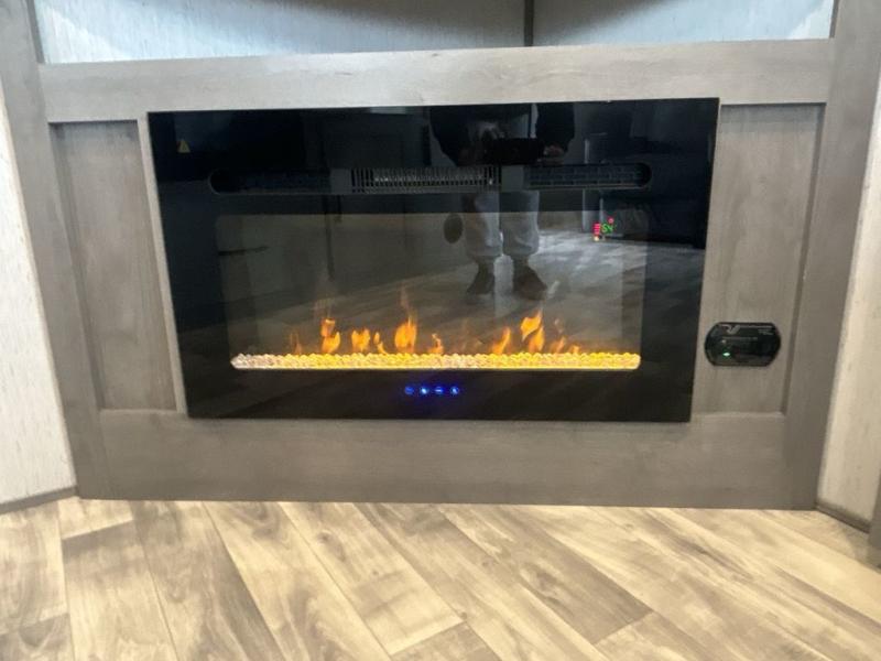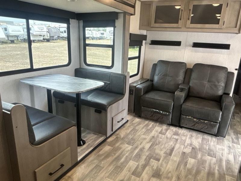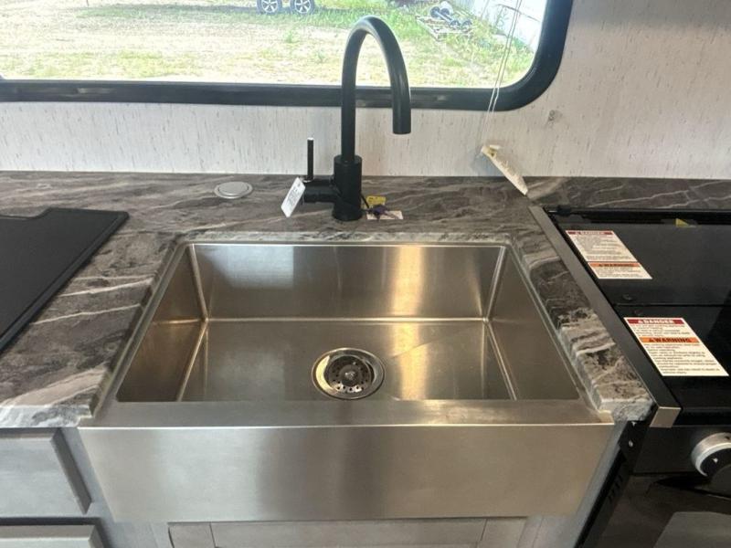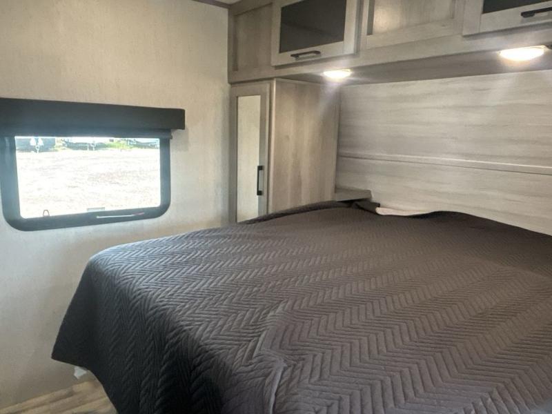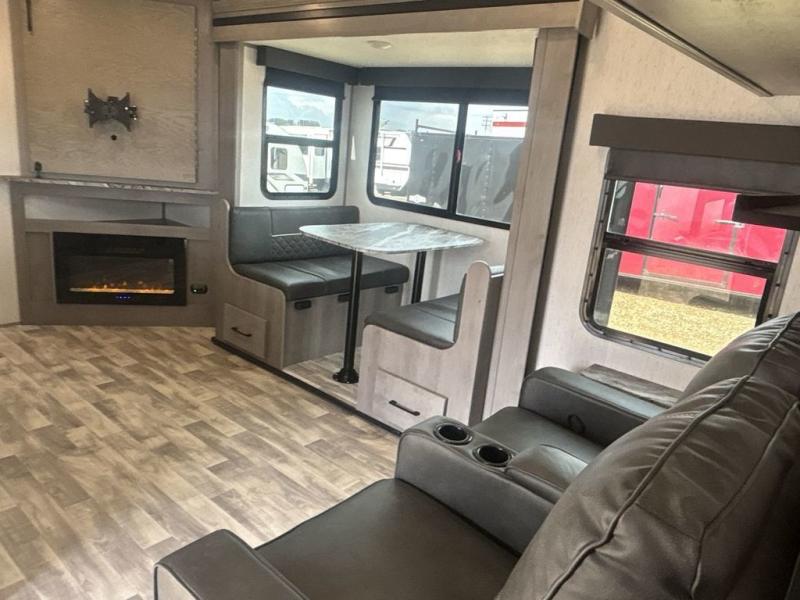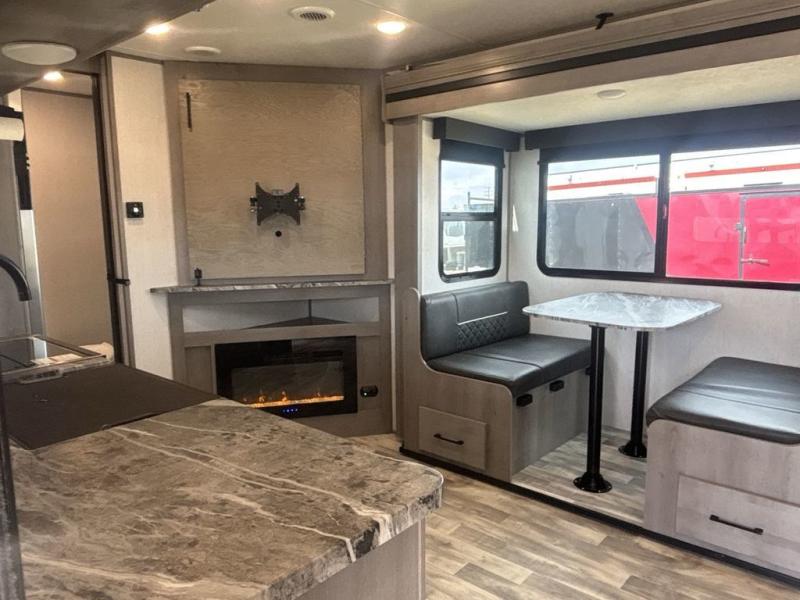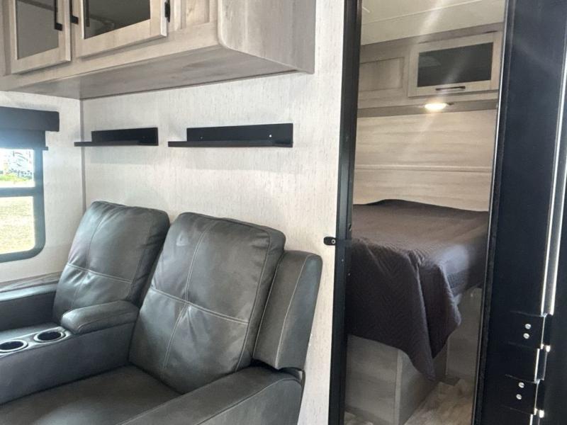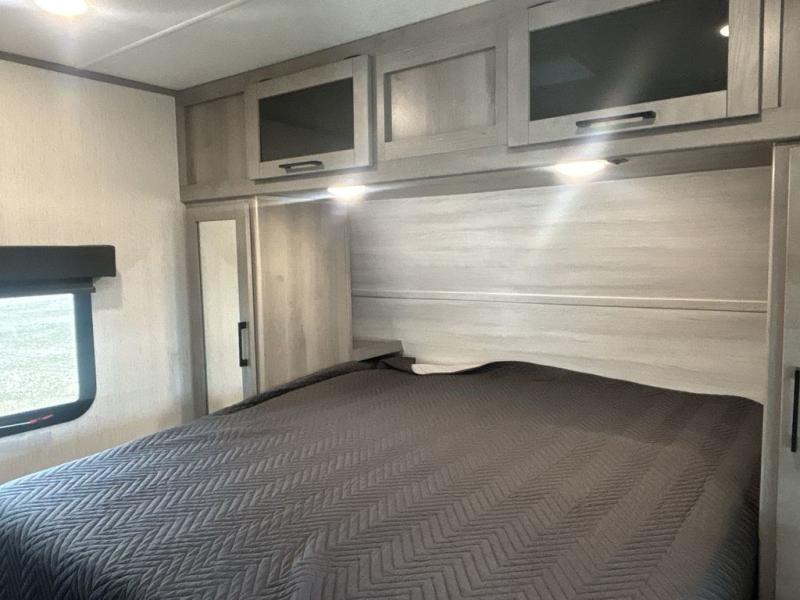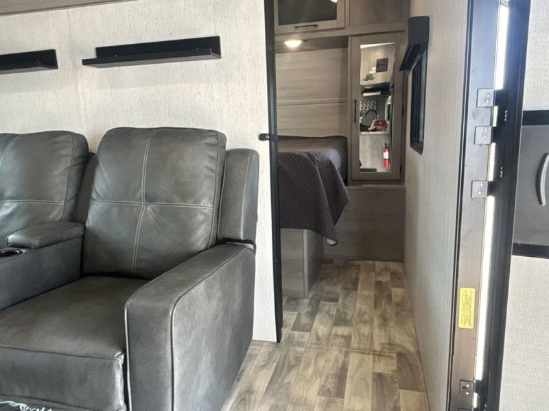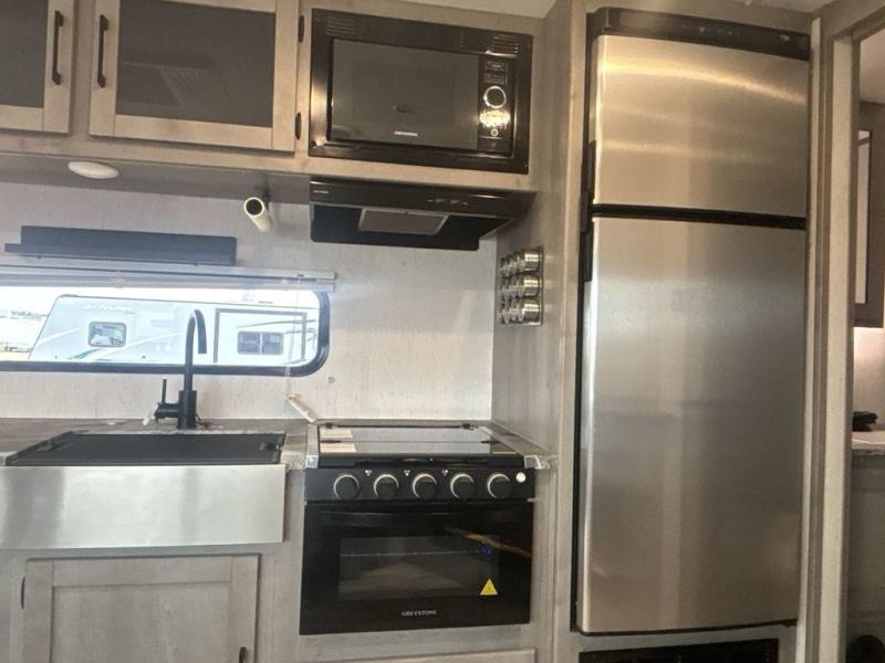 A full rear bath on board this cozy travel trailer will add privacy and convenience you won't want to camp without. The slide out in the main living area will provide plenty of space to let the chef whip up breakfast on the three burner range, and your crew can get comfy on the theater seats. The 10 cu. ft. refrigerator will allow you to pack your favorite cold ingredients, plus there is a hidden pantry behind the hinged entertainment center for smart storage spaces. This model also includes a front private bedroom with a queen bed, just like at home!
