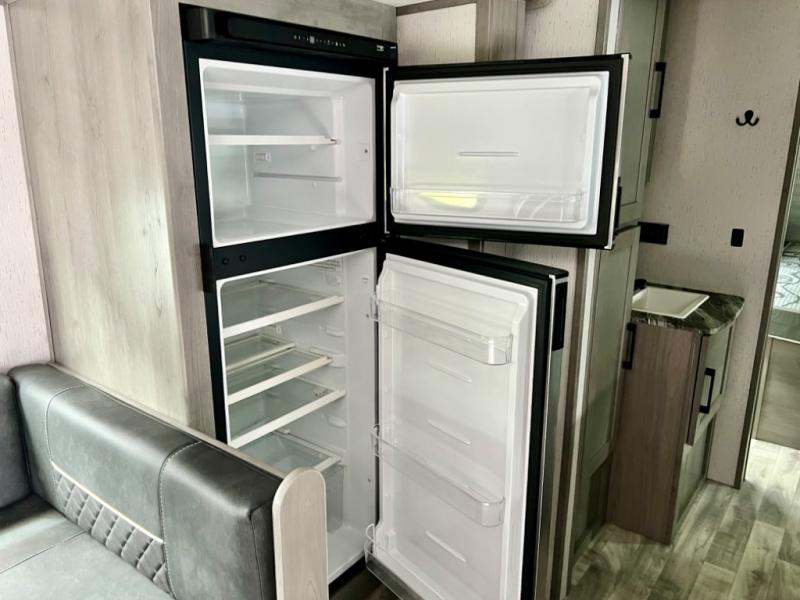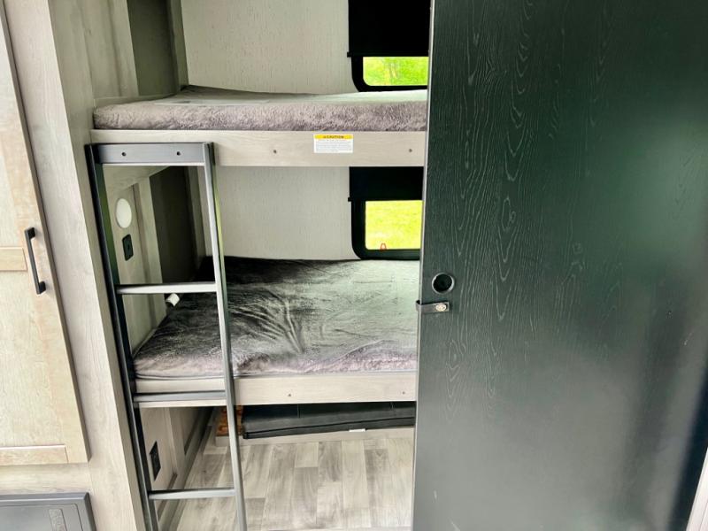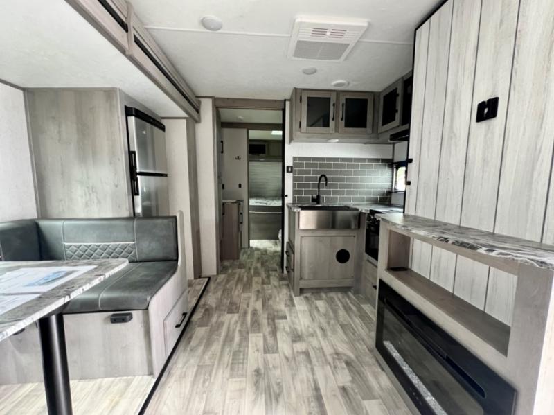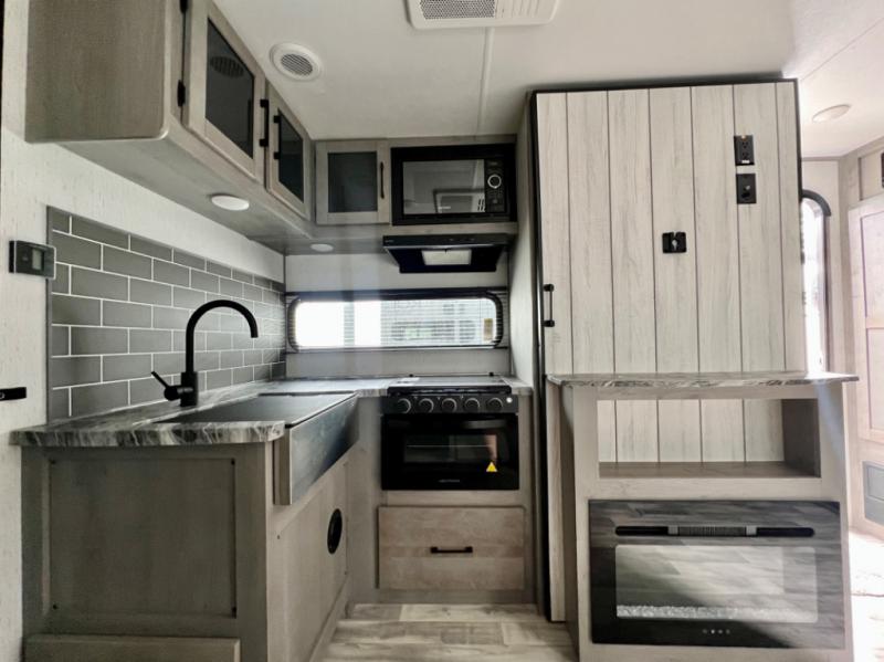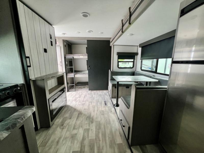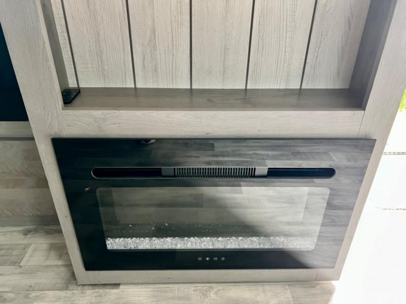 This is the perfect travel trailer for family or group of six. The private bunkhouse in the back will be perfect for the little ones, and you'll enjoy the front master bedroom with a queen bed. Any other guests can sleep on the U-shaped dinette when it's not being used to dine around, and the walk-through bath will be easily accessible for everyone. This model includes an outdoor suburban griddle for breakfast outdoors, and the 18' power awning with LED lights will provide an inviting outdoor space. The slide out in the main living area will allow you to relax just like you would at home, plus there is a fireplace here and a hinged entertainment center for added storage space.