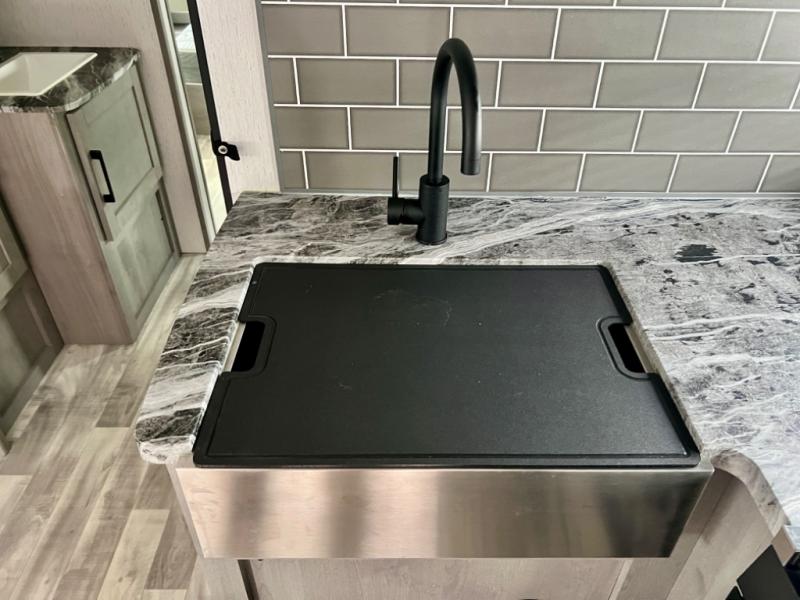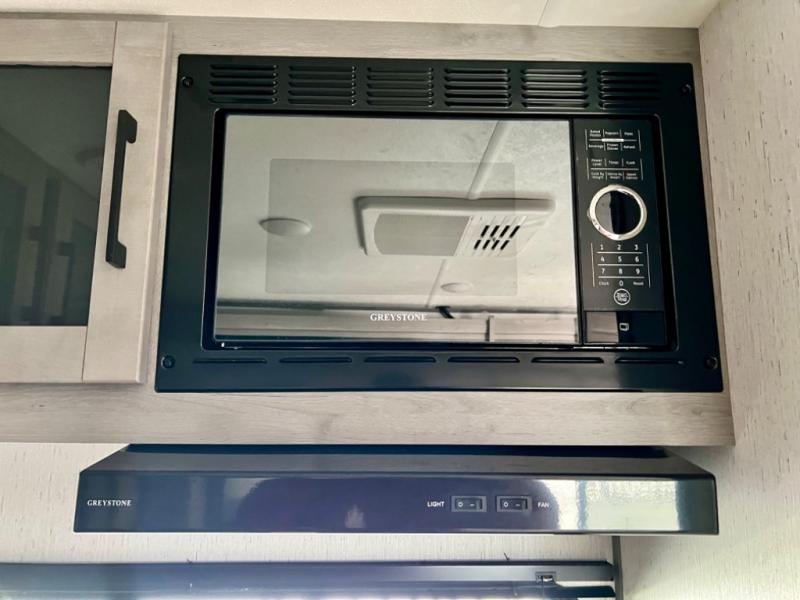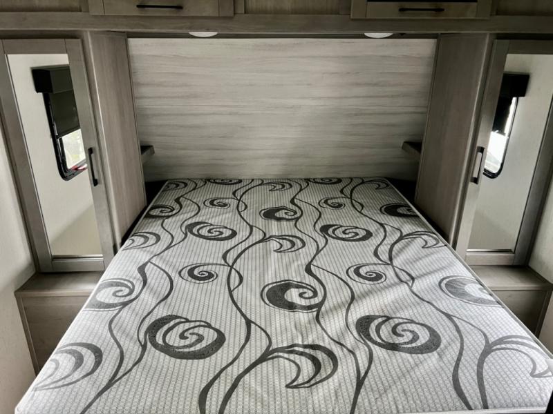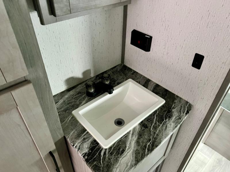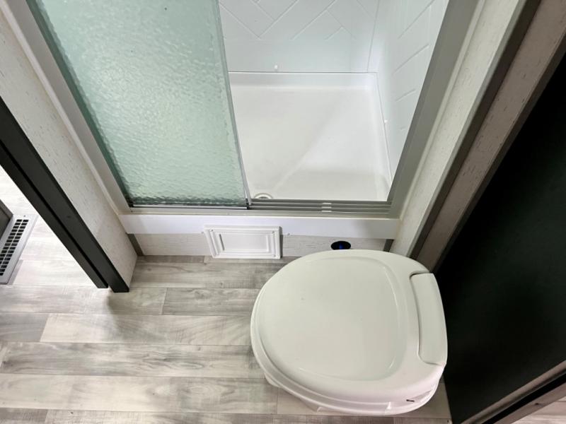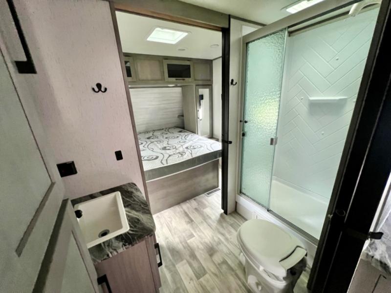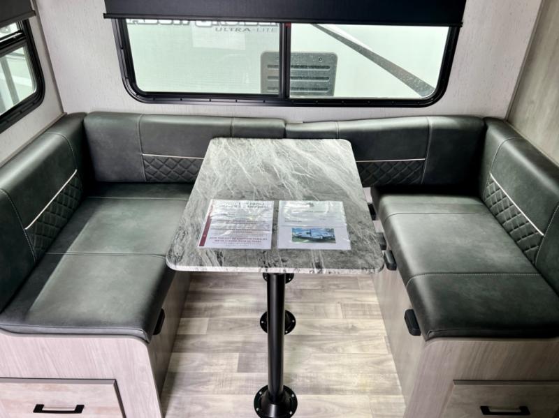 This is the perfect travel trailer for family or group of six. The private bunkhouse in the back will be perfect for the little ones, and you'll enjoy the front master bedroom with a queen bed. Any other guests can sleep on the U-shaped dinette when it's not being used to dine around, and the walk-through bath will be easily accessible for everyone. This model includes an outdoor suburban griddle for breakfast outdoors, and the 18' power awning with LED lights will provide an inviting outdoor space. The slide out in the main living area will allow you to relax just like you would at home, plus there is a fireplace here and a hinged entertainment center for added storage space.