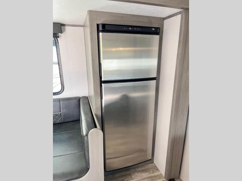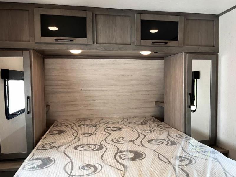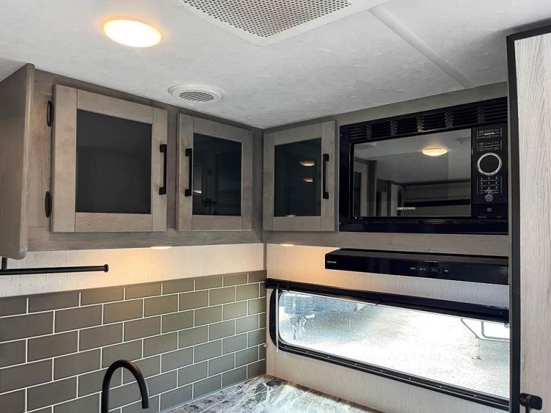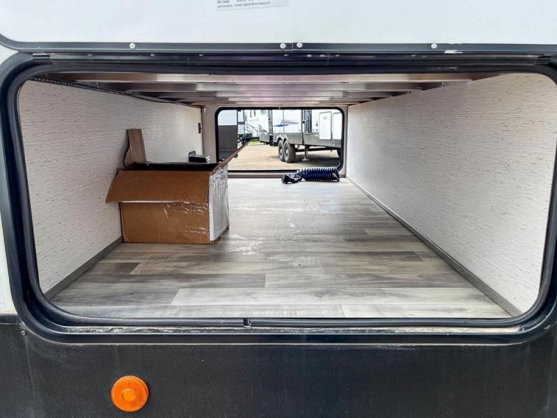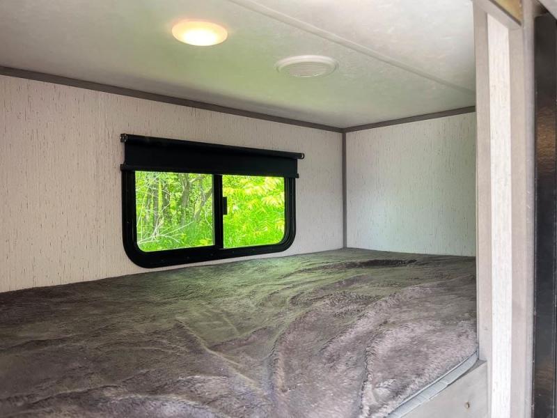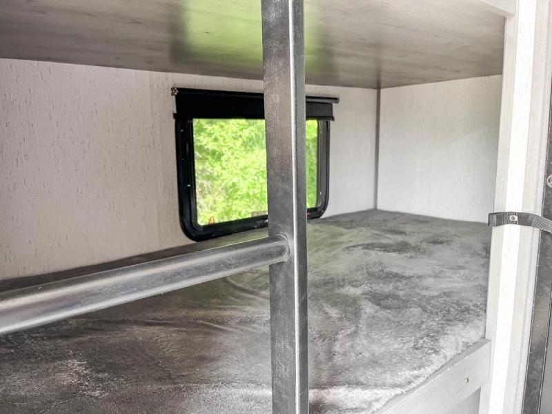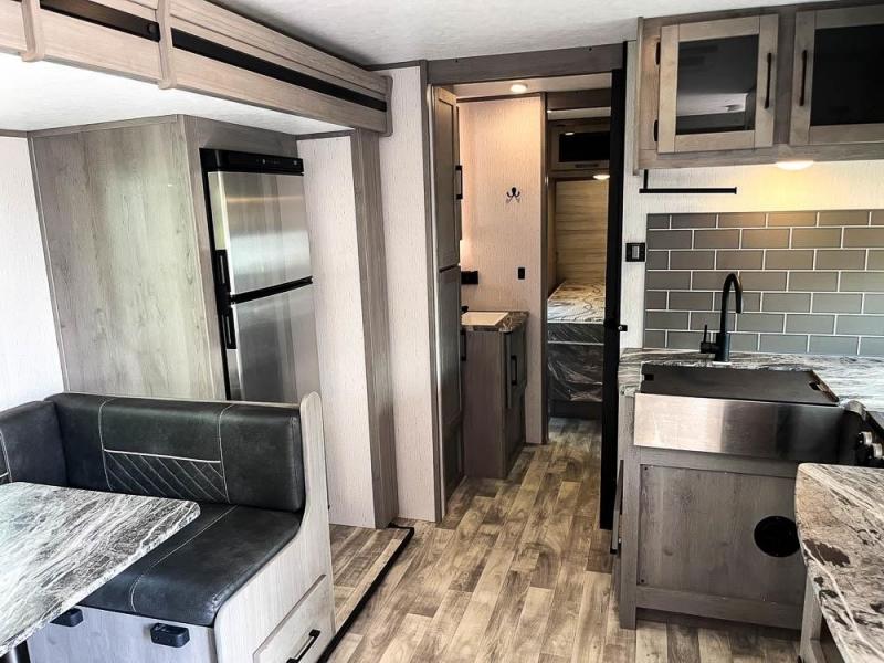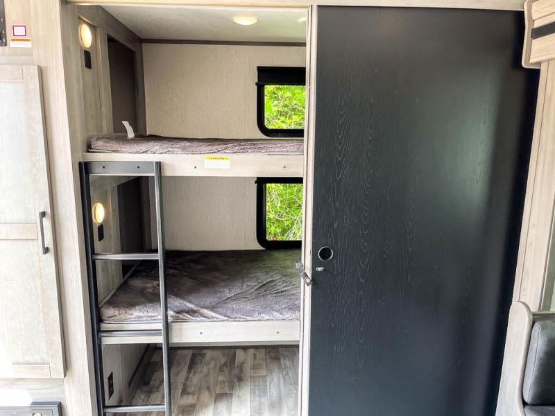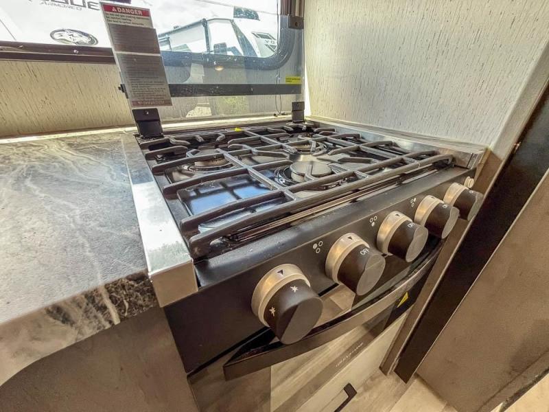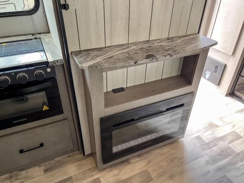 This is the perfect travel trailer for family or group of six. The private bunkhouse in the back will be perfect for the little ones, and you'll enjoy the front master bedroom with a queen bed. Any other guests can sleep on the U-shaped dinette when it's not being used to dine around, and the walk-through bath will be easily accessible for everyone. This model includes an outdoor suburban griddle for breakfast outdoors, and the 18' power awning with LED lights will provide an inviting outdoor space. The slide out in the main living area will allow you to relax just like you would at home, plus there is a fireplace here and a hinged entertainment center for added storage space.