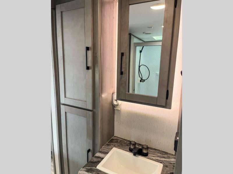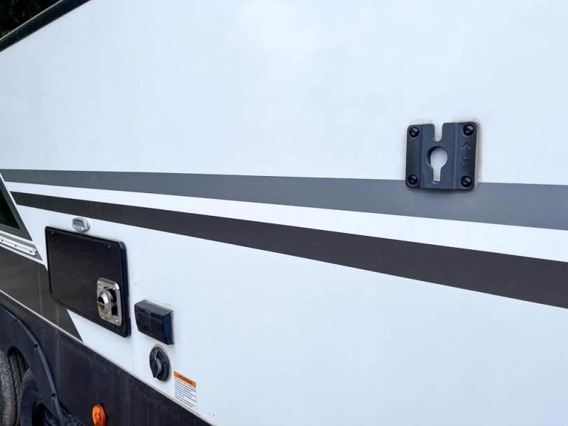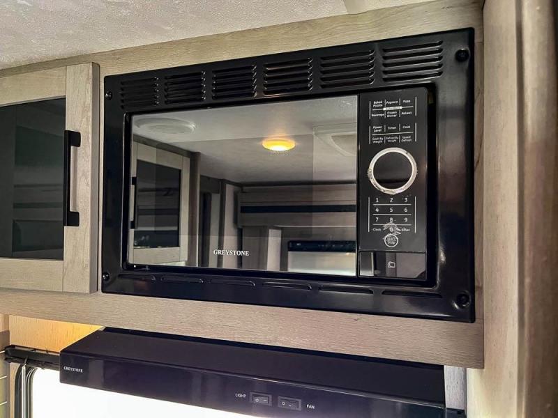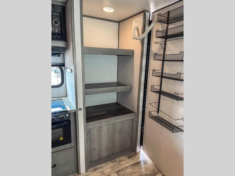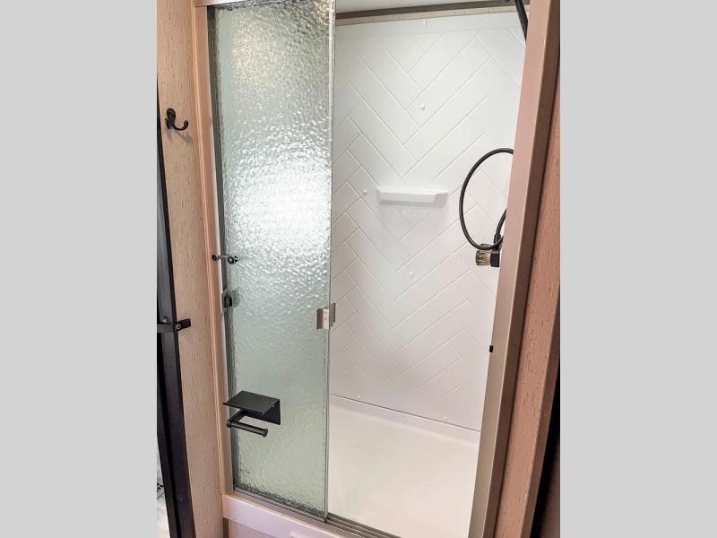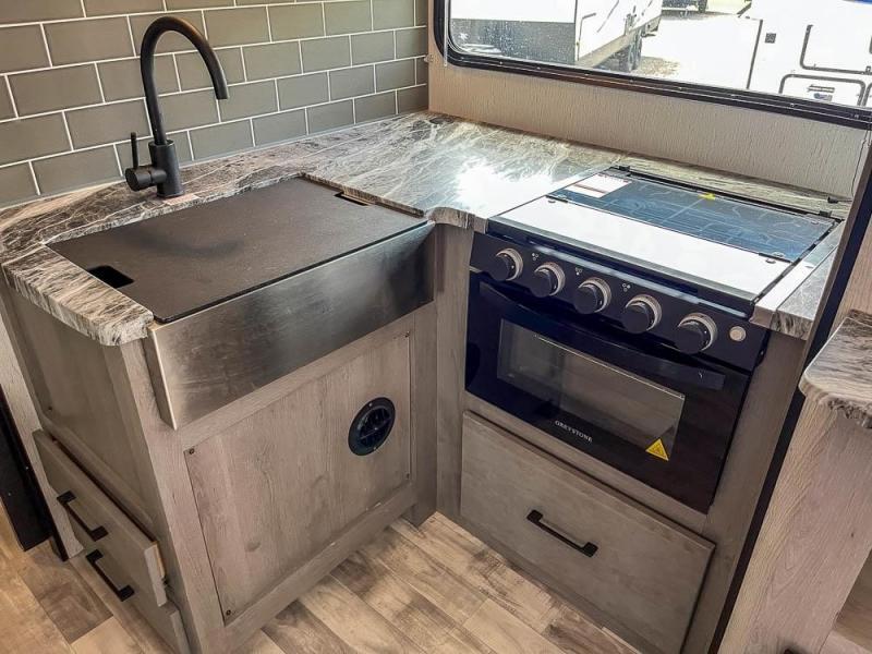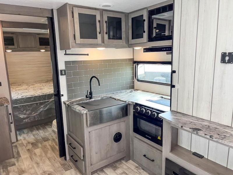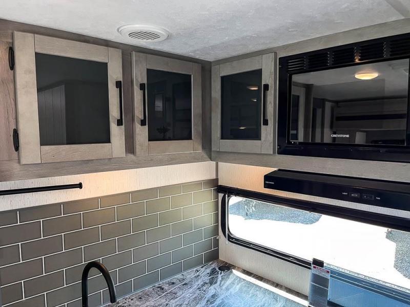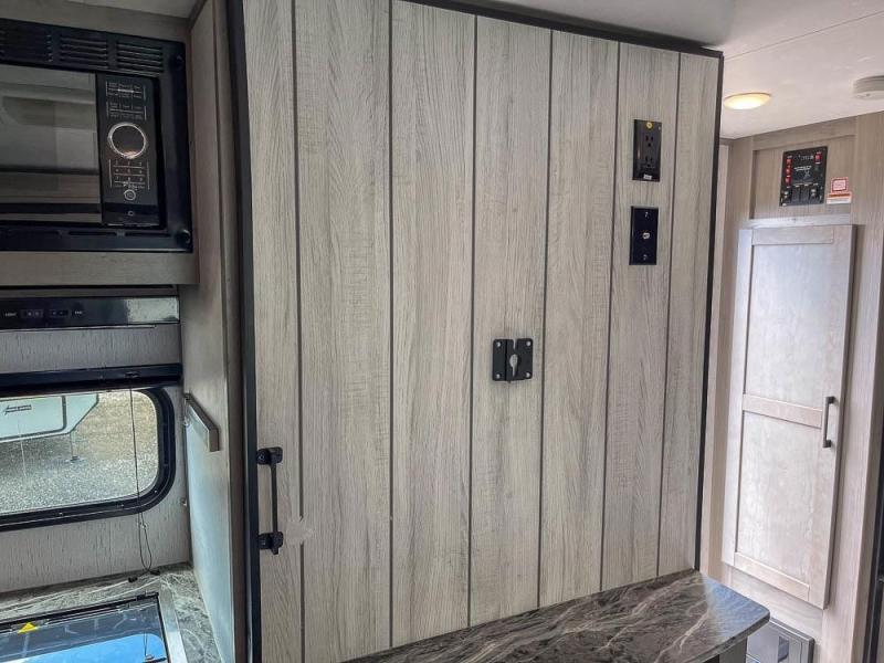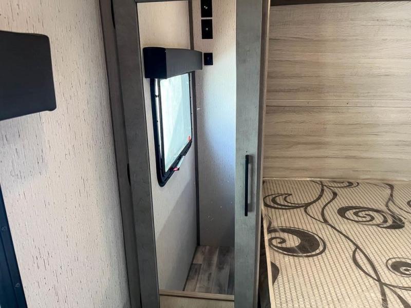 This is the perfect travel trailer for family or group of six. The private bunkhouse in the back will be perfect for the little ones, and you'll enjoy the front master bedroom with a queen bed. Any other guests can sleep on the U-shaped dinette when it's not being used to dine around, and the walk-through bath will be easily accessible for everyone. This model includes an outdoor suburban griddle for breakfast outdoors, and the 18' power awning with LED lights will provide an inviting outdoor space. The slide out in the main living area will allow you to relax just like you would at home, plus there is a fireplace here and a hinged entertainment center for added storage space.