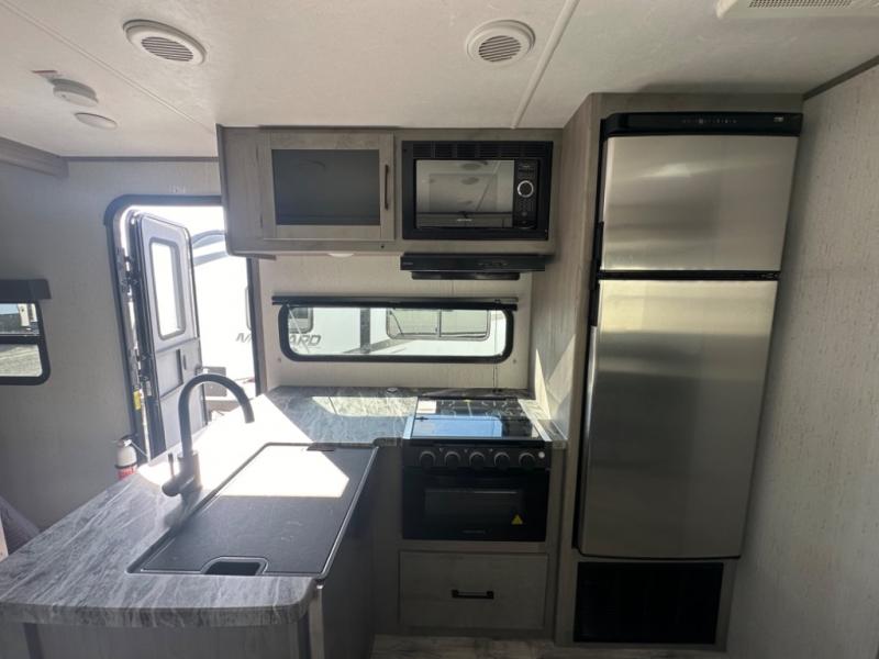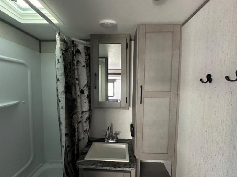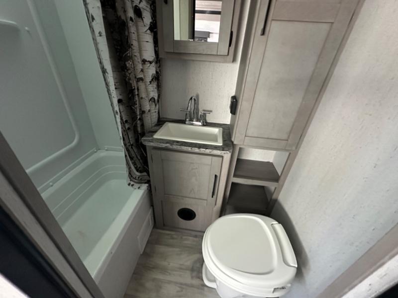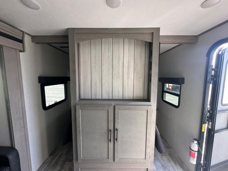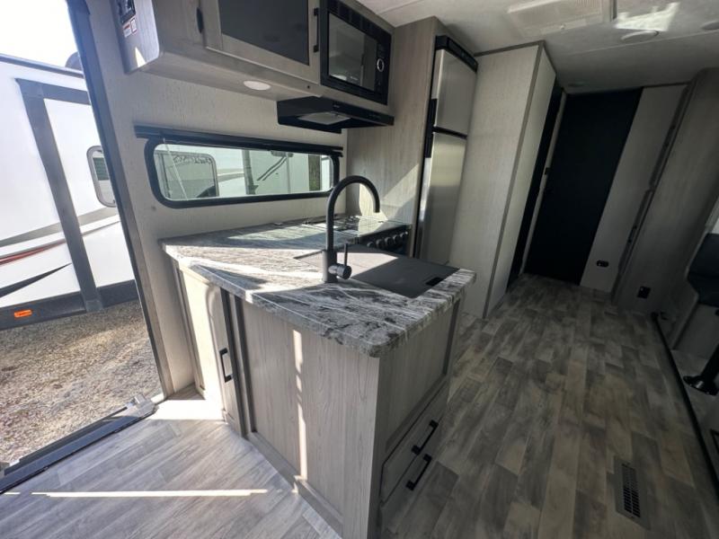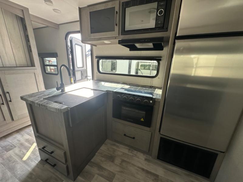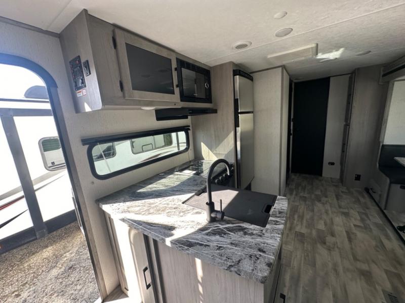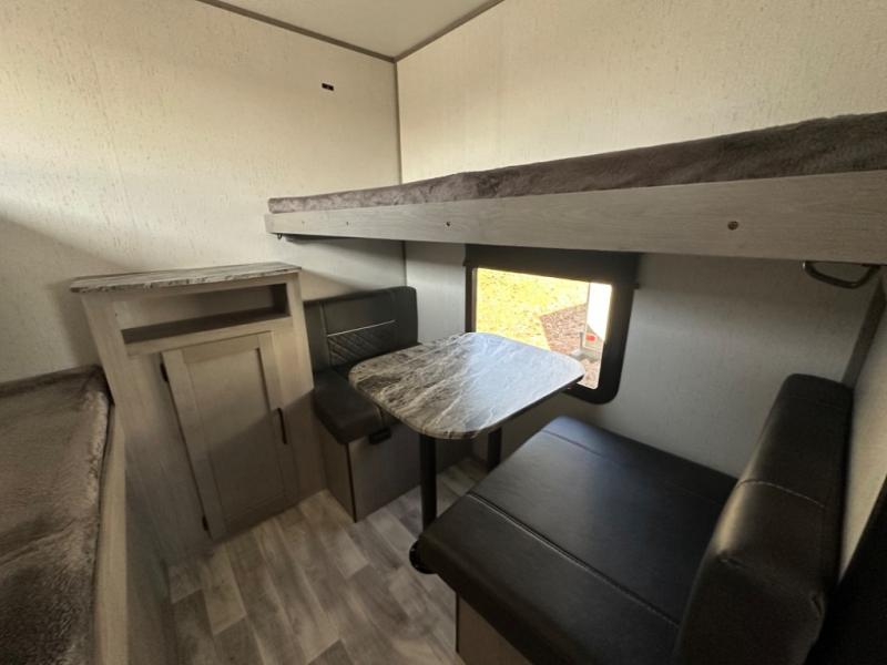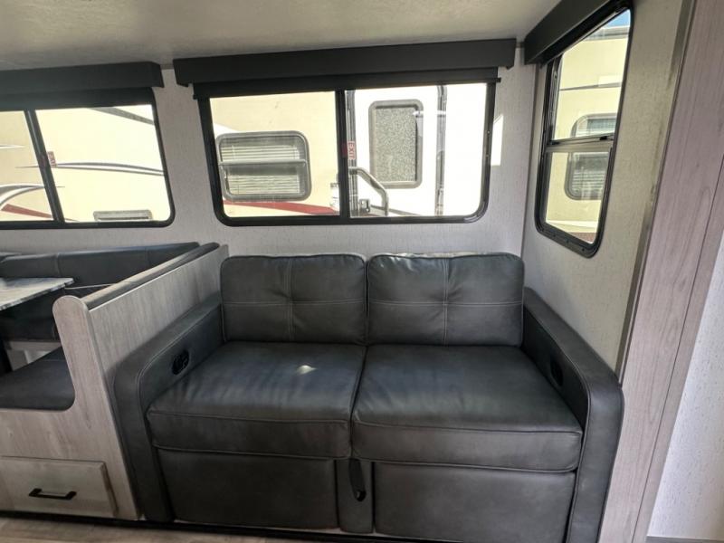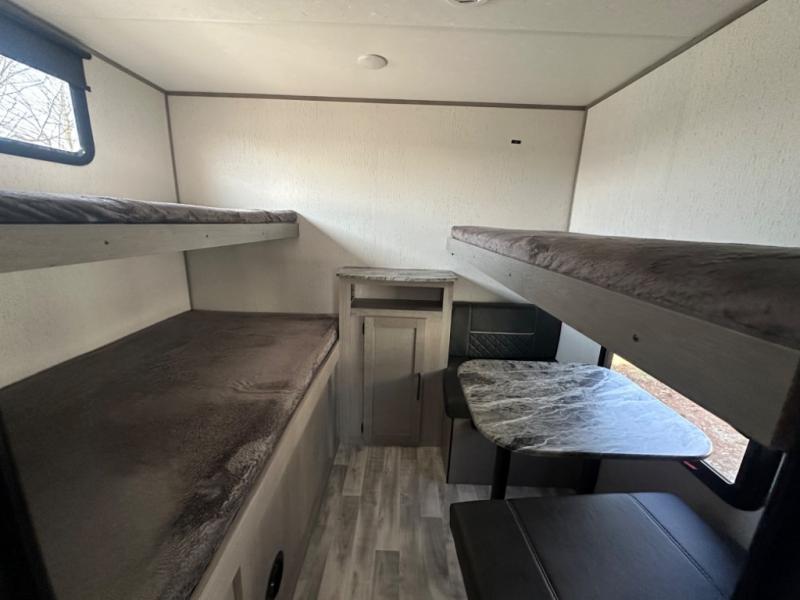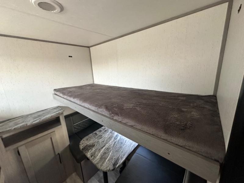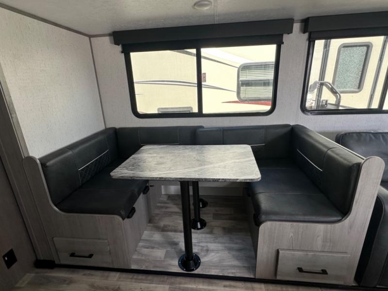If you've been looking for a lightweight travel trailer with a large sleeping capacity, your search is over! This model can sleep nine comfortably between the queen bed, the furniture within the large slide out, and the private bunkhouse. Your group will love to visit under the 18' power awning with LED lights, especially while dinner is being made on the outside kitchen. If the weather isn't cooperating, just head indoors for game night around the U-shaped dinette!