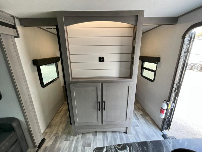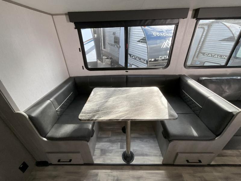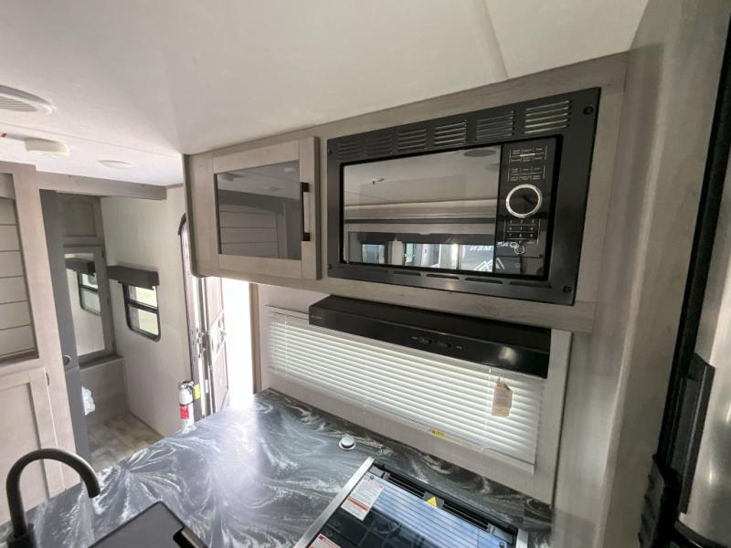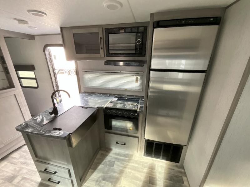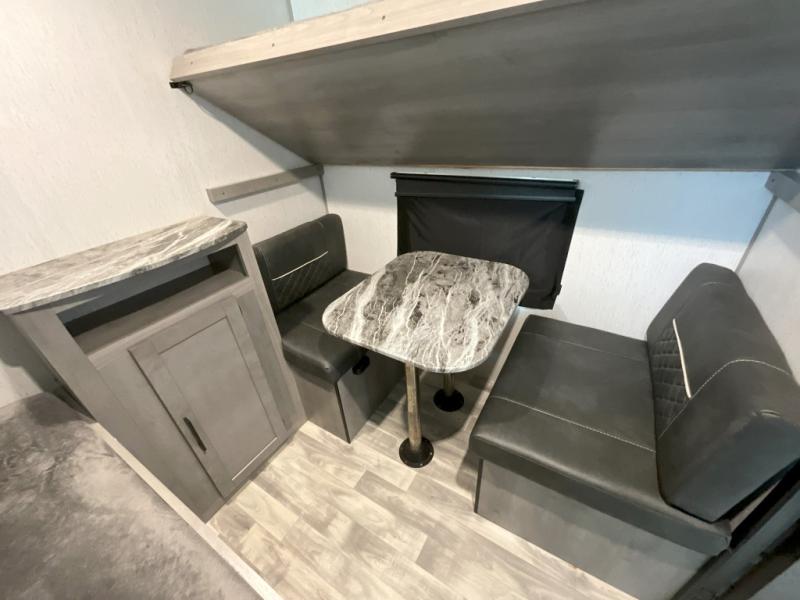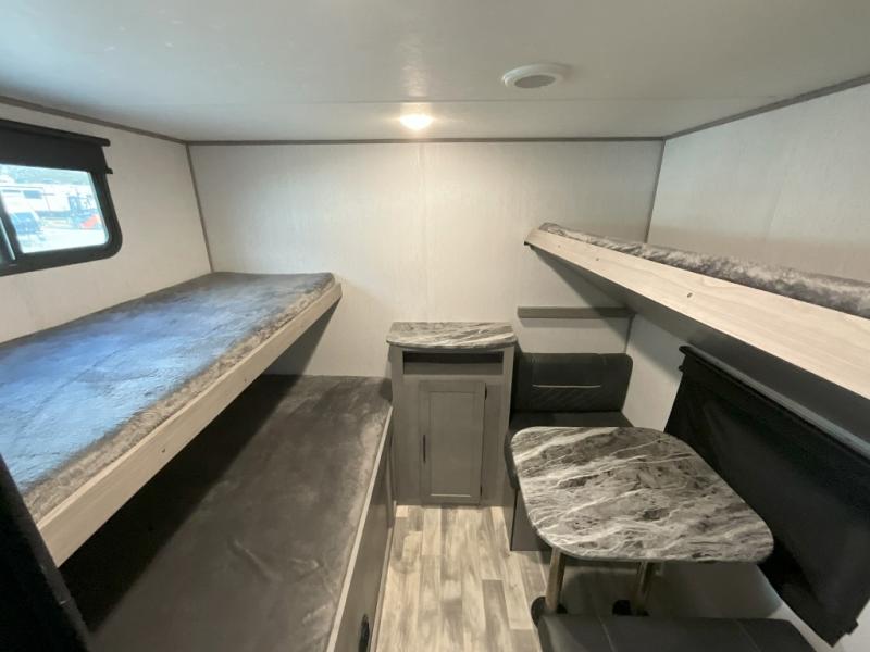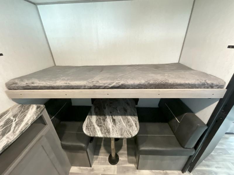 If you've been looking for a lightweight travel trailer with a large sleeping capacity, your search is over! This model can sleep nine comfortably between the queen bed, the furniture within the large slide out, and the private bunkhouse. Your group will love to visit under the 18' power awning with LED lights, especially while dinner is being made on the outside kitchen. If the weather isn't cooperating, just head indoors for game night around the U-shaped dinette!
