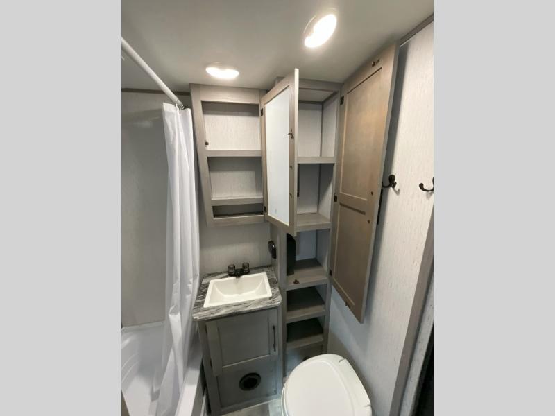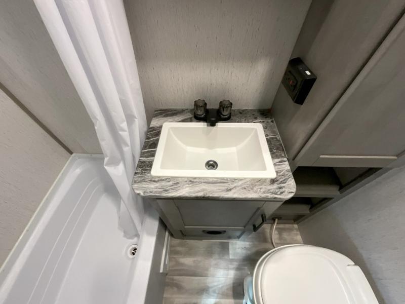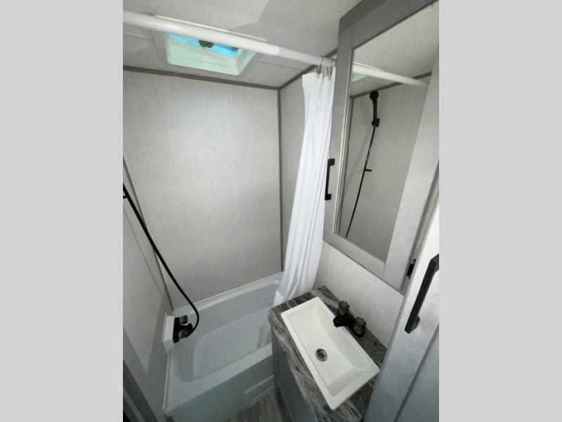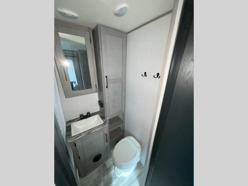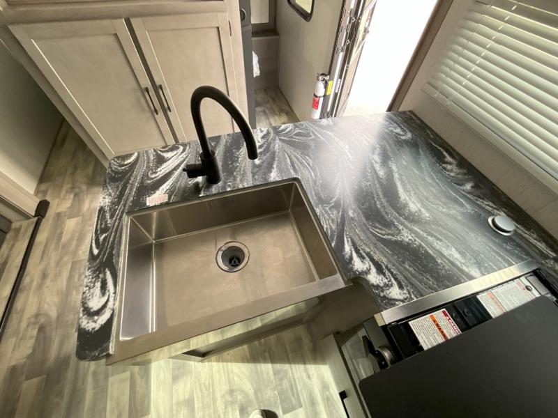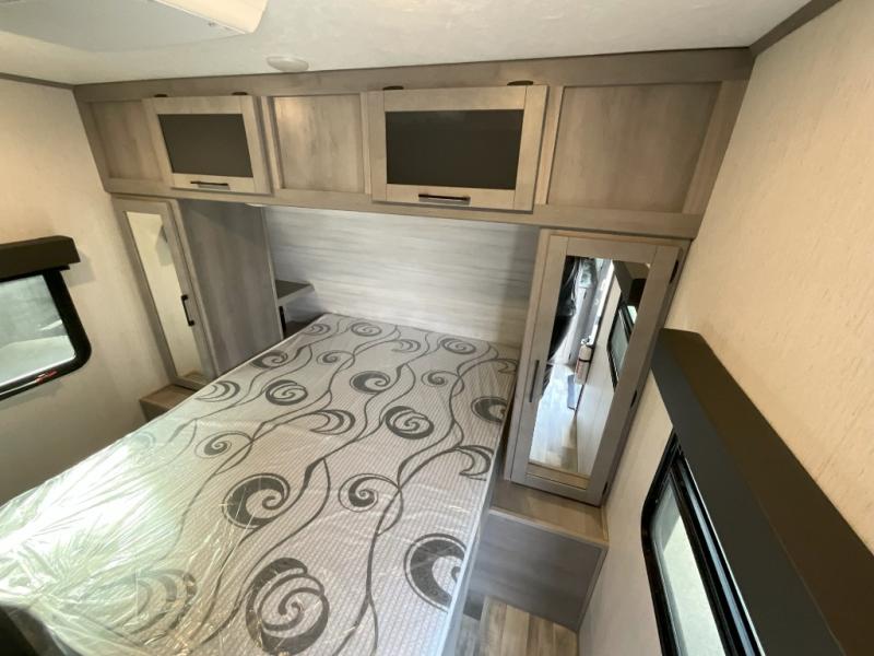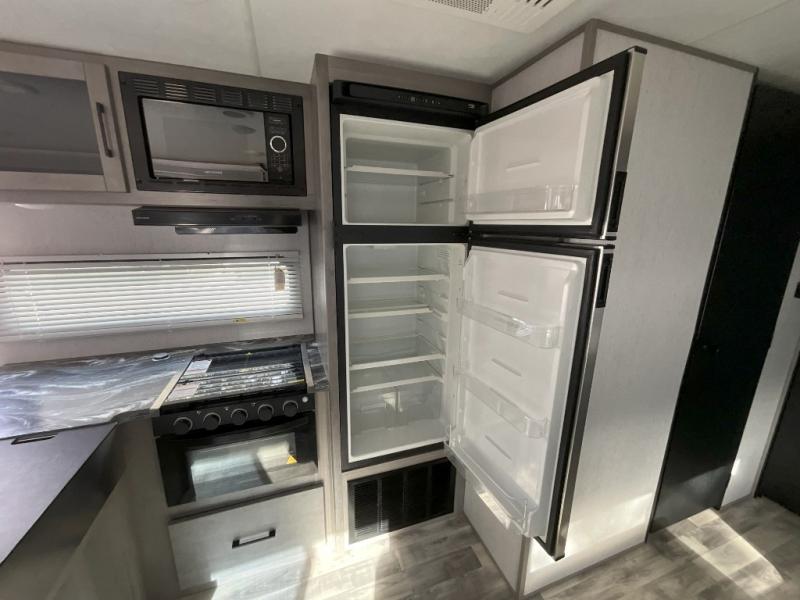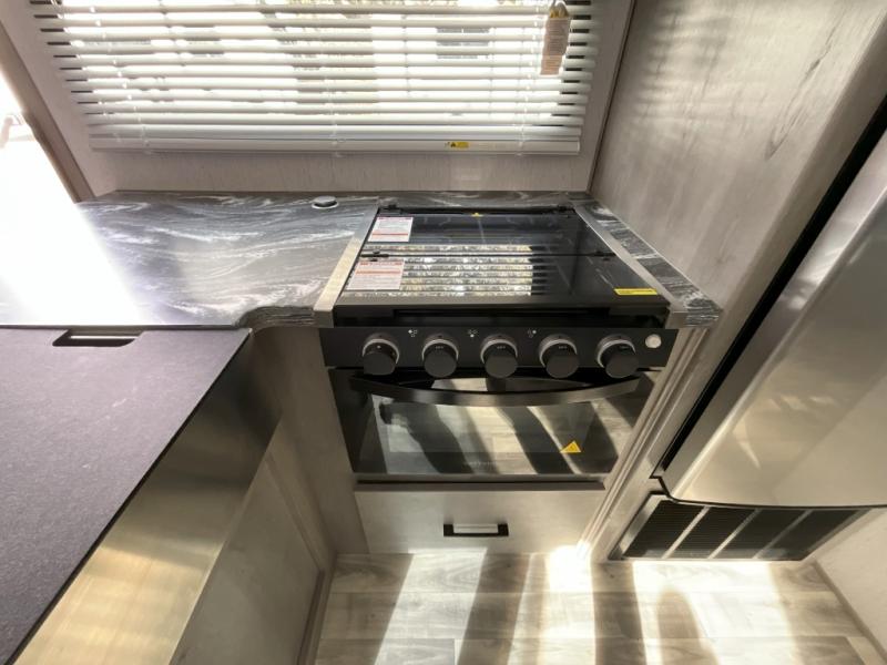 If you've been looking for a lightweight travel trailer with a large sleeping capacity, your search is over! This model can sleep nine comfortably between the queen bed, the furniture within the large slide out, and the private bunkhouse. Your group will love to visit under the 18' power awning with LED lights, especially while dinner is being made on the outside kitchen. If the weather isn't cooperating, just head indoors for game night around the U-shaped dinette!