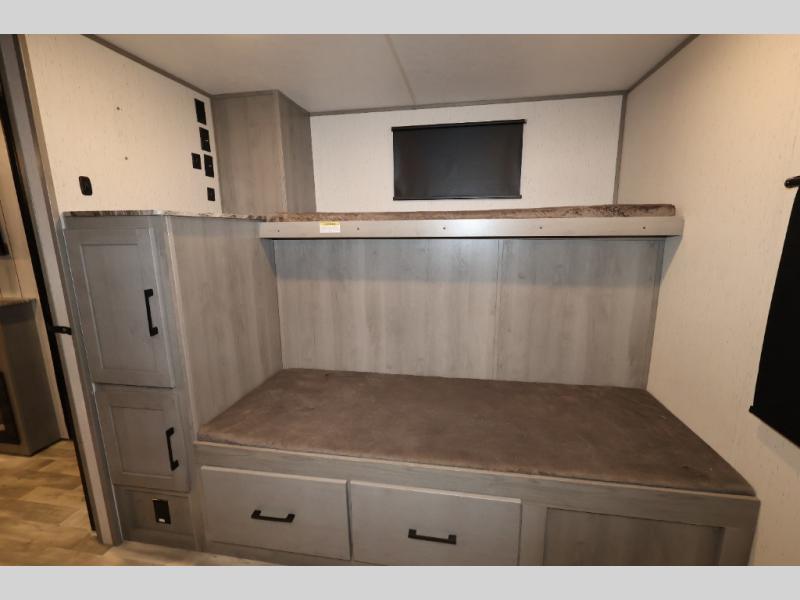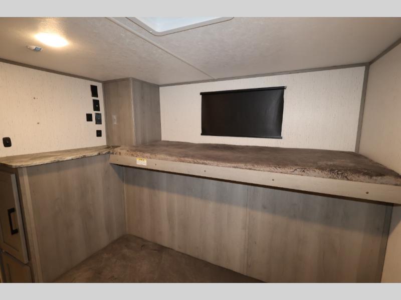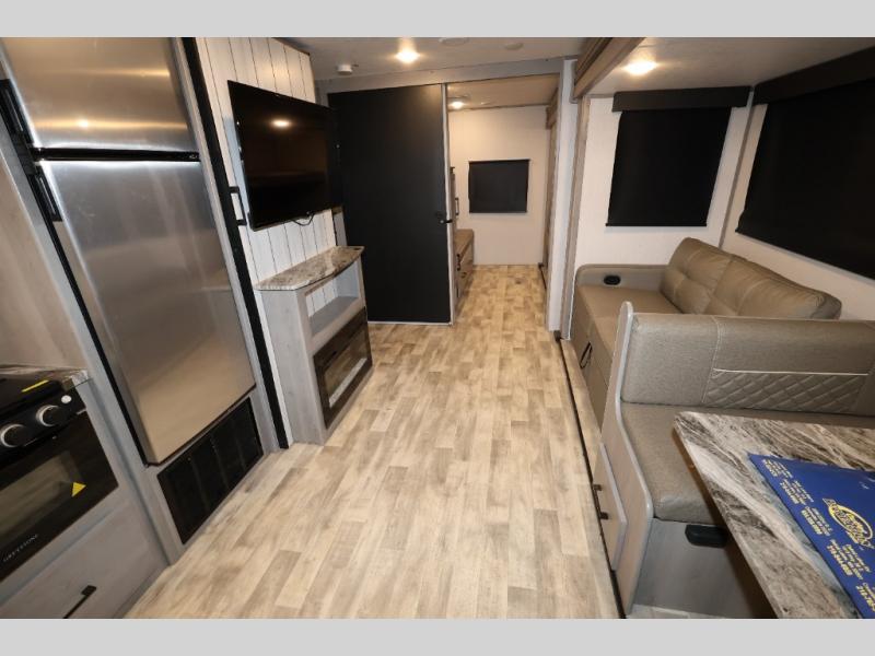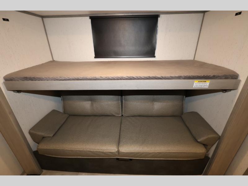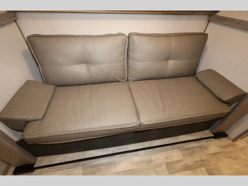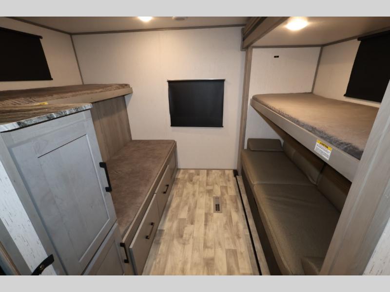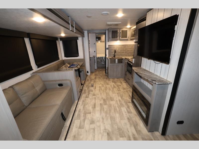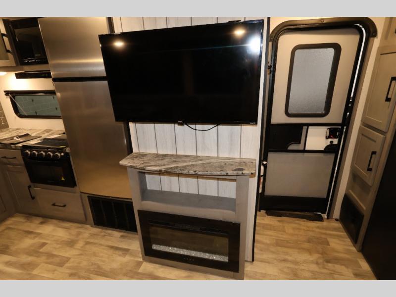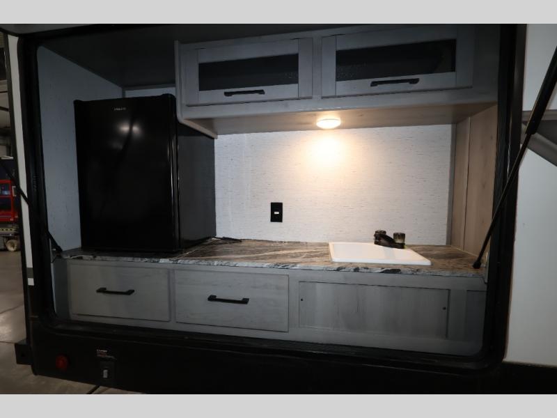 It will be so easy camping with friends in this spacious travel trailer with double slides and a rear private bunkhouse. Once you're set up at the campsite, prepare lunch on the outside kitchen and relax under the 18' power awning with LED lights. You may just decide to grab the fishing poles from the pass-through storage and head down to the river. Everyone can meet in the main living area around the U-shaped dinette or on the sofa, and the fireplace here will make it feel more like home.