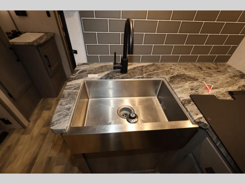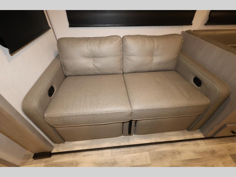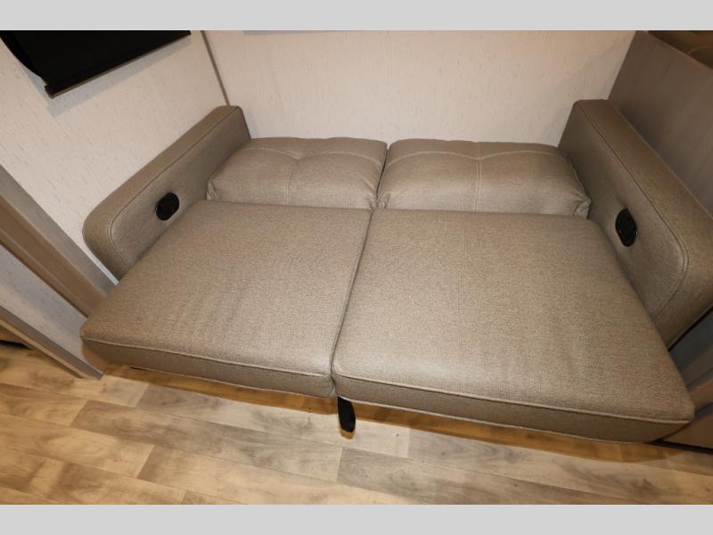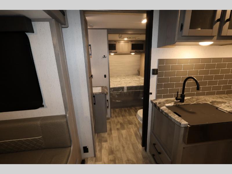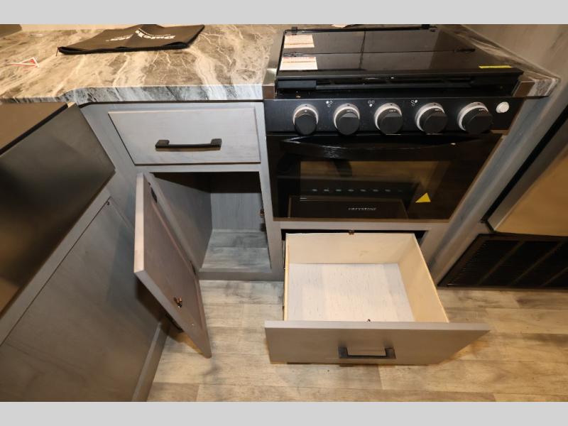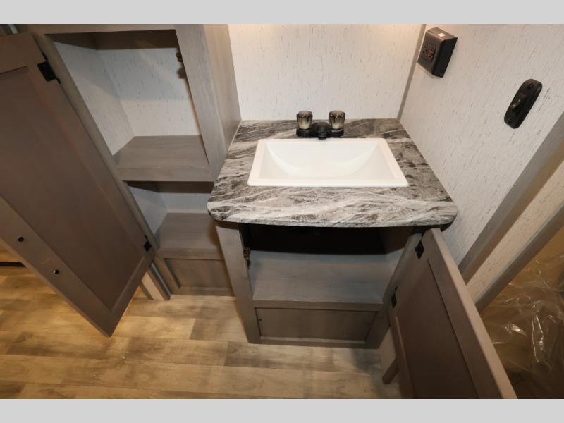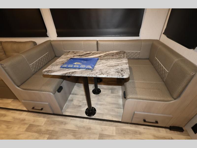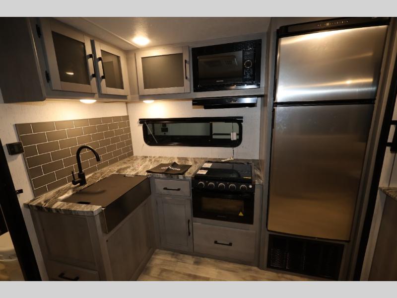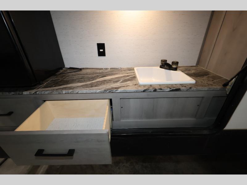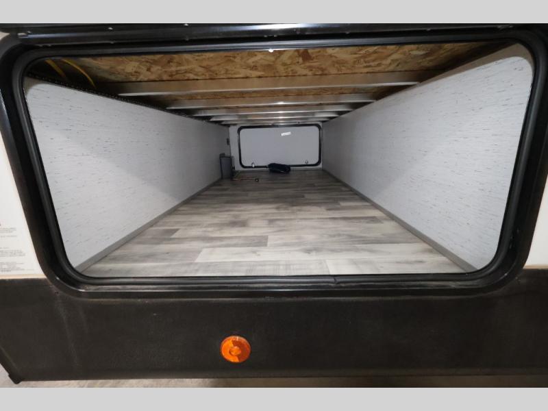 It will be so easy camping with friends in this spacious travel trailer with double slides and a rear private bunkhouse. Once you're set up at the campsite, prepare lunch on the outside kitchen and relax under the 18' power awning with LED lights. You may just decide to grab the fishing poles from the pass-through storage and head down to the river. Everyone can meet in the main living area around the U-shaped dinette or on the sofa, and the fireplace here will make it feel more like home.