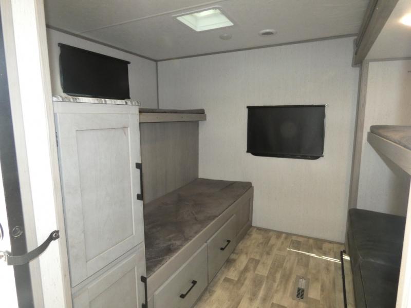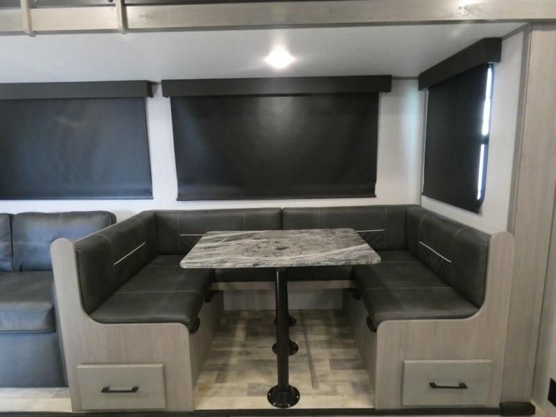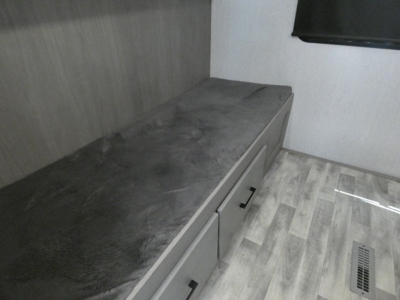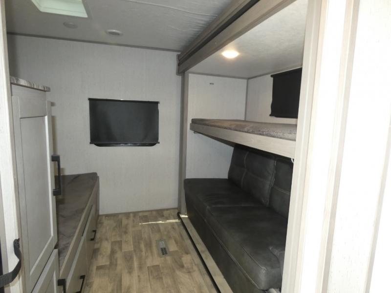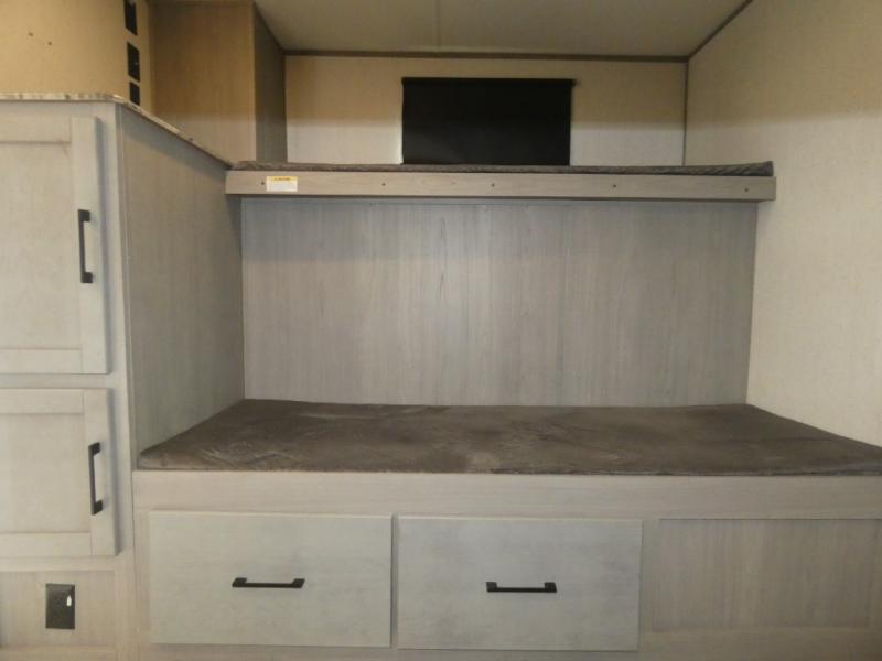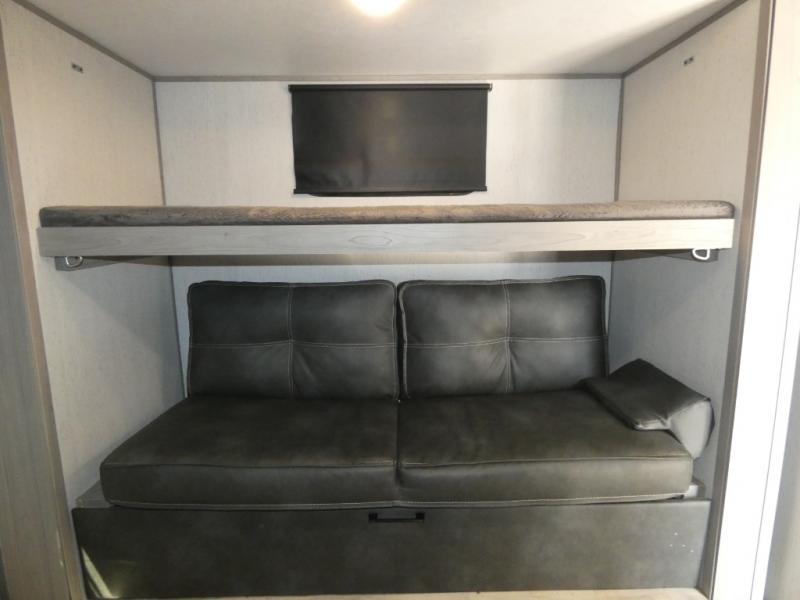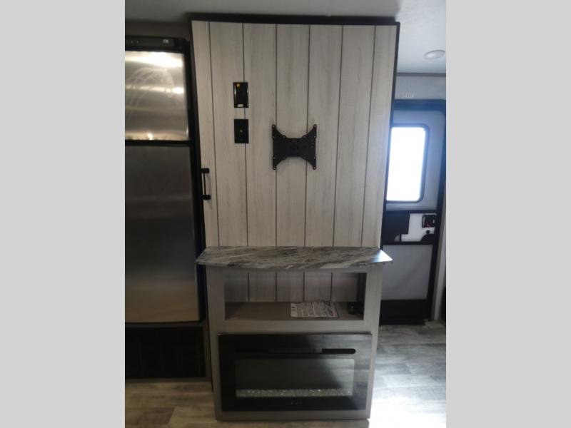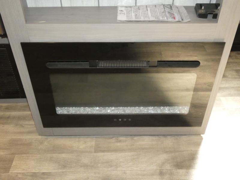 It will be so easy camping with friends in this spacious travel trailer with double slides and a rear private bunkhouse. Once you're set up at the campsite, prepare lunch on the outside kitchen and relax under the 18' power awning with LED lights. You may just decide to grab the fishing poles from the pass-through storage and head down to the river. Everyone can meet in the main living area around the U-shaped dinette or on the sofa, and the fireplace here will make it feel more like home.