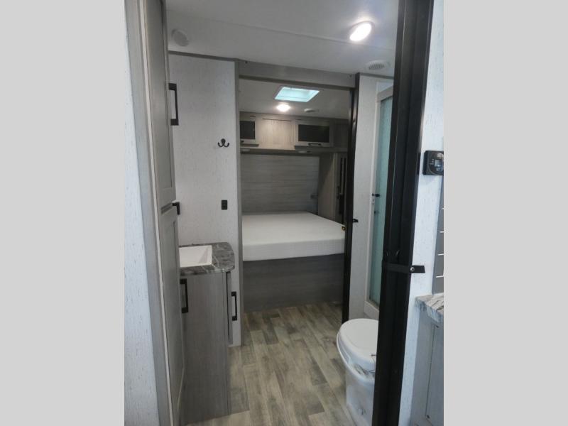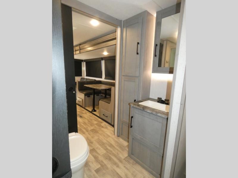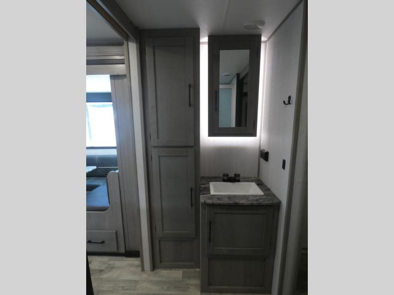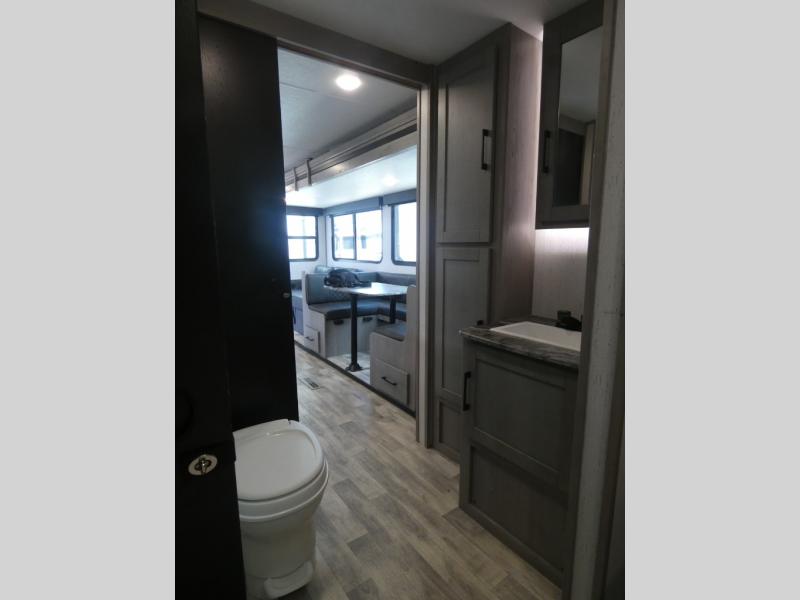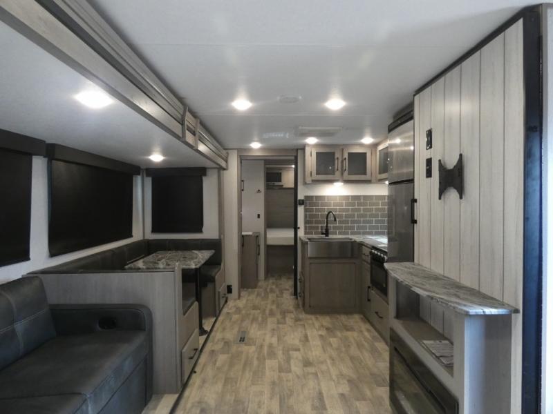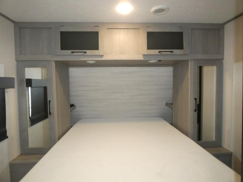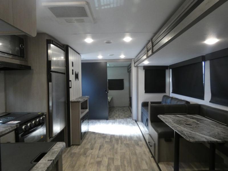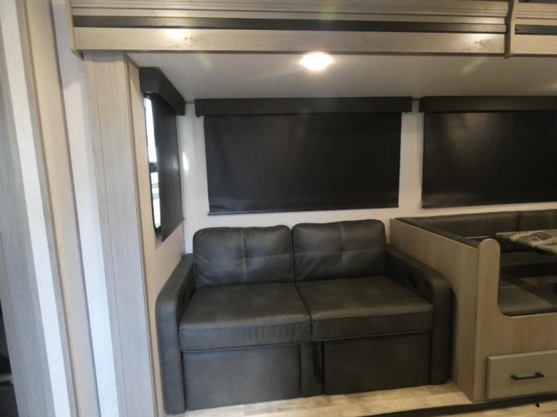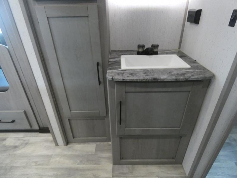 It will be so easy camping with friends in this spacious travel trailer with double slides and a rear private bunkhouse. Once you're set up at the campsite, prepare lunch on the outside kitchen and relax under the 18' power awning with LED lights. You may just decide to grab the fishing poles from the pass-through storage and head down to the river. Everyone can meet in the main living area around the U-shaped dinette or on the sofa, and the fireplace here will make it feel more like home.