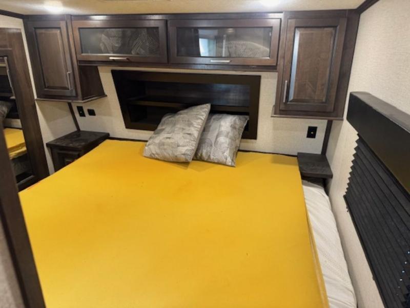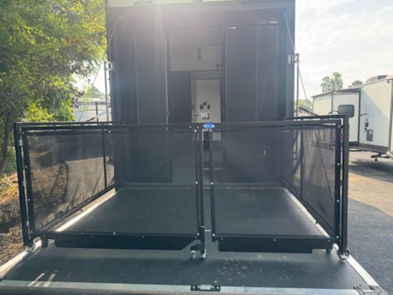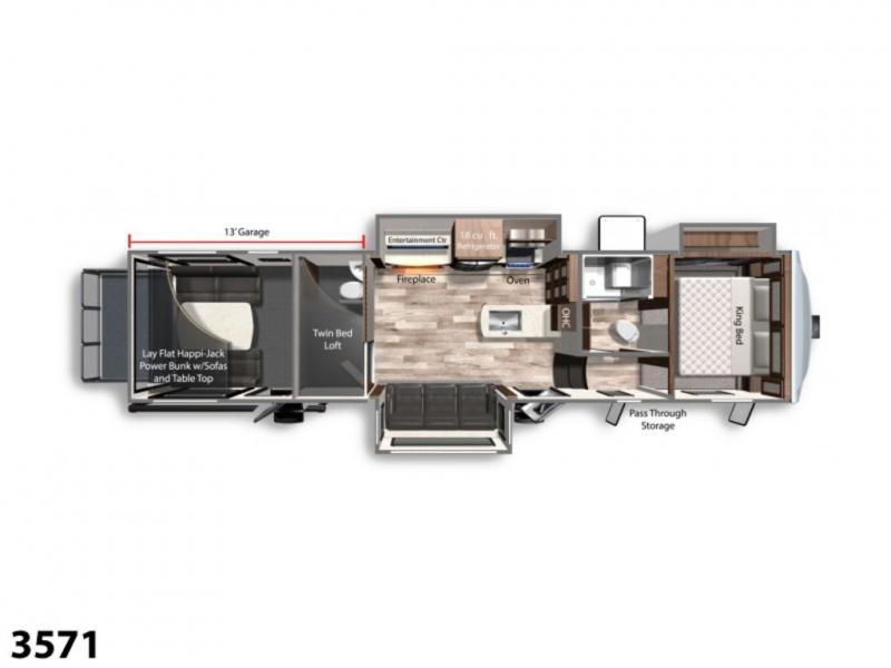 Head to the lake for unforgettable weekends riding the trails and kicking up some mud with this toy hauler in tow! Once you remove your toys from the 13' separate garage, you can set up the roll-over sofas that include a table in between them, and there is a convenient half bath here. Your guests can make this their bedroom at night, plus there is a Happi-Jack power bunk and a loft with a twin-size bed for the little ones! The main living area will be a favorite spot to hang since there are dual opposing slides for tons of space, an upgraded heat and massage sofa, plus a 50" TV with a fireplace below it for a more cozy feel. And check out the front private bedroom with a king-size bed and a slide out wardrobe to keep your clothes neat and tidy!
