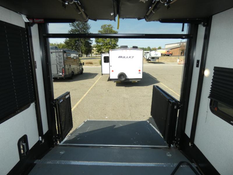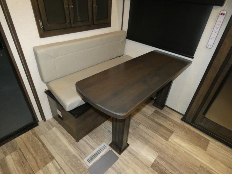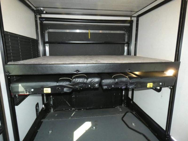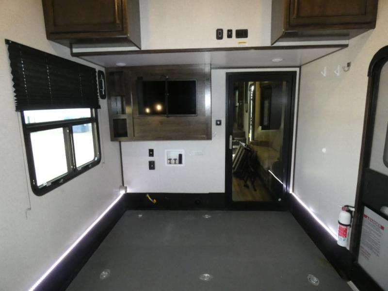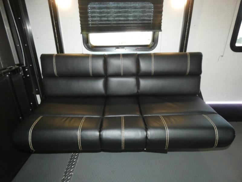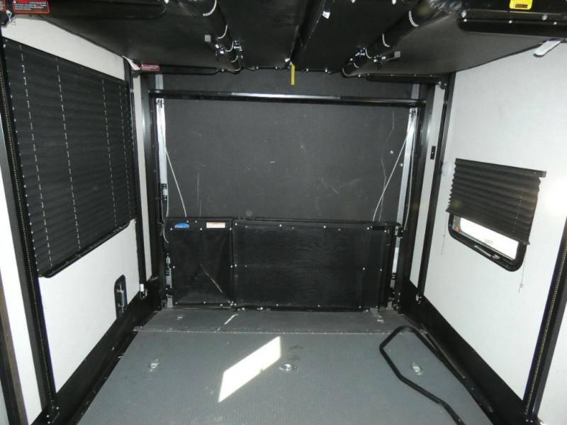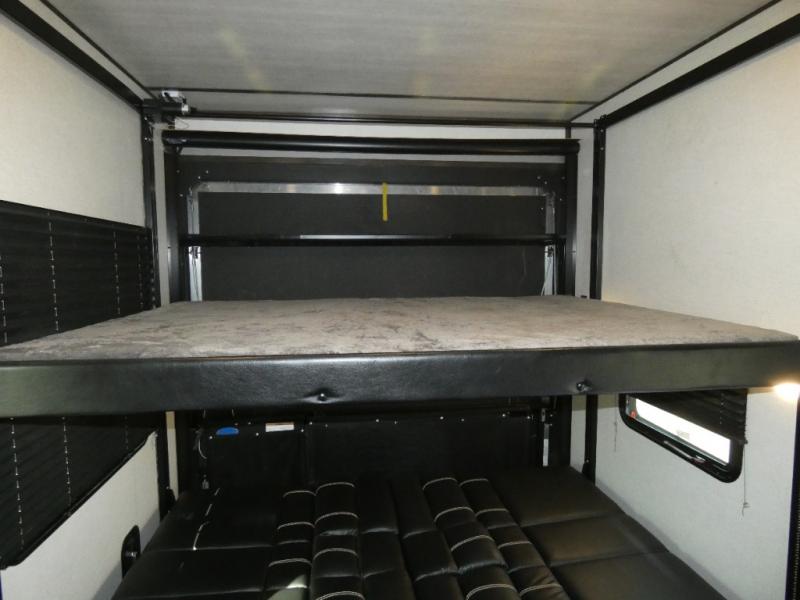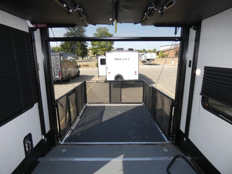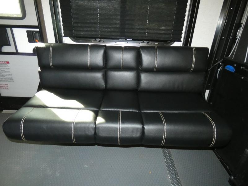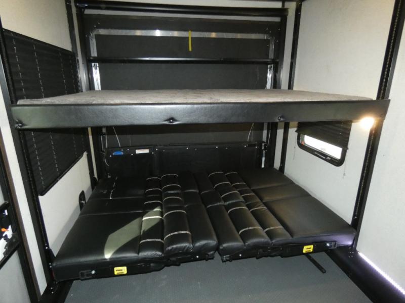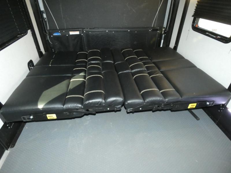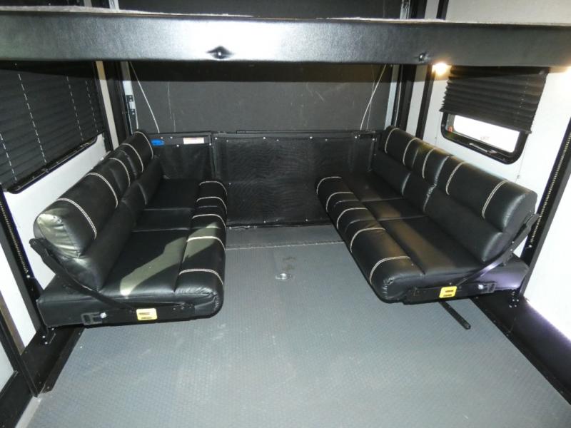 This Voltage toy hauler is what you need if you are the type of traveler that appreciates luxury! The entire unit is loaded with more amenities than you'll know what to do with, like an 18-cubic foot refrigerator, a garage TV, a heated and massaging residential sofa, a 30" residential microwave, a USB charging station, and a 50" LCD HDTV in the main living area. For comfort, there is a king-size bed in the front master suite, and once you remove the toys from the garage, there is a Happi-Jack power bunk above two sofas with a table top to use for dining or sleeping. For regular dining in the main living area, you can sit at the half booth dinette that is incorporated into the kitchen.