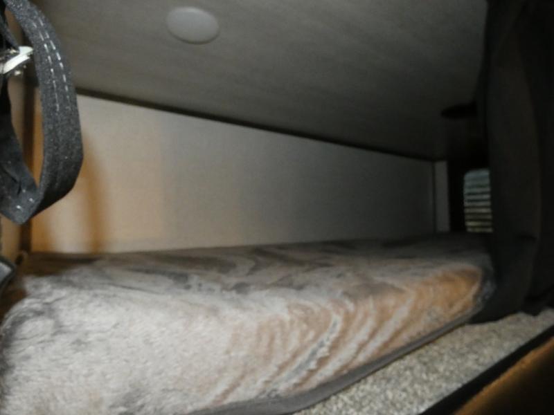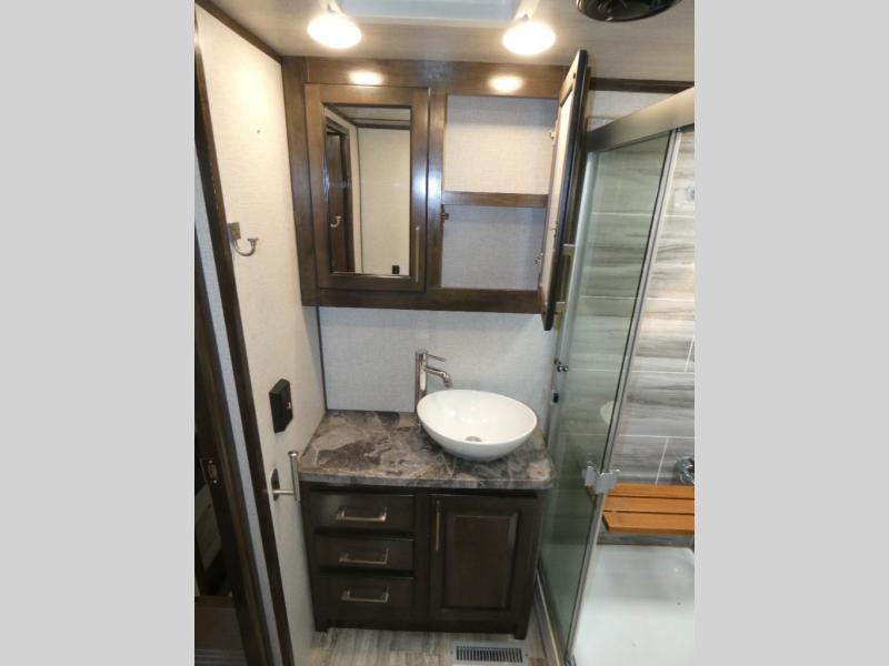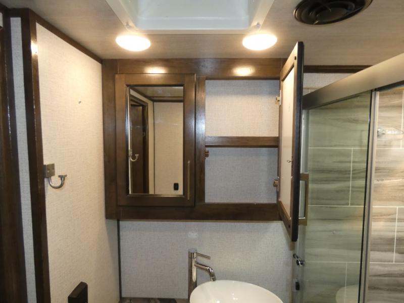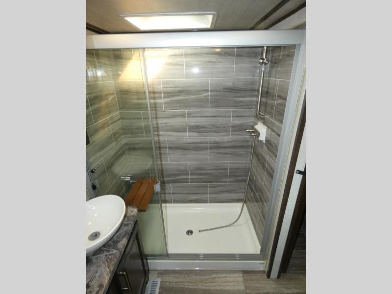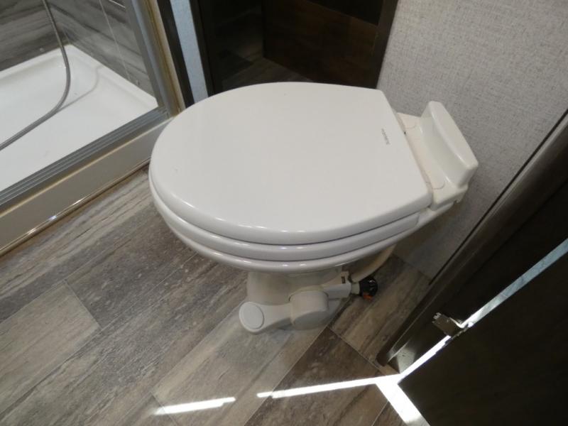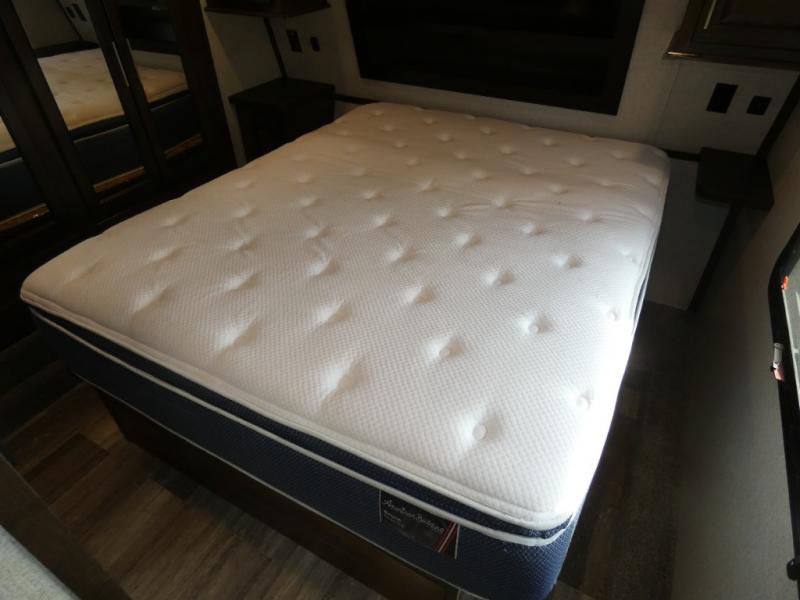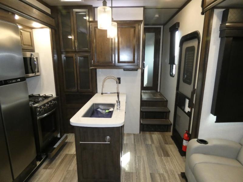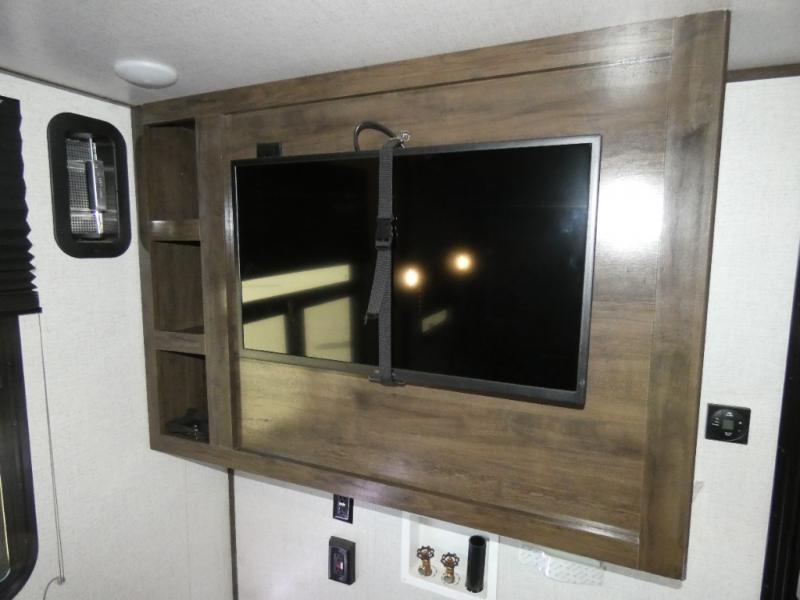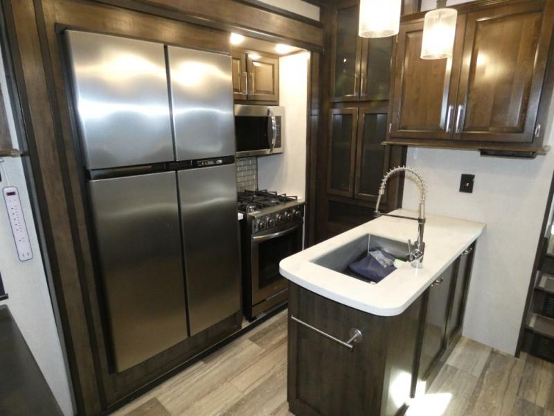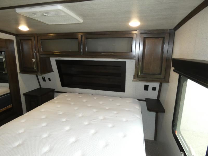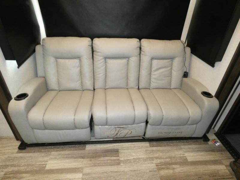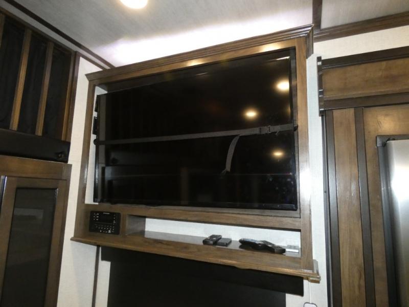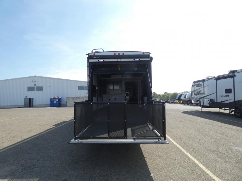 This Voltage toy hauler is what you need if you are the type of traveler that appreciates luxury! The entire unit is loaded with more amenities than you'll know what to do with, like an 18-cubic foot refrigerator, a garage TV, a heated and massaging residential sofa, a 30" residential microwave, a USB charging station, and a 50" LCD HDTV in the main living area. For comfort, there is a king-size bed in the front master suite, and once you remove the toys from the garage, there is a Happi-Jack power bunk above two sofas with a table top to use for dining or sleeping. For regular dining in the main living area, you can sit at the half booth dinette that is incorporated into the kitchen.