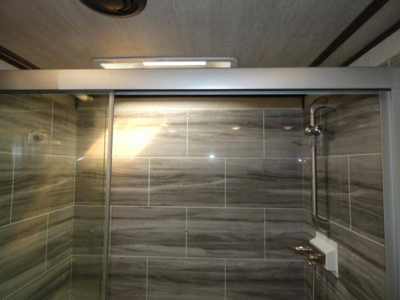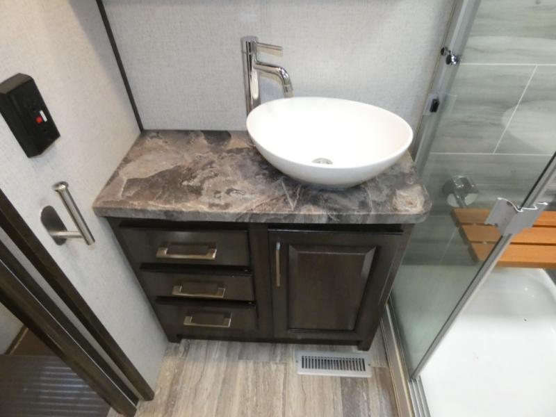 The Dutchmen Voltage toy hauler is an amazing RV that won't disappoint! These elegant units have more durability and luxury than you ever thought possible. They include an All Weather Package, 16" custom wheels, a gel-coat fiberglass exterior finish, MorRyde CRE 3000 suspension, Secure Stance entry steps, and a second fuel tank for a total of 60 gallons. There is a second power awning over the garage entry door, and you will even find a third awning above the ramp patio. The tinted frameless windows will protect you from outside prying eyes and harsh sunlight, and the interior solid-surface countertops in the kitchen will withstand many years of chopping and dicing. You'll also have a 12" diamond plate in the garage for protection, and there is an aluminum four-step entry that leads right into the garage.