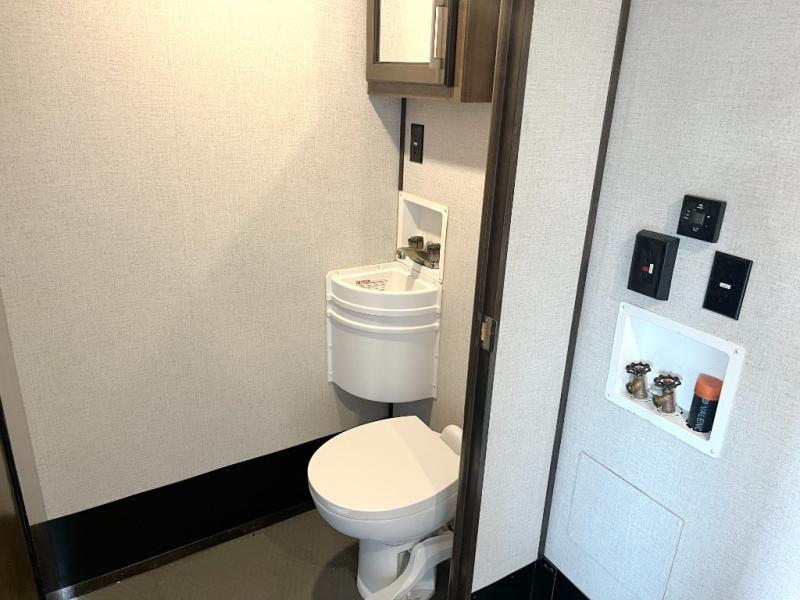Wow! Check out this spacious toy hauler with a bath and a half, triple slides for added space, and sleeping space for up to ten if the living room sofas are used. The living area includes three sofas, plus a 50" TV to keep you busy on those rainy days. Head to the kitchen to prepare lunch at the U-shaped counter, and there is a three burner cooktop with a 21" oven if you want to bake a casserole for dinner. The 13' separate garage will be perfect to carry all your favorite ride-on toys, plus your guests can stay here since there is a Happi-Jack power bunk, two roll-over sofas, a loft, plus a half bath!