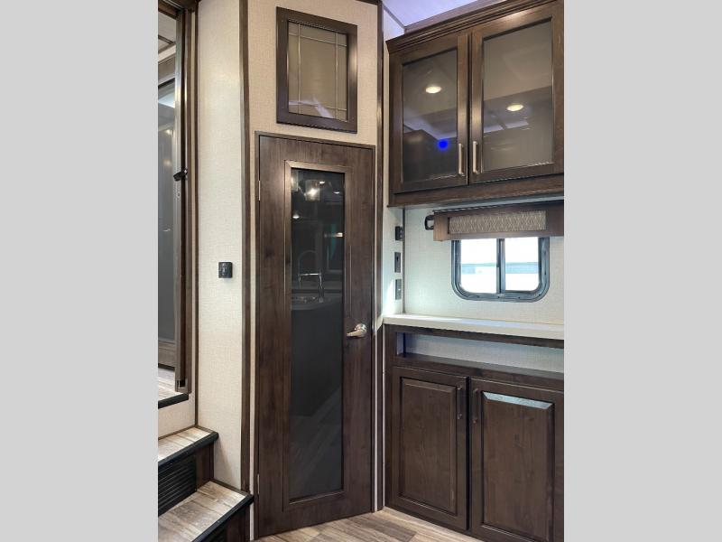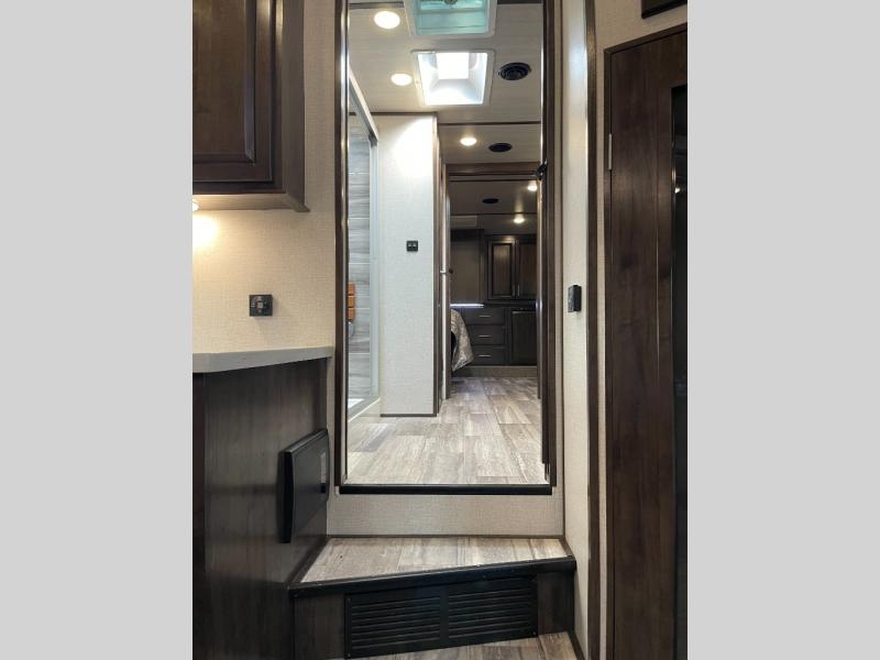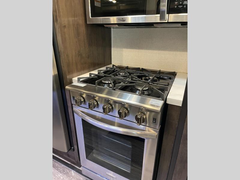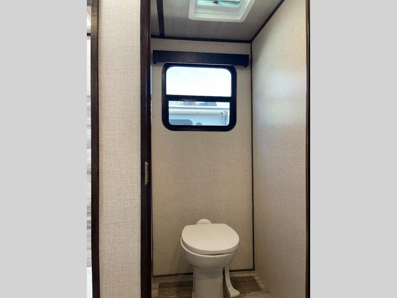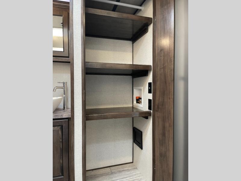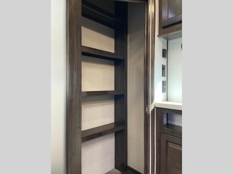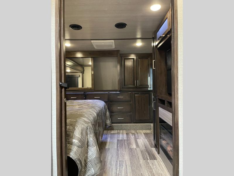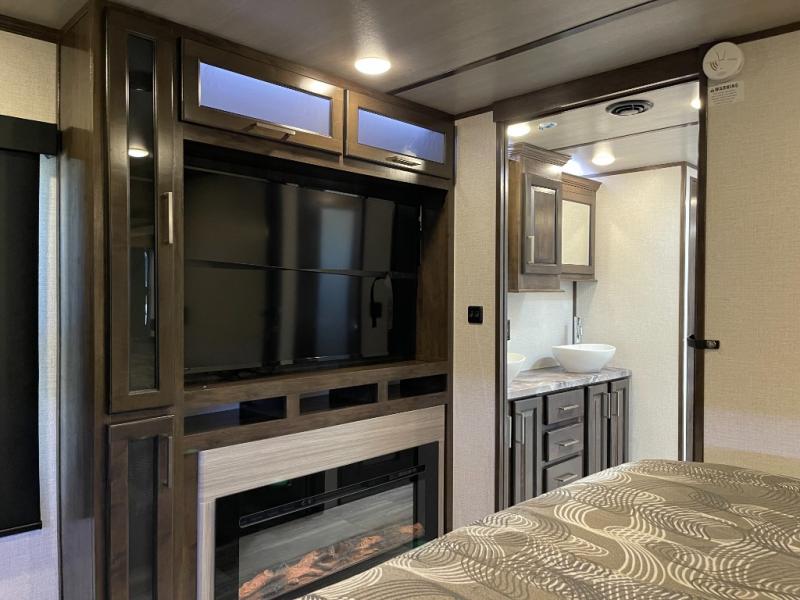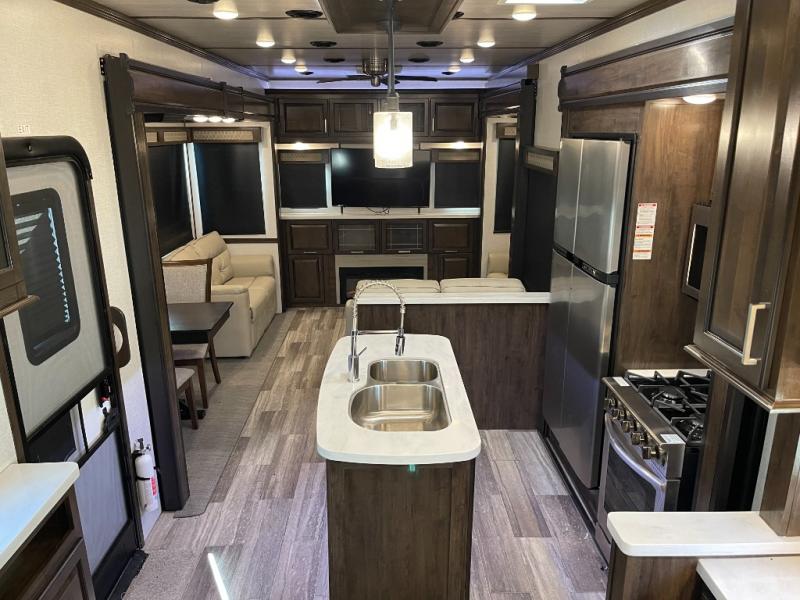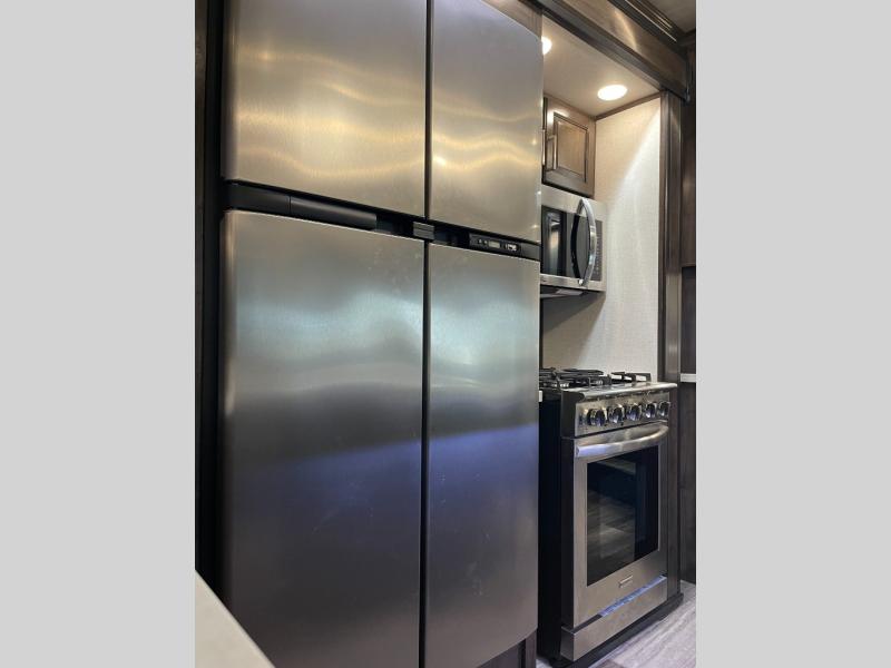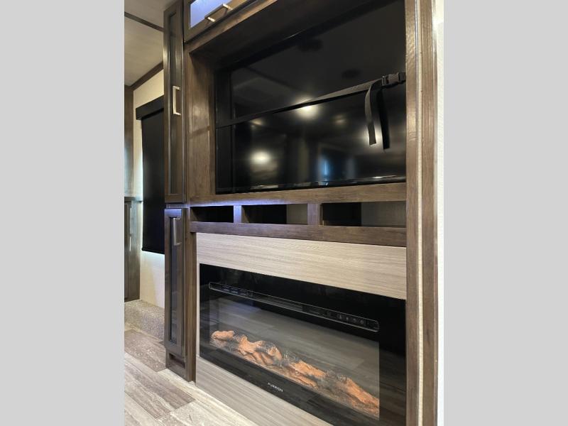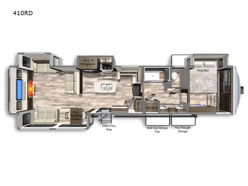 This Yukon fifth wheel will keep you coming back for more! It offers you a fully featured living room with a 50" TV, fireplace, and three sofas. A free-standing dinette sits in between the living room and the kitchen, so you can sit down here to eat while still watching the TV. The kitchen incorporates the largest oven in the industry into its design so that you can cook just like a real chef, and the 18-cubic foot refrigerator provides an enormous amount of food storage. The exterior also has storage space for camping equipment in the slide-out storage tray and pass-through storage. You'll also have a pull-out laundry hamper in the bedroom where you can put your dirty clothes.