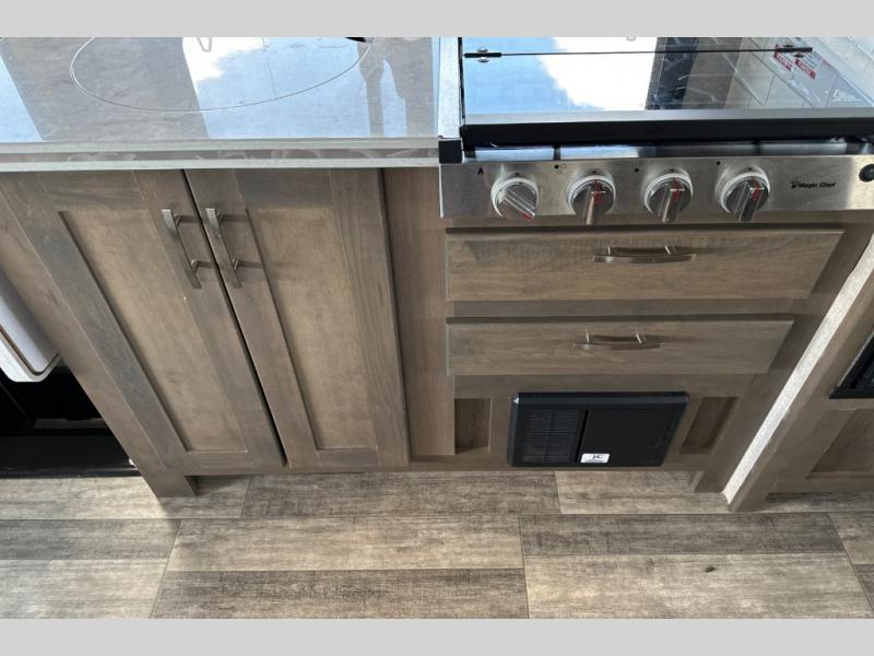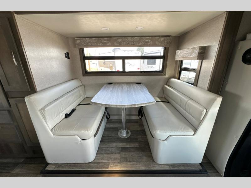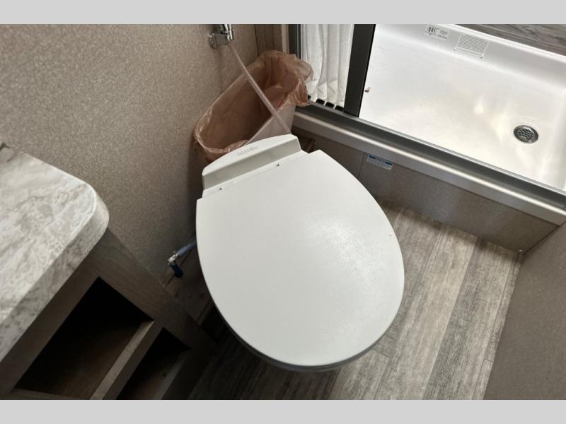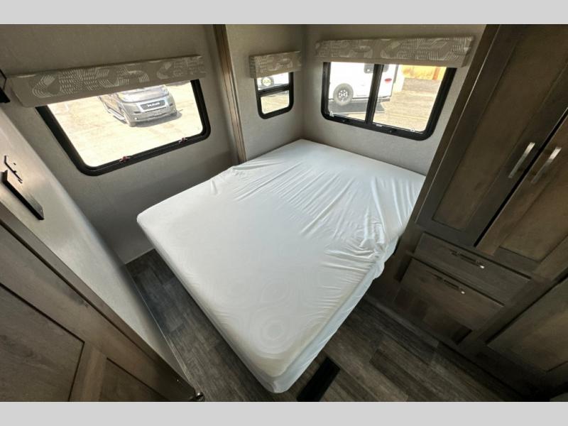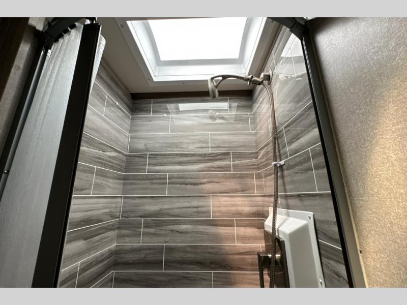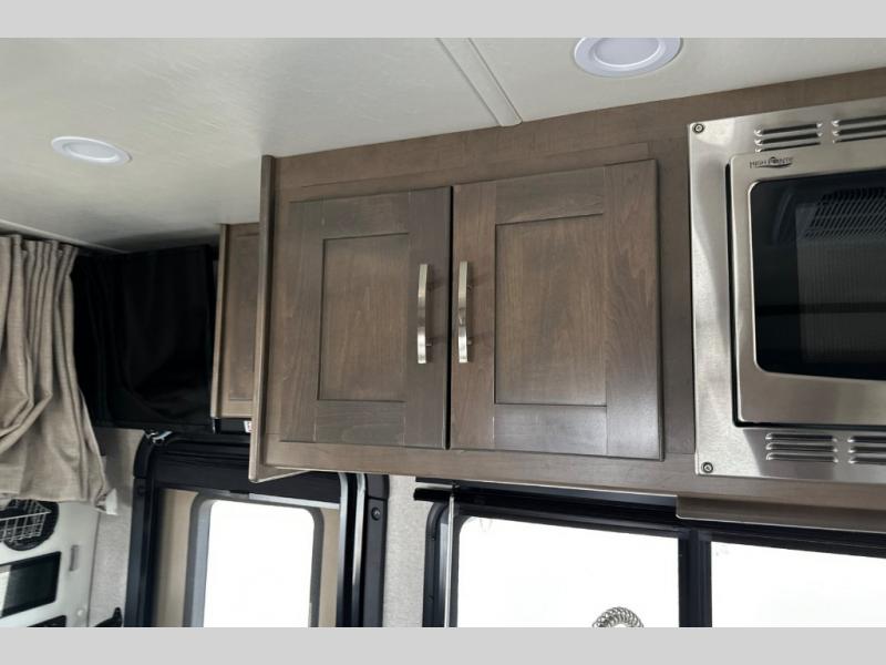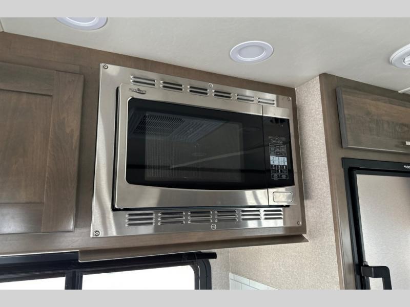 Take this motorhome on your greatest adventures yet! Start each morning feeling well rested after sleeping on the corner queen bed then head to the rear corner bathroom to freshen up in the shower with an Oxygenics body spa RV shower head and a skylight above for added headroom and natural lighting. Now that you're ready for the day, you can grab some eggs from the 6 cu. ft. double door refrigerator and fry them up on the three burner cooktop then enjoy them at the booth dinette. The kitchen also has a countertop extension for more meal prepping space and a convection microwave oven to pop a bag of popcorn before watching your favorite movies on either the living room 32" LED TV or the 32" LED smart TV across from the bed. You could even switch things up by replacing the booth dinette for either the optional tri-fold sofa with table or the optional three seat power recliner, and even add an optional cab over bunk too!