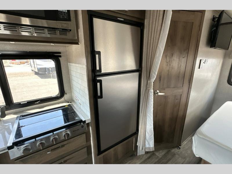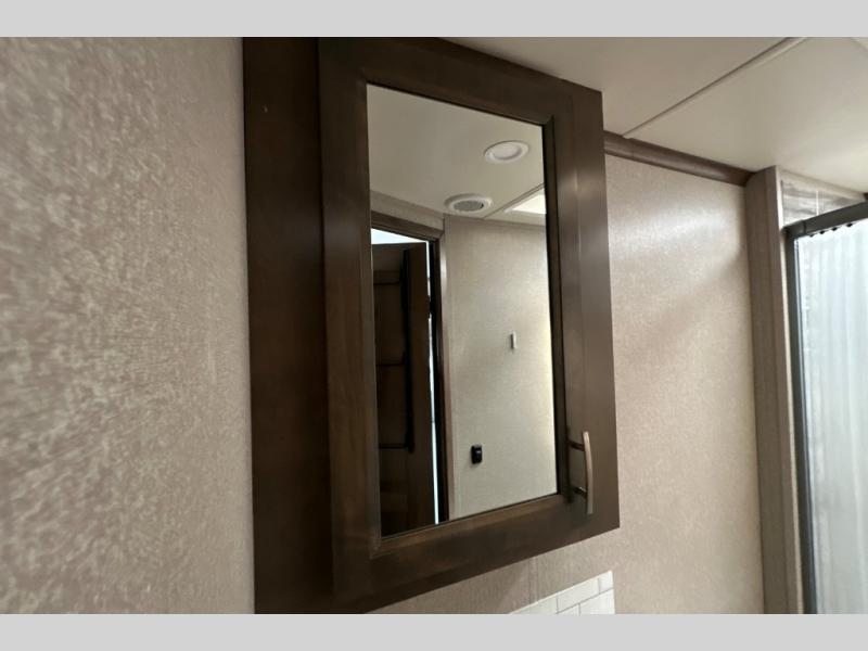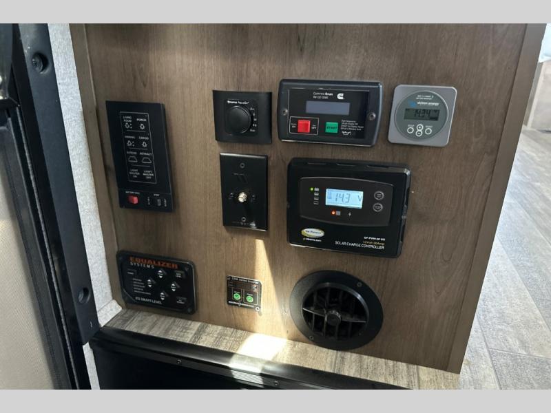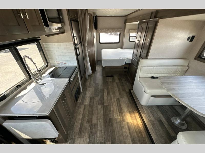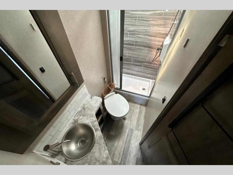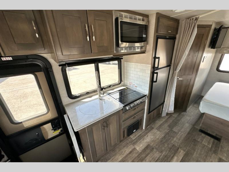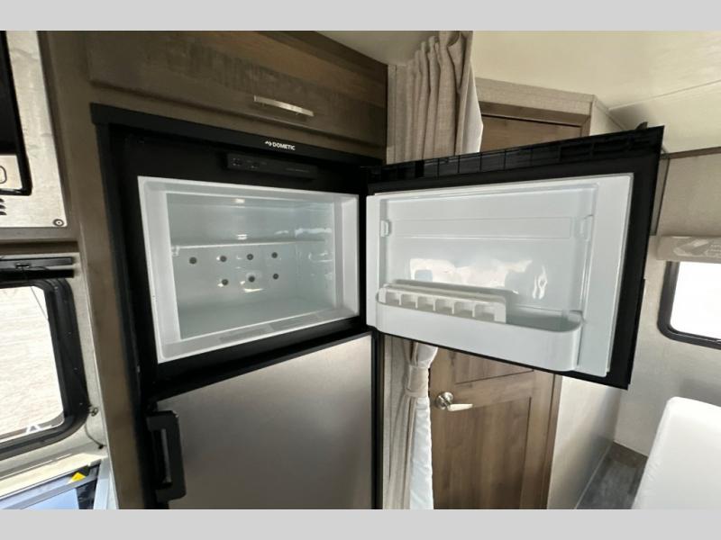 Take this motorhome on your greatest adventures yet! Start each morning feeling well rested after sleeping on the corner queen bed then head to the rear corner bathroom to freshen up in the shower with an Oxygenics body spa RV shower head and a skylight above for added headroom and natural lighting. Now that you're ready for the day, you can grab some eggs from the 6 cu. ft. double door refrigerator and fry them up on the three burner cooktop then enjoy them at the booth dinette. The kitchen also has a countertop extension for more meal prepping space and a convection microwave oven to pop a bag of popcorn before watching your favorite movies on either the living room 32" LED TV or the 32" LED smart TV across from the bed. You could even switch things up by replacing the booth dinette for either the optional tri-fold sofa with table or the optional three seat power recliner, and even add an optional cab over bunk too!