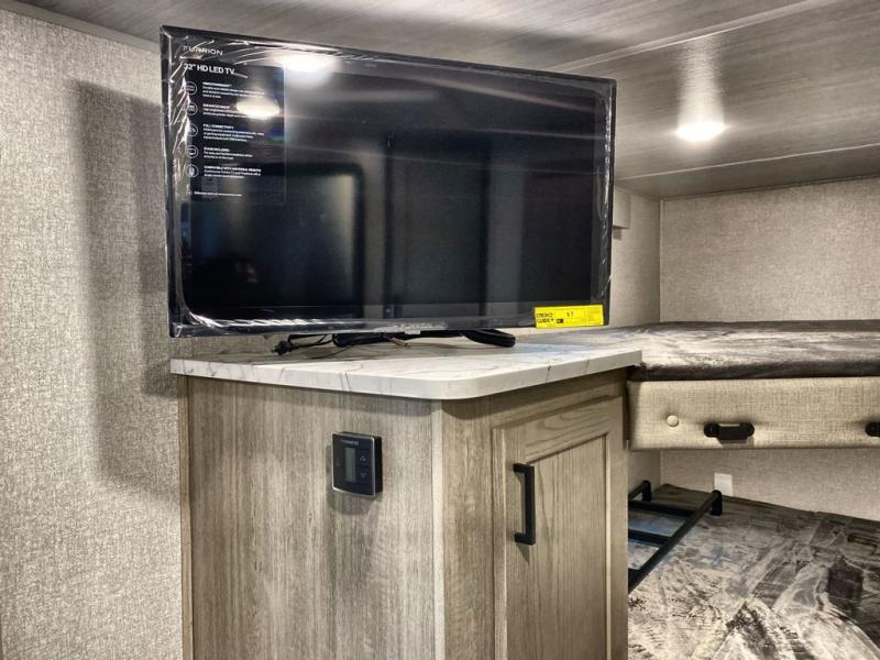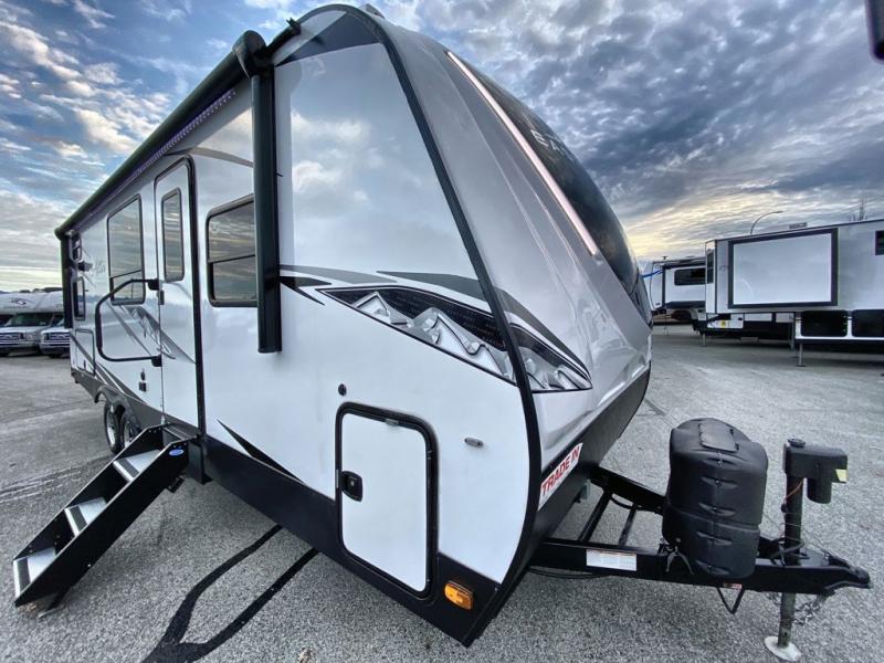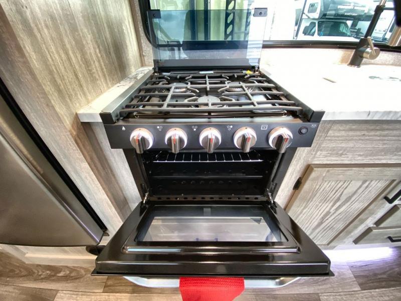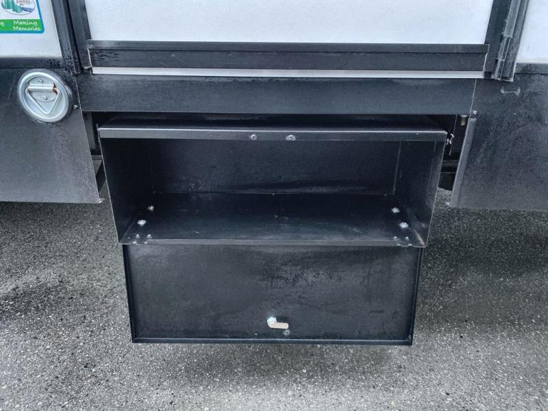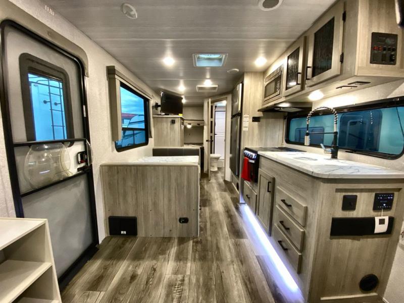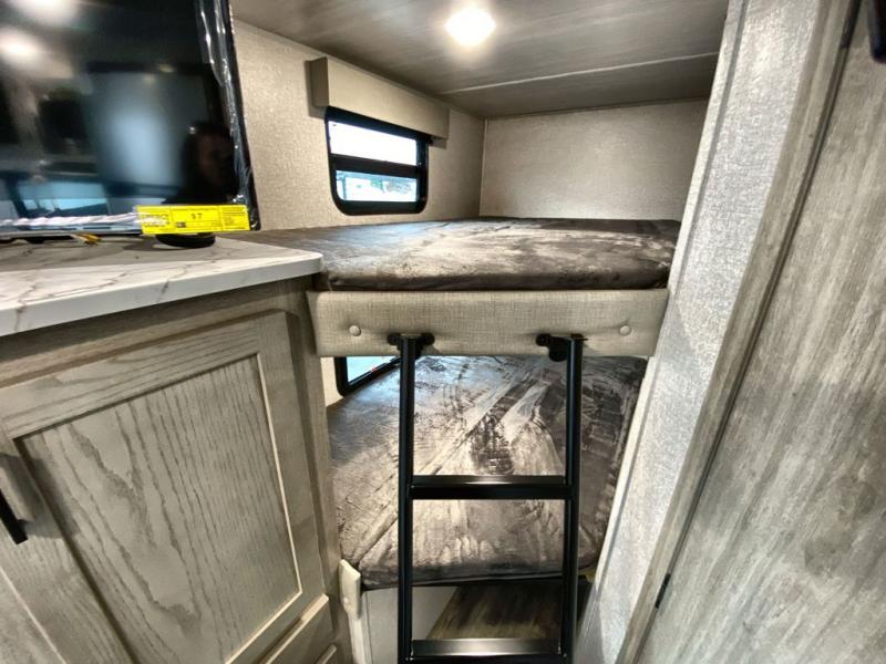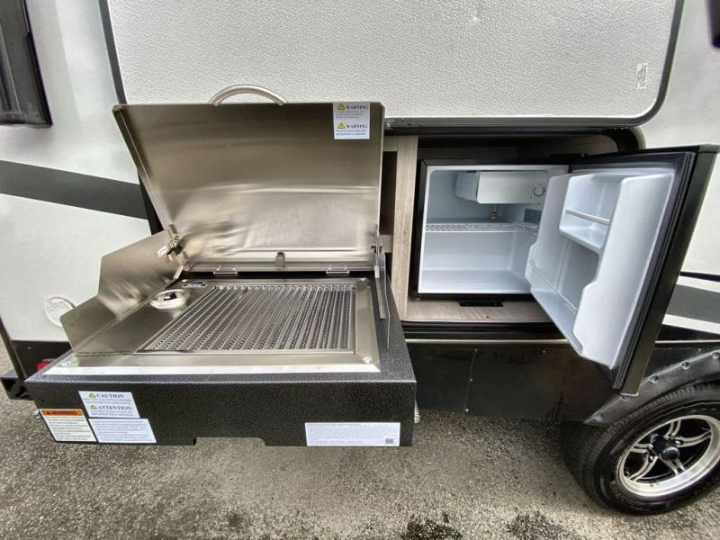 Pack up the family or make it a friends trip in this roomy travel trailer. Once you arrive at the campground, unload the pass-through storage, set up the 18' power awning with LED lights, and start lunch on the pull-out grill. You'll find a three burner cooktop and microwave oven indoors if the weather isn't cooperating, and you can dine at the booth dinette that includes under-dinette storage. You will love the versatility the queen Murphy bed adds by allowing you to relax on the sofa during they day, and sleep on the bed at night. And don't overlook the double-size bunks that will be a big hit with the little ones!