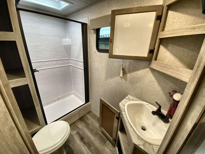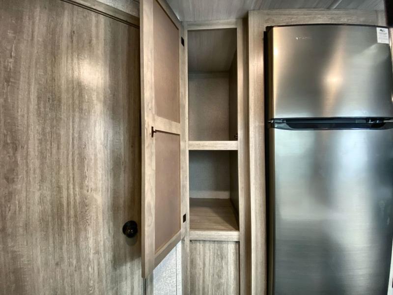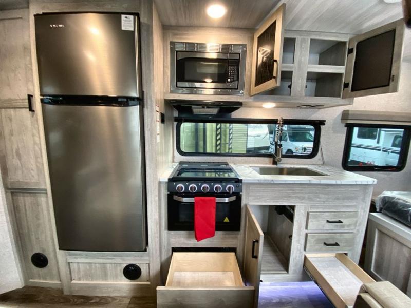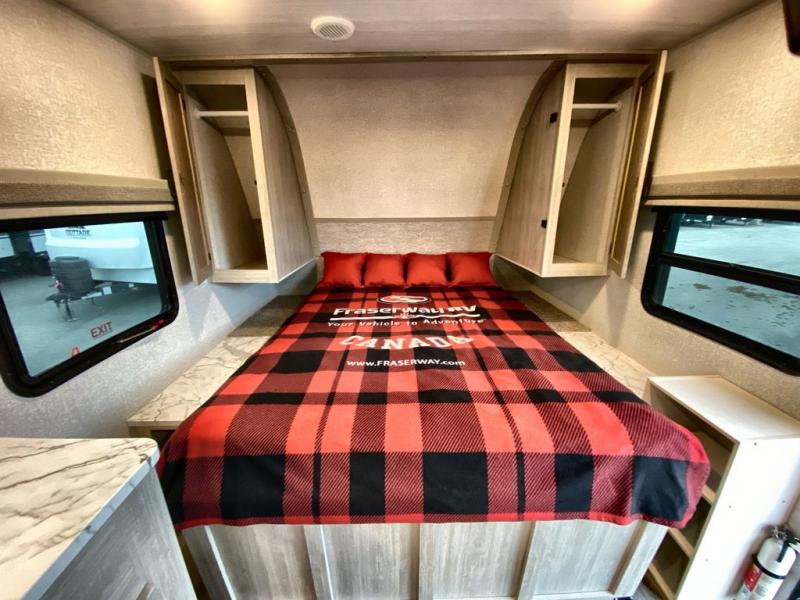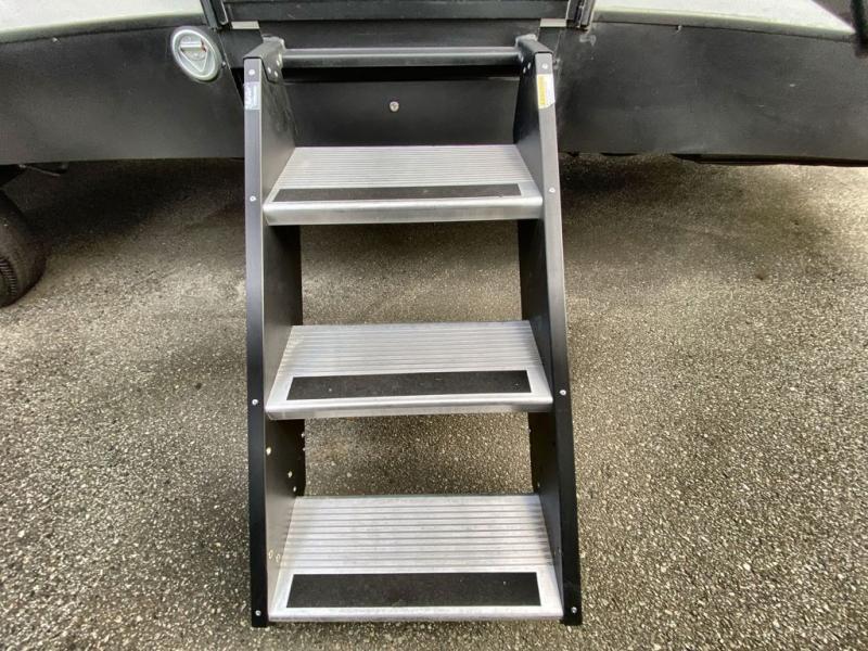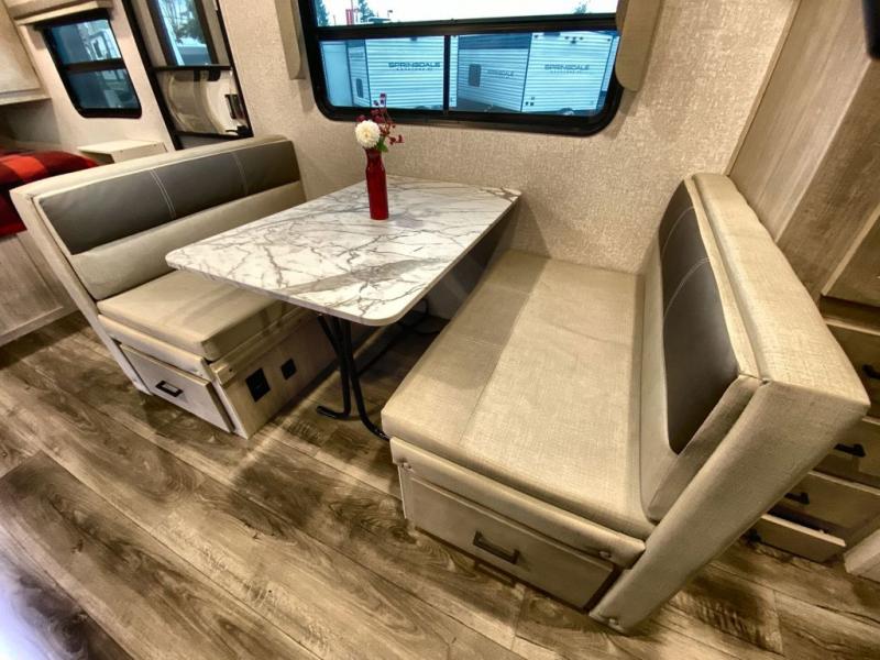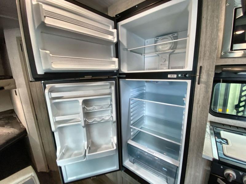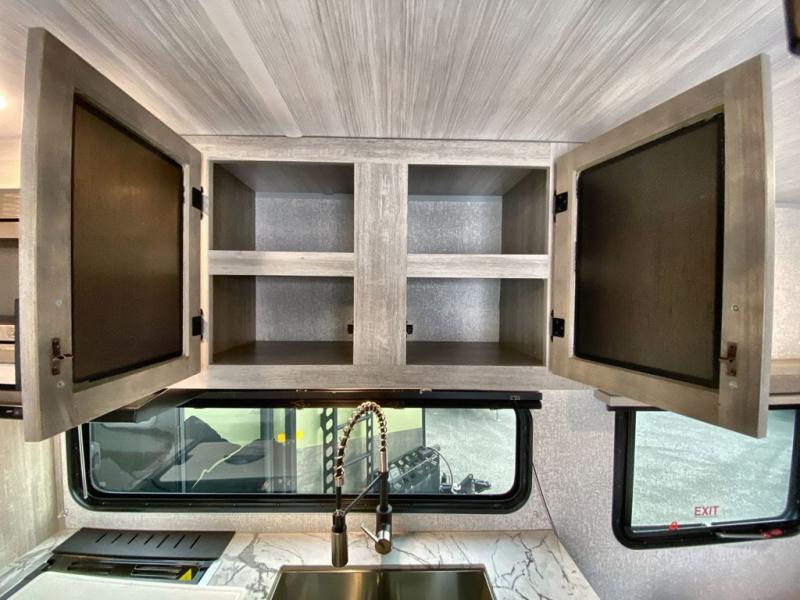 Pack up the family or make it a friends trip in this roomy travel trailer. Once you arrive at the campground, unload the pass-through storage, set up the 18' power awning with LED lights, and start lunch on the pull-out grill. You'll find a three burner cooktop and microwave oven indoors if the weather isn't cooperating, and you can dine at the booth dinette that includes under-dinette storage. You will love the versatility the queen Murphy bed adds by allowing you to relax on the sofa during they day, and sleep on the bed at night. And don't overlook the double-size bunks that will be a big hit with the little ones!