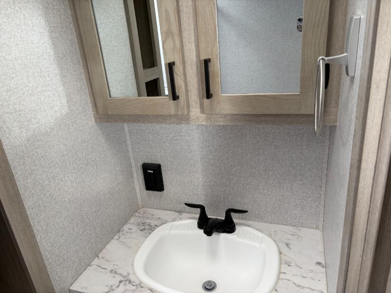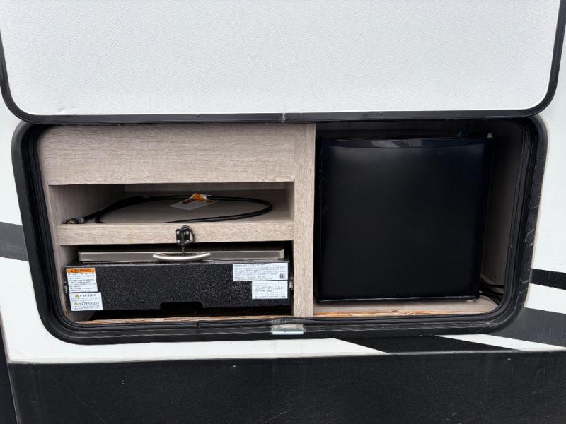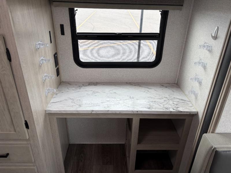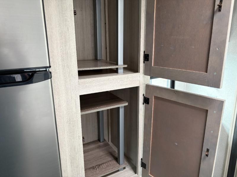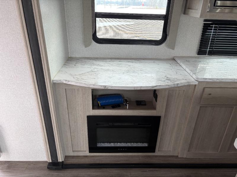 How does a king bed, a kitchen island, and an outdoor kitchen sound? You'll get all that and more in this spacious travel trailer. The dual opposing slides opens up the whole trailer, and the desk in the back will allow you to work while you're away from home. A three burner cooktop and microwave oven comes standard indoors, along with plenty of counter space and a pantry for snacks. Head outdoors to find the outside kitchen under the 21' power awning with LED lights, and when you're ready for bed the king bed will be waiting for you!