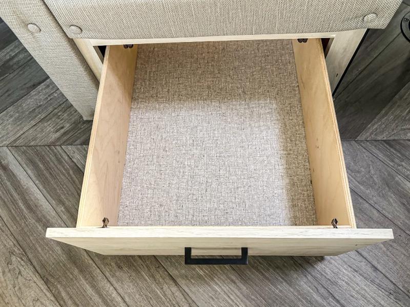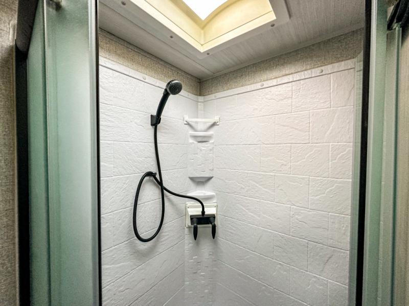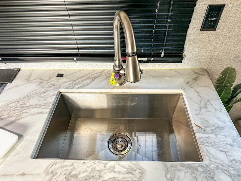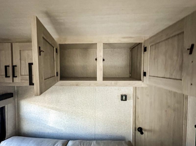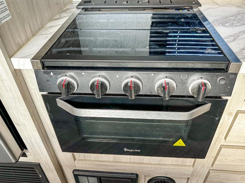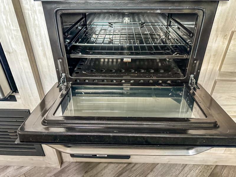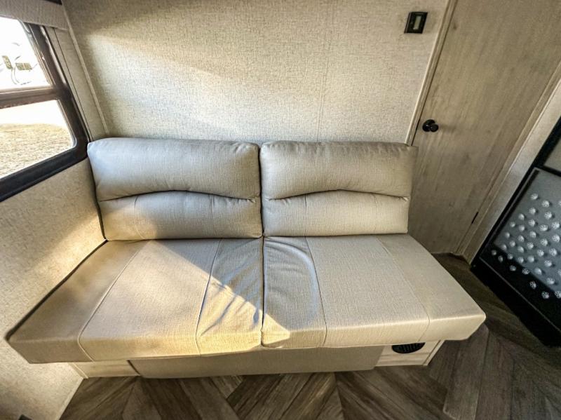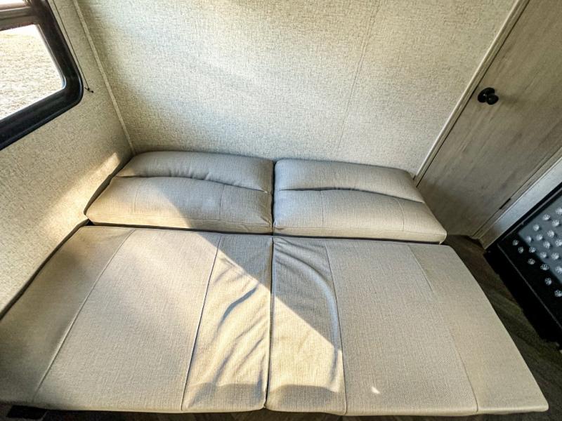 Whether you are a couple or family, this trailer allows you your own privacy in either the front bedroom or the rear bathroom. The king-size bed offers a comfortable nights sleep with plenty of room, and there are dual wardrobes and an overhead cabinet for your belongings. The spacious rear bathroom provides a radius shower, linen storage and a countertop with sink to place your toiletries. The cook will have full kitchen amenities to whip up meals, and four can dine at the booth dinette and three at the jack knife sofa while some might enjoy eating outside under the awning.