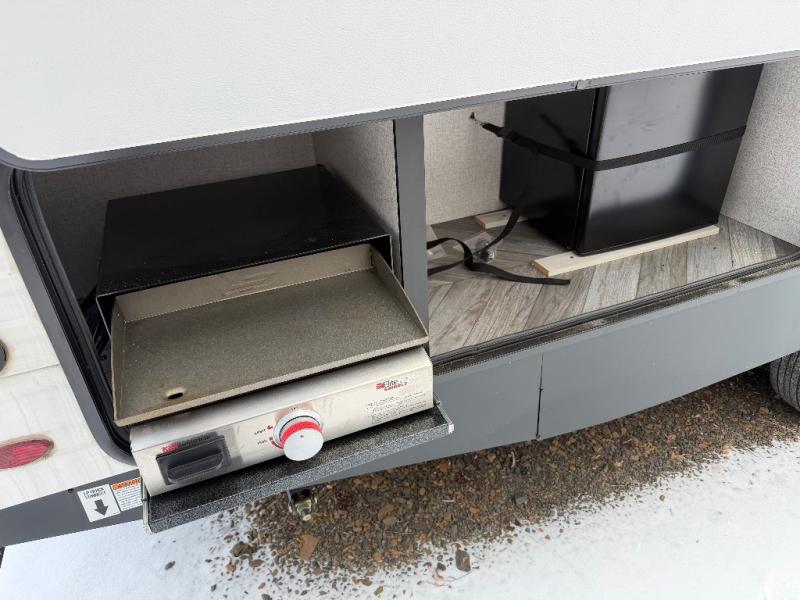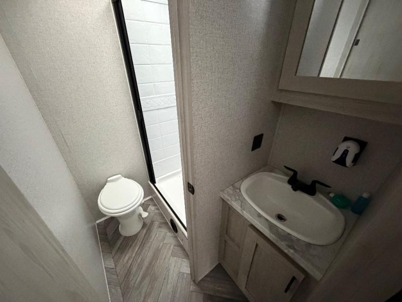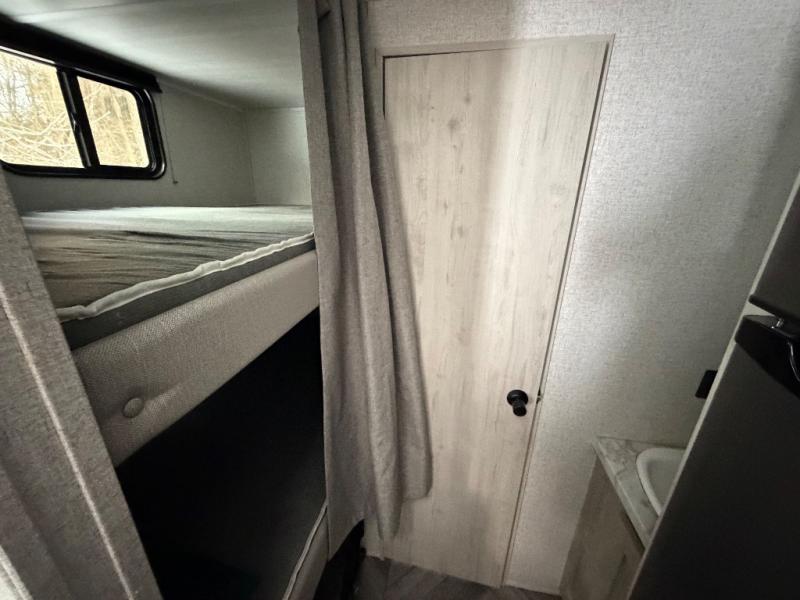 Calling all families that enjoy camping! This trailer makes it even sweeter since it sleeps eight to ten when you utilize the beds and the furnishings as sleeping space. The owners will have their own privacy in the front bedroom and be able to sleep like a king, while the others will have double-size bunks, a booth dinette and a jack knife sofa to choose from. You will find storage throughout including underneath the king-size bed and the furniture. The cook will enjoy the galley kitchen amenities and there is an optional outside kitchen with fridge and pull-out griddle if they want more choices. And everyone can stay refreshed using the private shower/tub and toilet room with a bathroom sink just outside the door.