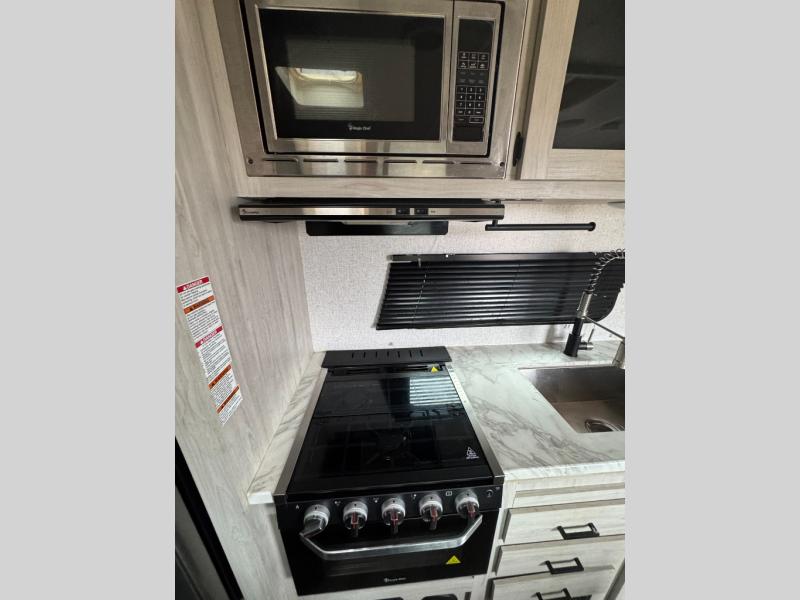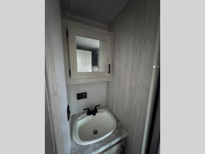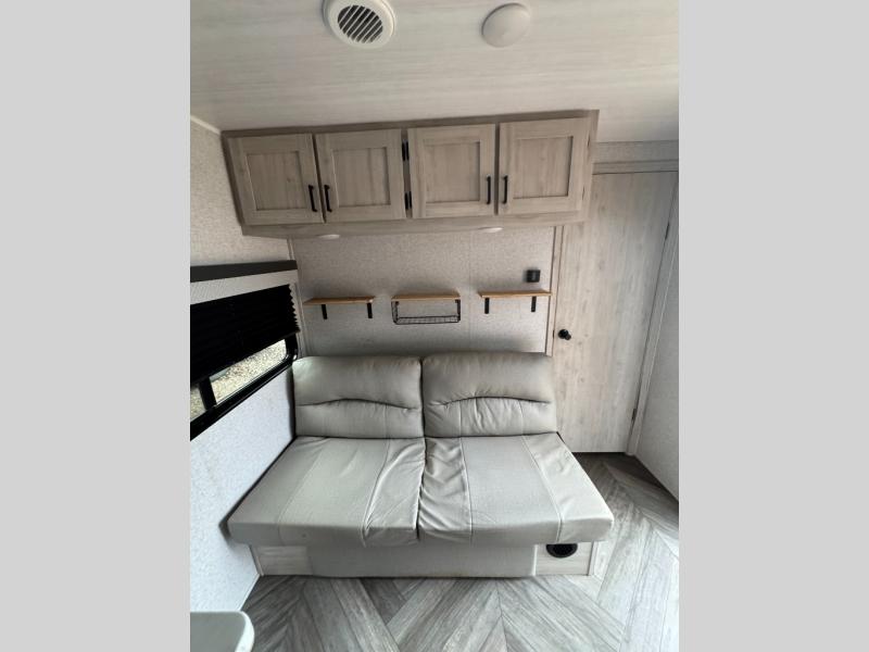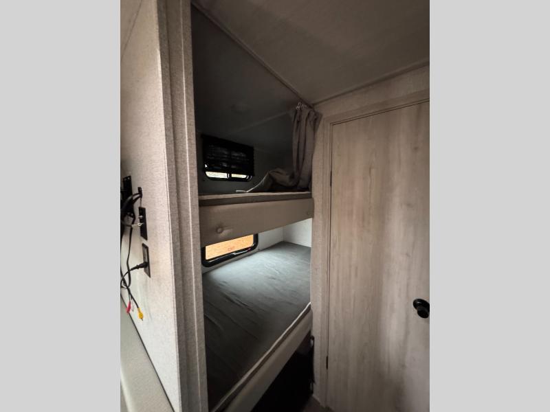 Calling all families that enjoy camping! This trailer makes it even sweeter since it sleeps eight to ten when you utilize the beds and the furnishings as sleeping space. The owners will have their own privacy in the front bedroom and be able to sleep like a king, while the others will have double-size bunks, a booth dinette and a jack knife sofa to choose from. You will find storage throughout including underneath the king-size bed and the furniture. The cook will enjoy the galley kitchen amenities and there is an optional outside kitchen with fridge and pull-out griddle if they want more choices. And everyone can stay refreshed using the private shower/tub and toilet room with a bathroom sink just outside the door.