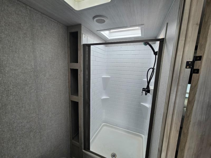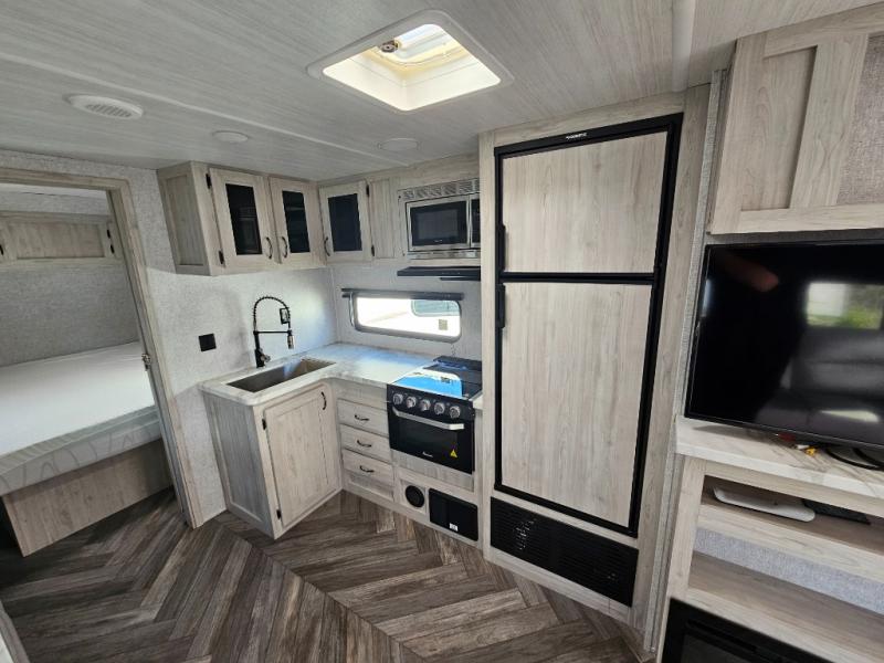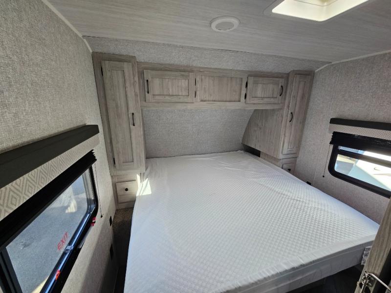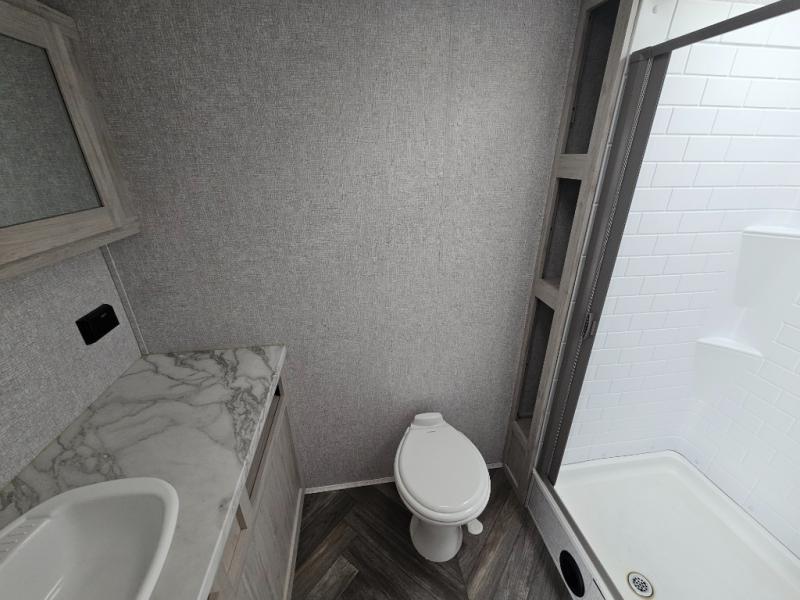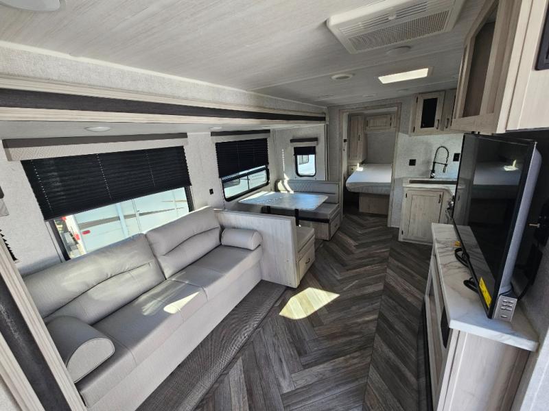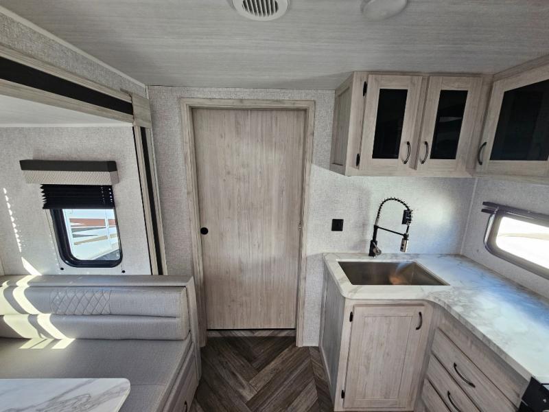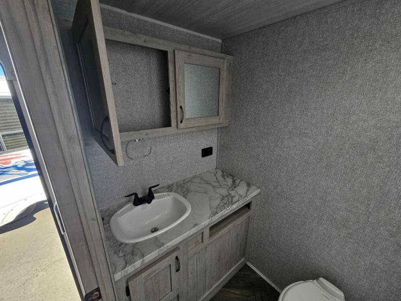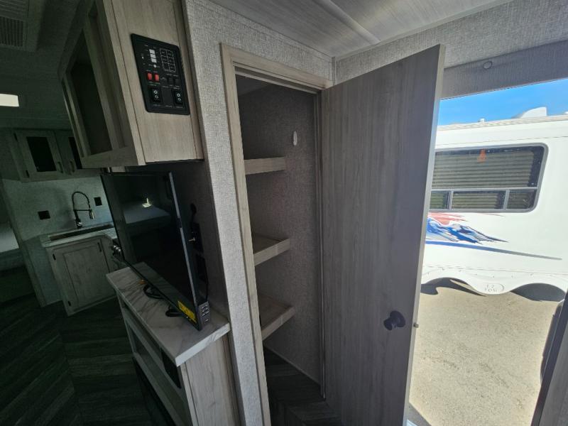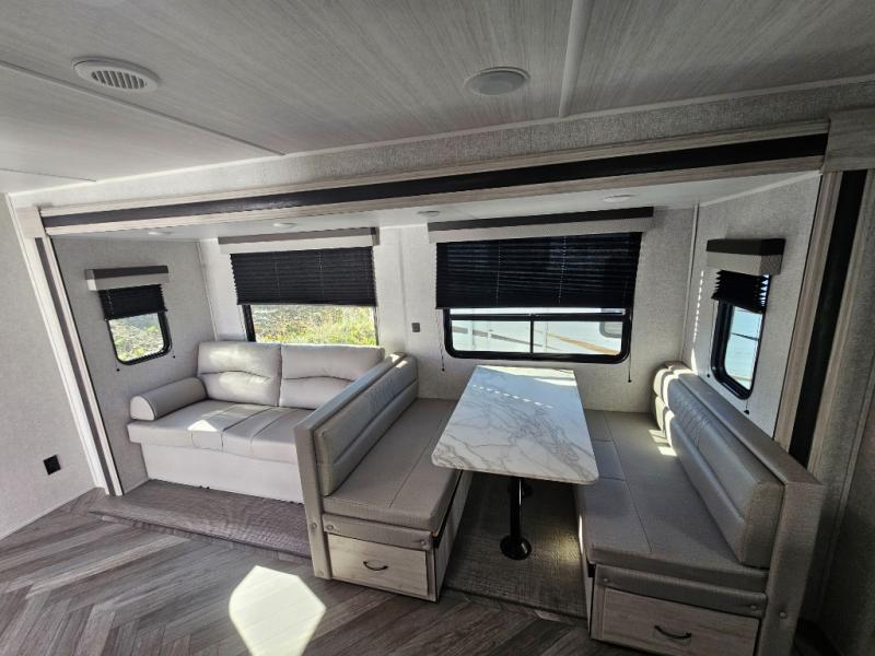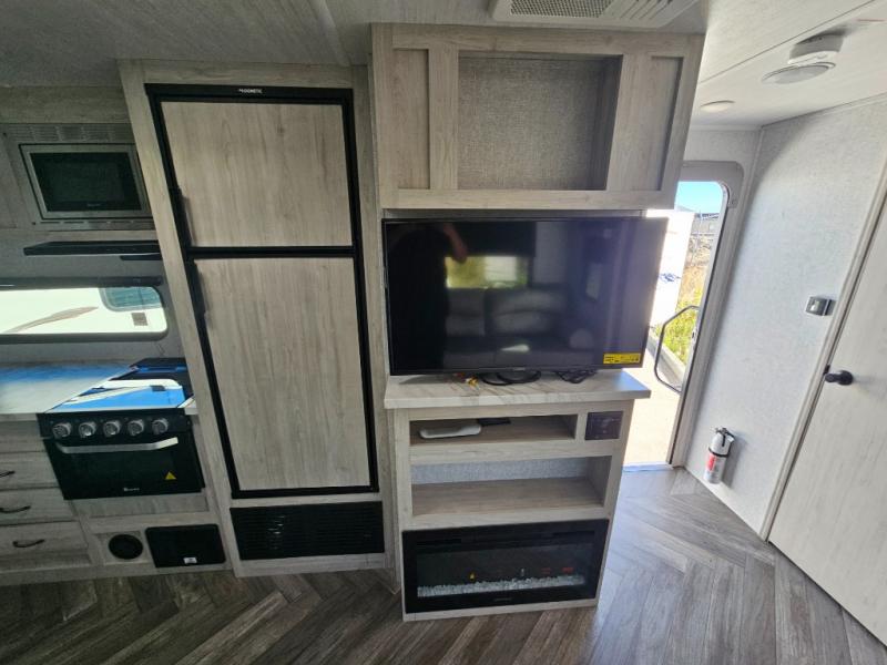 When you are wanting a little more interior space in your next travel trailer, take a look inside! This large slide out widens the center so you can easily make meals using full amenities without having to move for someone walking from the front private bedroom to the rear spacious bathroom. There is a king-size bed with storage on both sides, underneath and above, plus a space saving sliding door. The oversized booth dinette and jack knife sofa offer comfortable seating as well as extra sleeping space for overnight guests. And the fireplace is just a nice feature to enjoy. And the large pantry is a convenient feature you will surely appreciate. There is so much more!