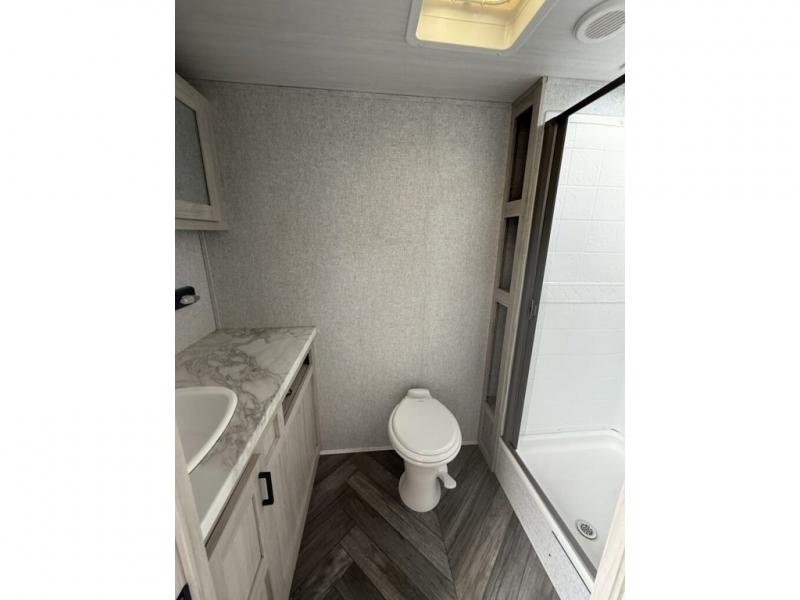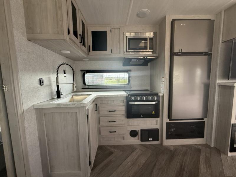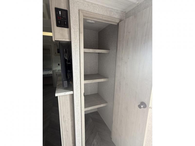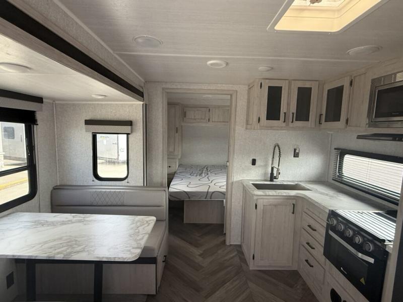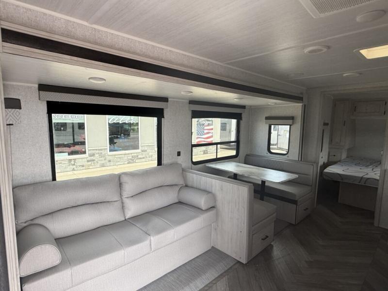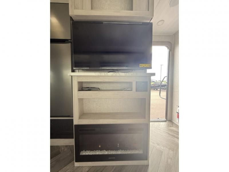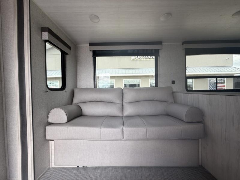 When you are wanting a little more interior space in your next travel trailer, take a look inside! This large slide out widens the center so you can easily make meals using full amenities without having to move for someone walking from the front private bedroom to the rear spacious bathroom. There is a king-size bed with storage on both sides, underneath and above, plus a space saving sliding door. The oversized booth dinette and jack knife sofa offer comfortable seating as well as extra sleeping space for overnight guests. And the fireplace is just a nice feature to enjoy. And the large pantry is a convenient feature you will surely appreciate. There is so much more!