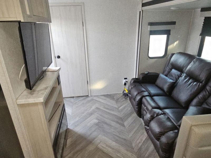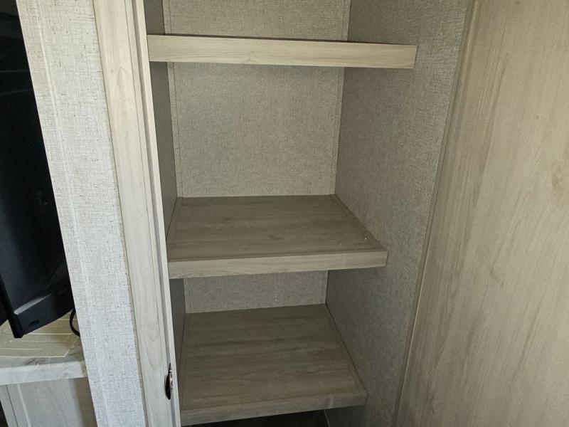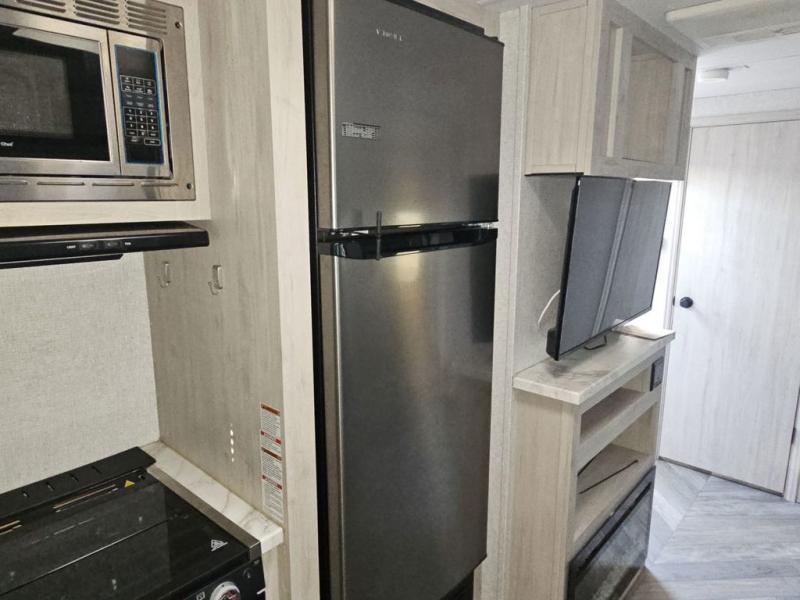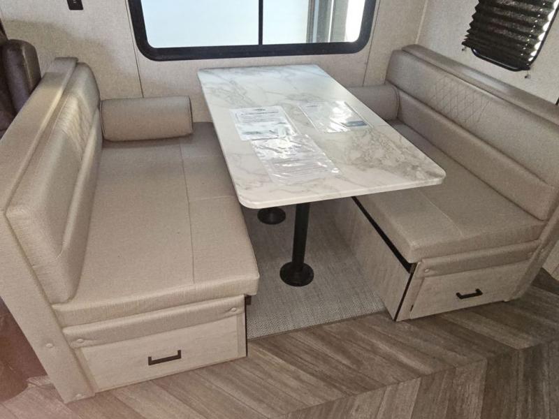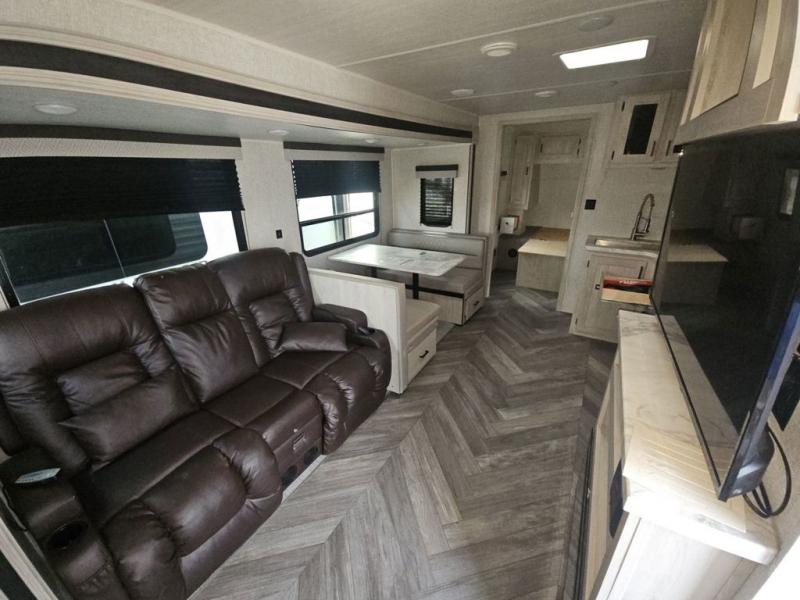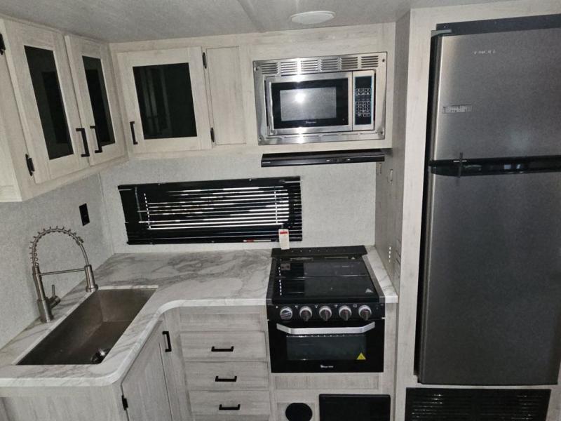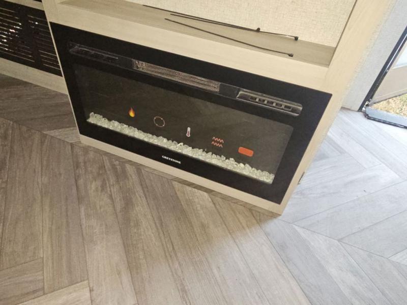 When you are wanting a little more interior space in your next travel trailer, take a look inside! This large slide out widens the center so you can easily make meals using full amenities without having to move for someone walking from the front private bedroom to the rear spacious bathroom. There is a king-size bed with storage on both sides, underneath and above, plus a space saving sliding door. The oversized booth dinette and jack knife sofa offer comfortable seating as well as extra sleeping space for overnight guests. And the fireplace is just a nice feature to enjoy. And the large pantry is a convenient feature you will surely appreciate. There is so much more!